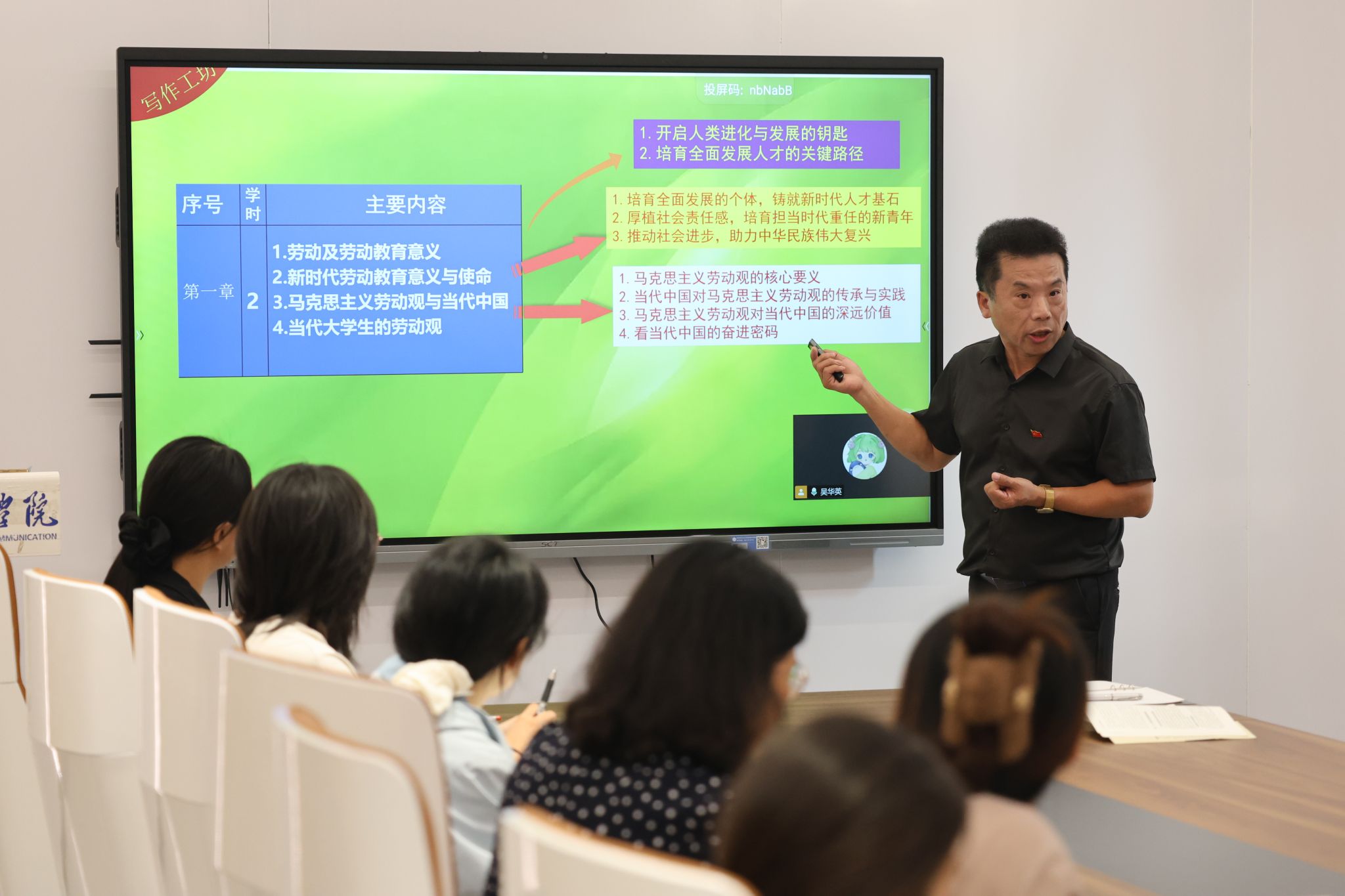 为实现教学过程的规范化与专业化,书院部创新采用“集体备课+分组研讨”的师资培养机制。39名教师分为4个课程小组,分章节开展教学设计与资源开发。本次研讨会由第一备课小组代表王恒绩老师进行首期试讲,王老师结合自身丰富的教学经验,重点分享了课堂提问的技巧与方法,通过具体案例展示了如何通过有效设问激发学生思考、深化课堂互动,为提升教学实效提供了可操作的路径。校督导刘秀伦老师(马克思主义学院)就教学案例的选取、理论讲授的深度以及与实践环节的衔接等方面提出了具体建议,强调应注重将劳动价值观念以更生动、更贴近学生生活的方式融入教学,为优化课程教学设计、提升整体教学质量注入了专业动能。