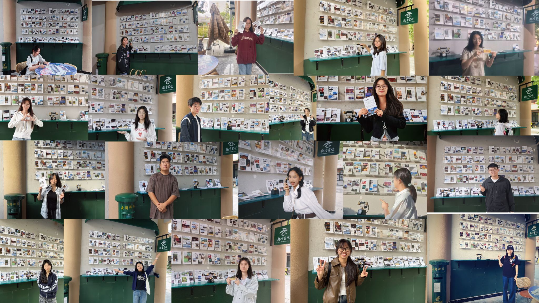 随着作品整理完成,观云书院将这些承载地域记忆的素材转化为可触摸的文化场景——“云游驿站”正式亮相。驿站内,优质投稿被制成明信片,通过展架分区陈列;绿色灯箱搭配复古邮件信箱,营造出兼具地域温情与驿站特色的沉浸式氛围。驿站开放后,迅速吸引同学们纷纷前来打卡:有人手持家乡明信片与展架合影,定格与故土的联结;有人驻足细读作品旁的历史简介与个人感悟,探寻陌生地域的文化故事。