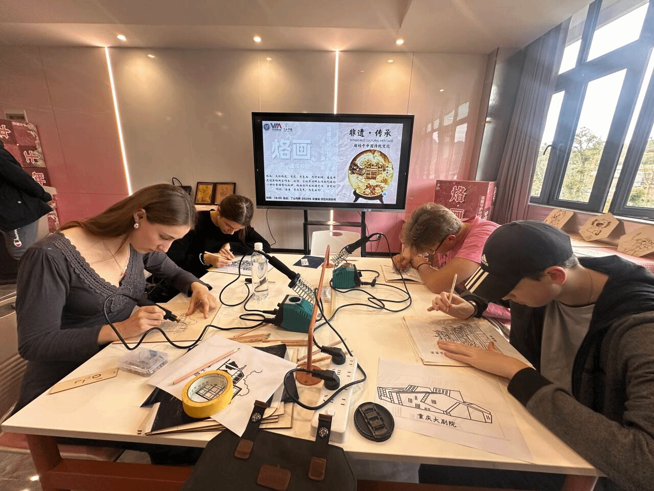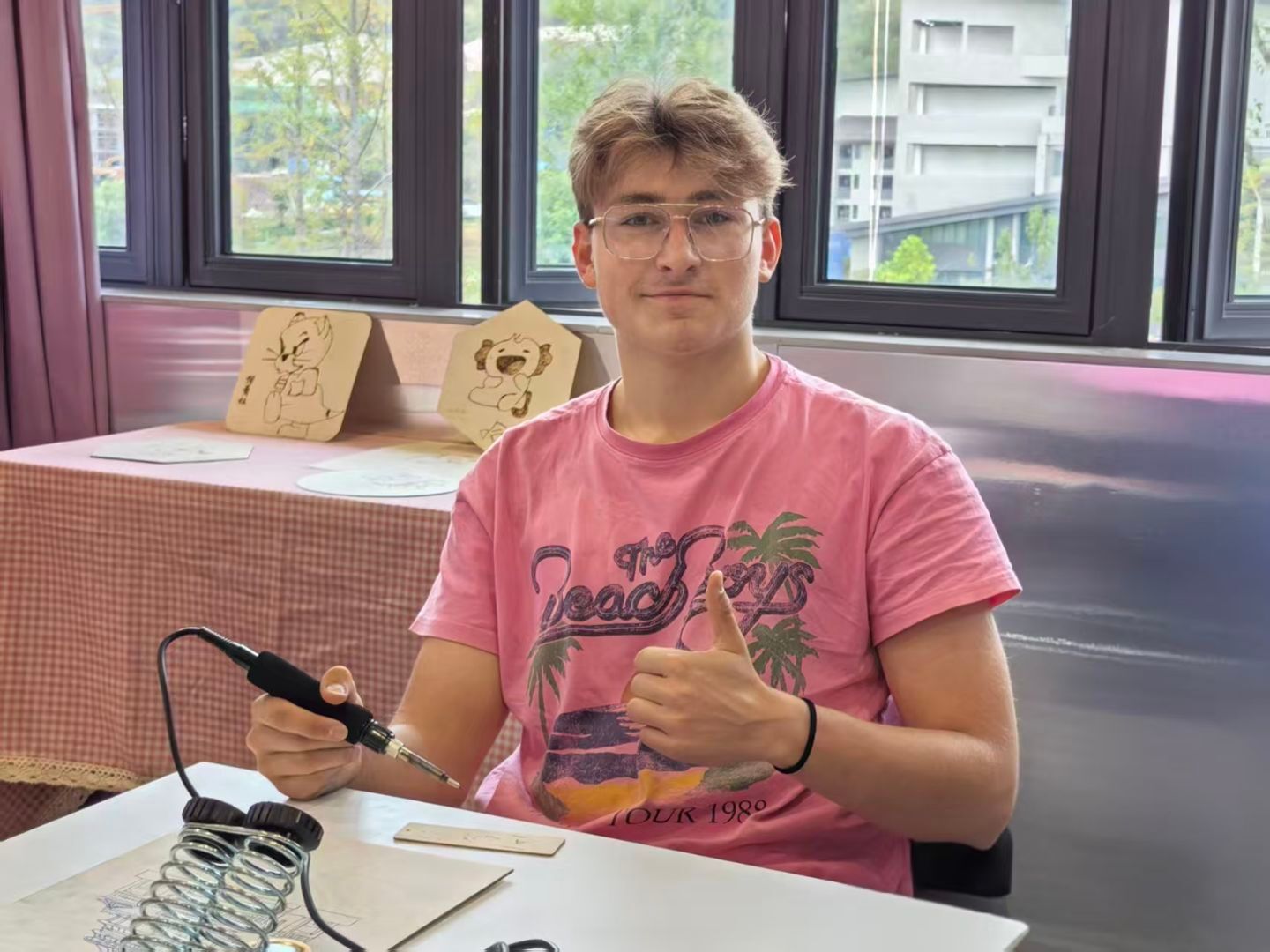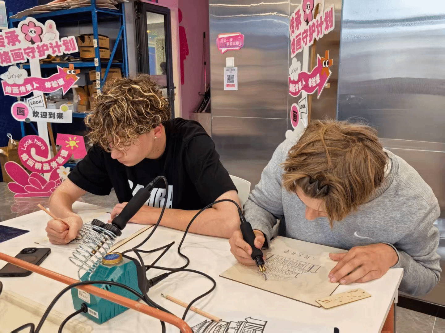 本期活动迎来了一群特殊的参与者——来自德国游学团的同学;初见烙笔便被这“用温度创作”的艺术吸引,他们与书院学子共同执笔进行烙画创作。随着焦褐色线条蔓延,东溪古镇太平桥的拱券渐显弧度,桥面的石板纹理愈发清晰,连桥边垂落的藤蔓,都在烙痕的深浅变化中凸显出来,“Amazing!”Franz忍不住发出惊呼。这一刻,烙铁不再是简单的工具,而是化作了一座文化的桥梁,世界青年因对美的共同追求而并肩创作,这正是文明交流中最动人的画面。