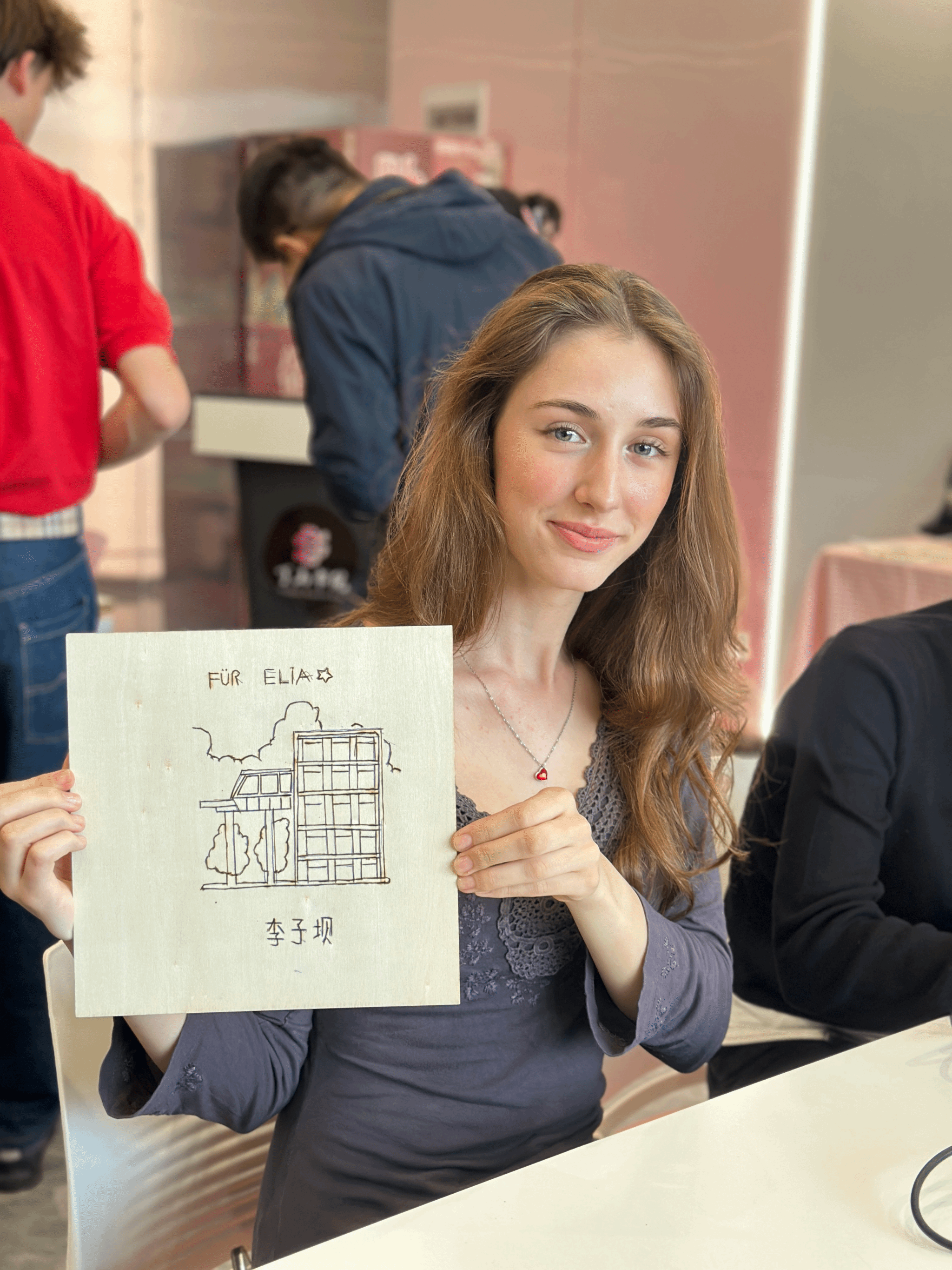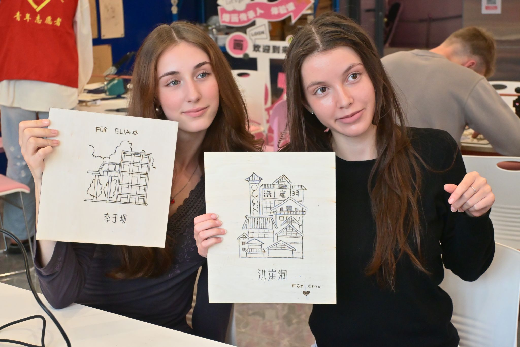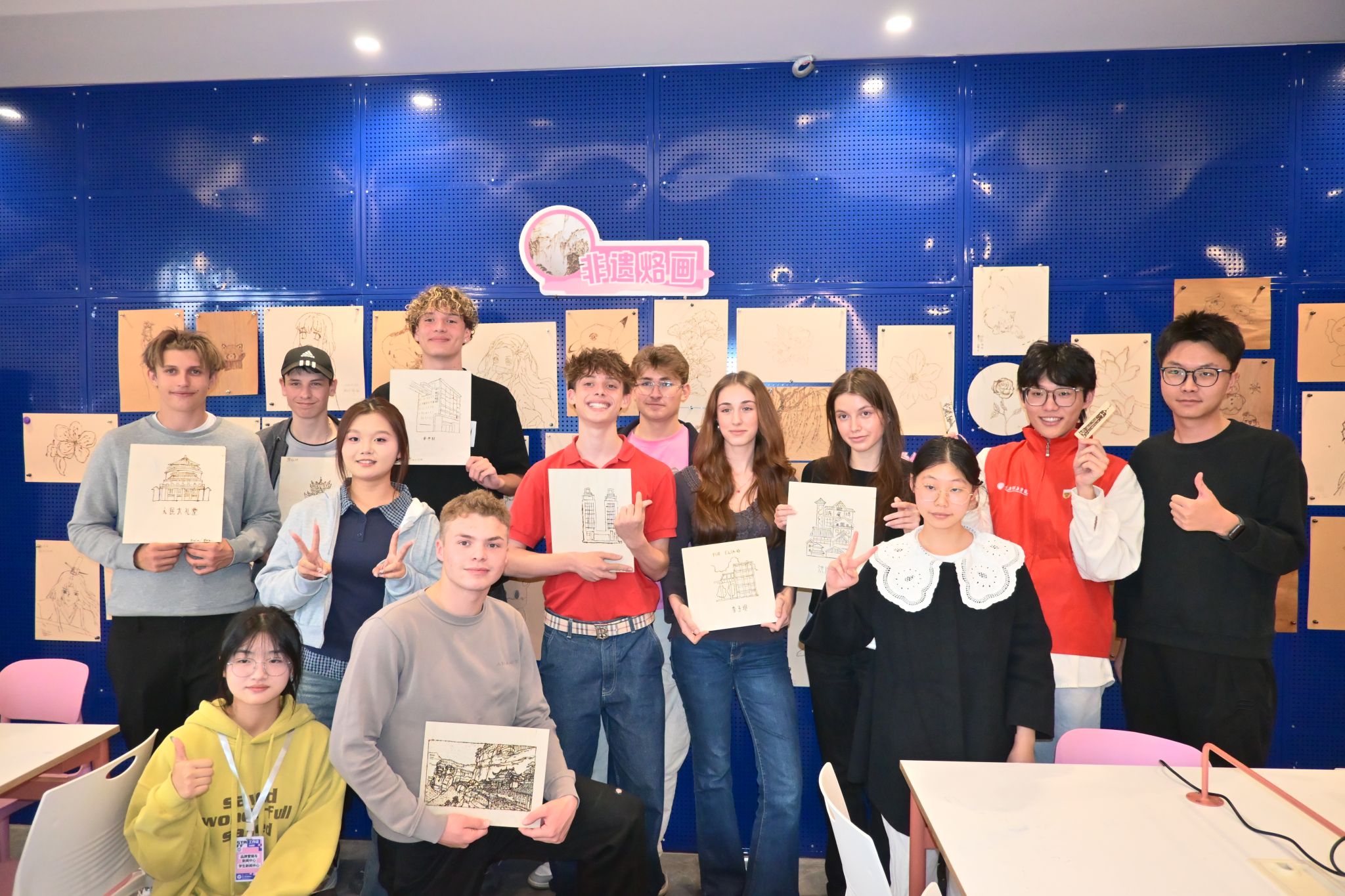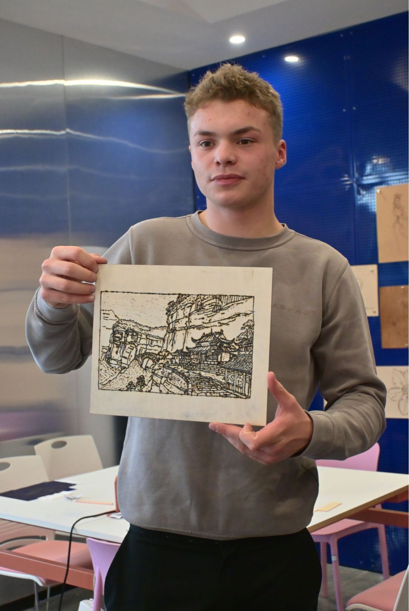 本期活动迎来了一群特殊的参与者——来自德国游学团的同学;初见烙笔便被这“用温度创作”的艺术吸引,他们与书院学子共同执笔进行烙画创作。随着焦褐色线条蔓延,东溪古镇太平桥的拱券渐显弧度,桥面的石板纹理愈发清晰,连桥边垂落的藤蔓,都在烙痕的深浅变化中凸显出来,“Amazing!”Franz忍不住发出惊呼。这一刻,烙铁不再是简单的工具,而是化作了一座文化的桥梁,世界青年因对美的共同追求而并肩创作,这正是文明交流中最动人的画面。