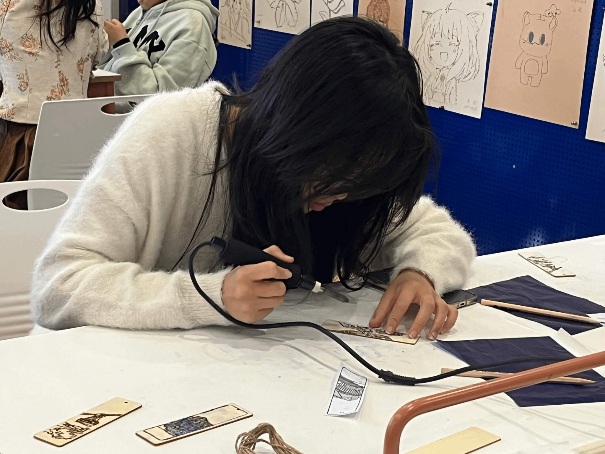 烙画铁笔的温度尚未落下,重庆早已等着成为最生动的创作底本。洪崖洞吊脚楼依山而建的错落之美、长江与嘉陵江交汇的壮阔之景、磁器口青石板路上的市井风情、川剧脸谱的艳丽纹路、重庆小面的热气腾腾,皆能以烙画之韵定格。铁笔游走间,温度把控里,一城的麻辣鲜香与江湖气息鲜活绽放。每一枚重庆书签烙画作品都别具特色,记录了同学们对重庆的独特发现。无论是解放碑商圈的繁华、老巷子里的斑驳砖墙,还是江边步道的晚风与灯光,都化作笔下的创作元素,成为一段段与山城相关的珍贵记忆。