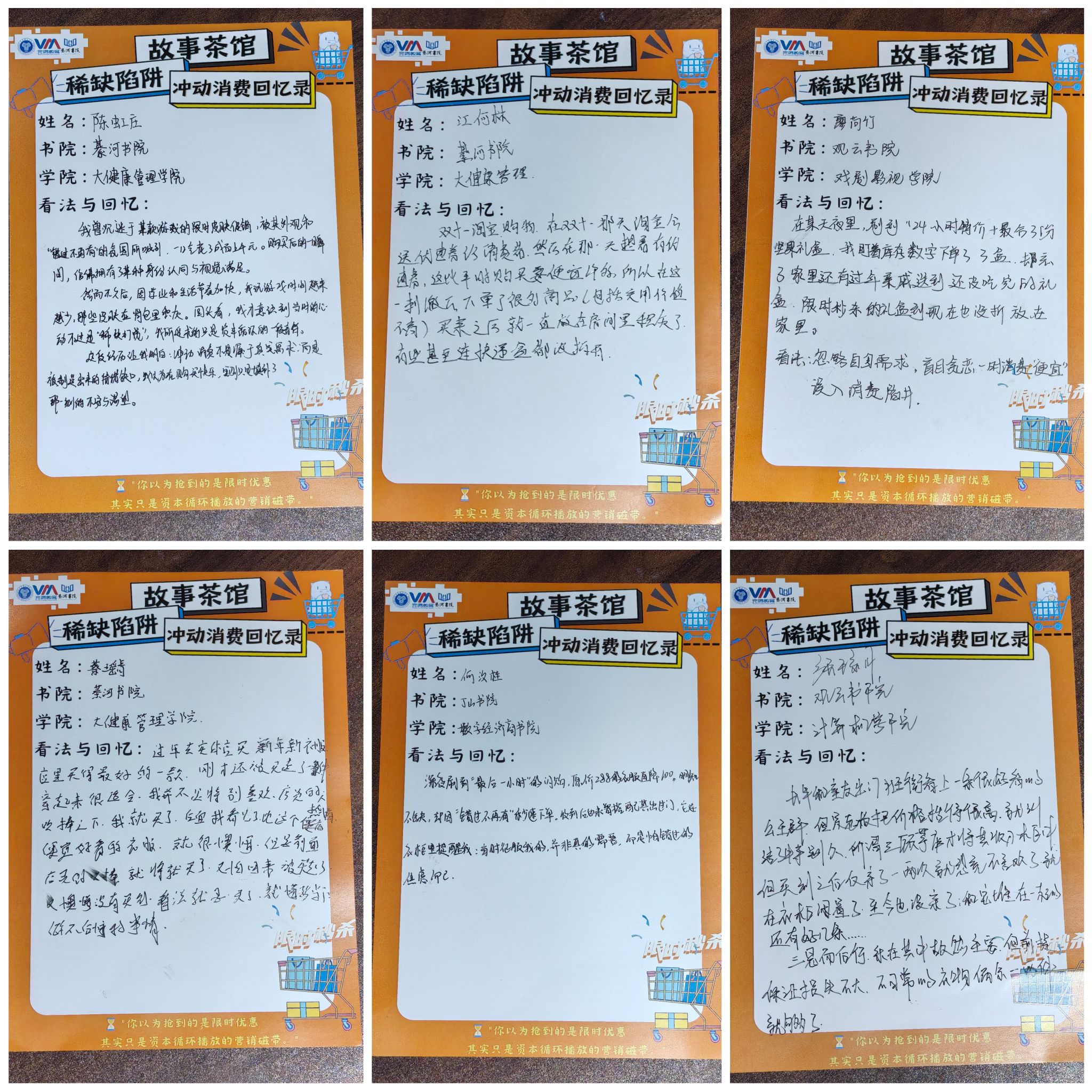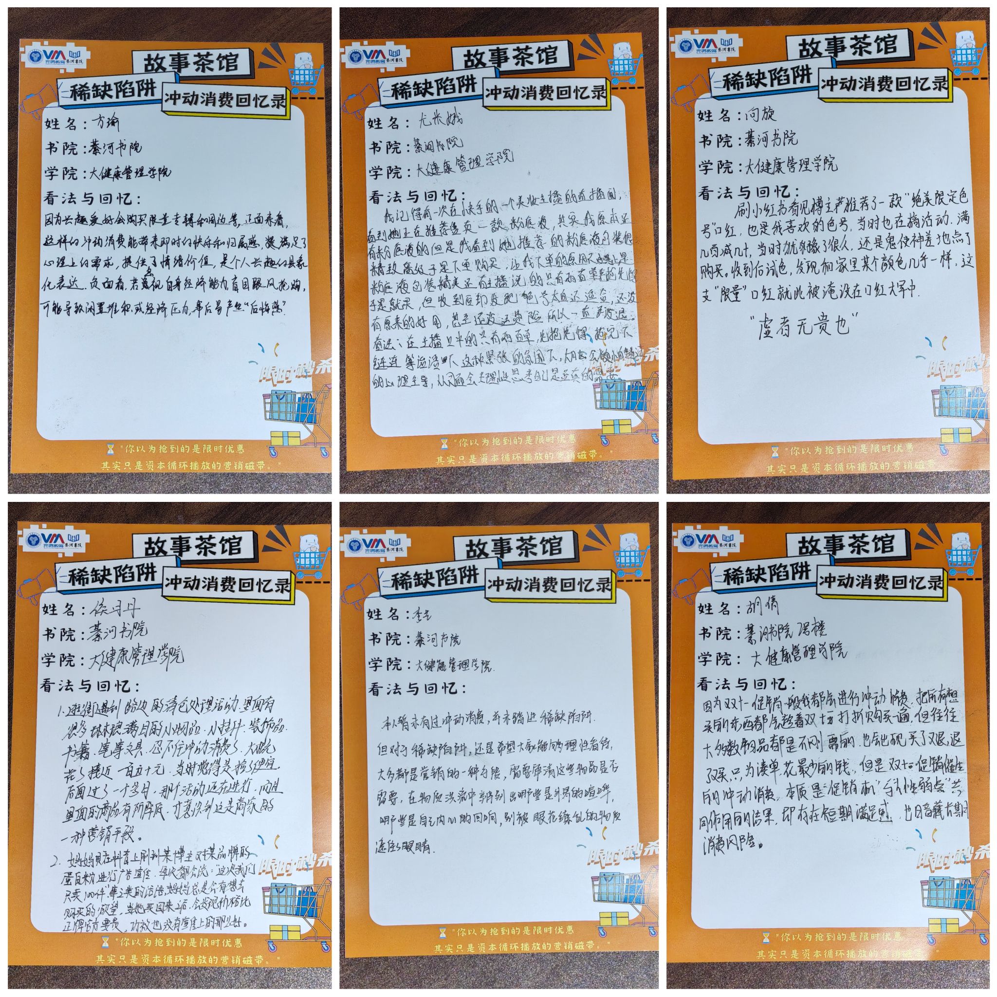 从多元视角审视故事、以多层次深度剖析故事,是构建生动故事的基础。随着笔尖在纸上缓缓停驻,同学们笔下的故事也仿佛有了落定的重量。信息安全学院綦河书院的蒋路同学娓娓道来:“我曾因游戏中所谓绝版皮肤的返场,而一时冲动进行了消费。”大健康管理学院綦河书院的邓军蓉同学也分享道:“我在直播间里,被主播‘最后几分钟,错过不再’的吆喝声所吸引,冲动之下买下商品,结果许久后那商品仍在售卖。”同学们真诚地讲述着自己的经历,也让我们再次深刻认识到“稀缺陷阱”所带来的深刻教训。