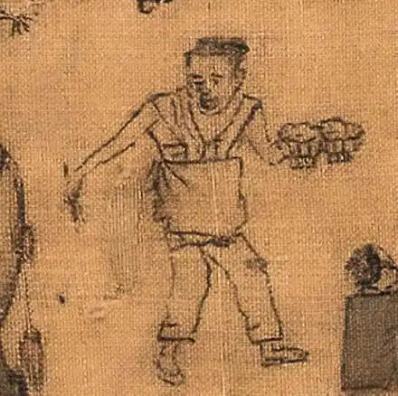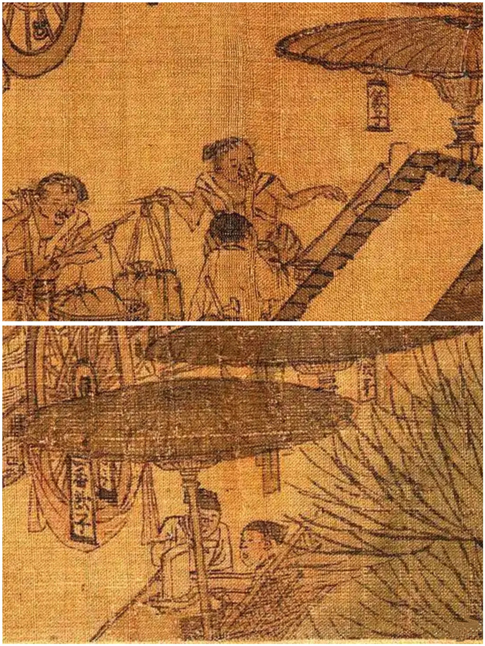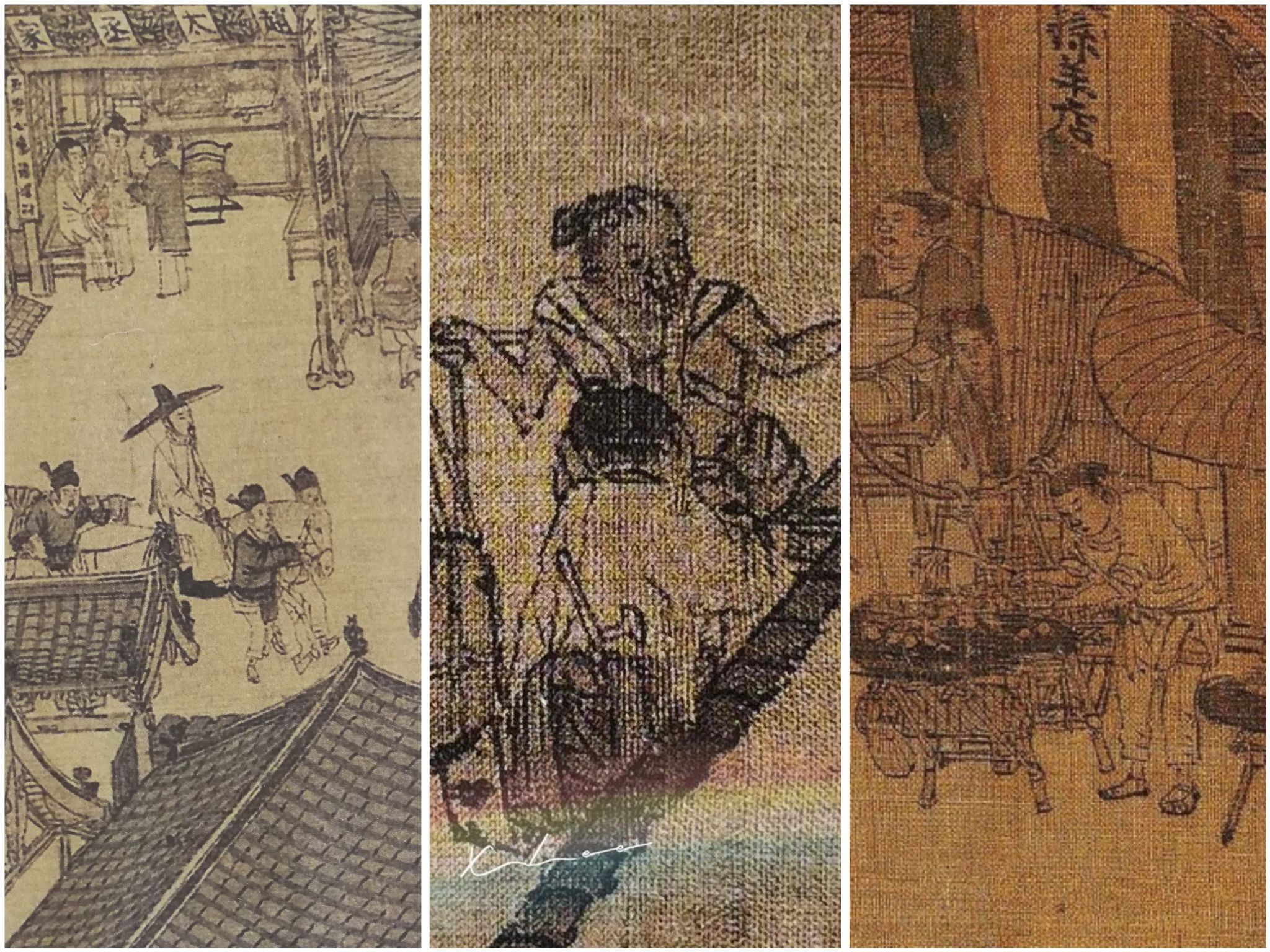 没事就喝香饮子:“饮子”就是我们今天说的饮料。这些饮料多数用草药煮成,两个刚放下担子光着胳膊的男人似乎在买饮料,这表明它们的价格应该不高,属于一种大众饮品,据《武林旧事》记载,南宋都城杭州所售饮料有十七种之多。