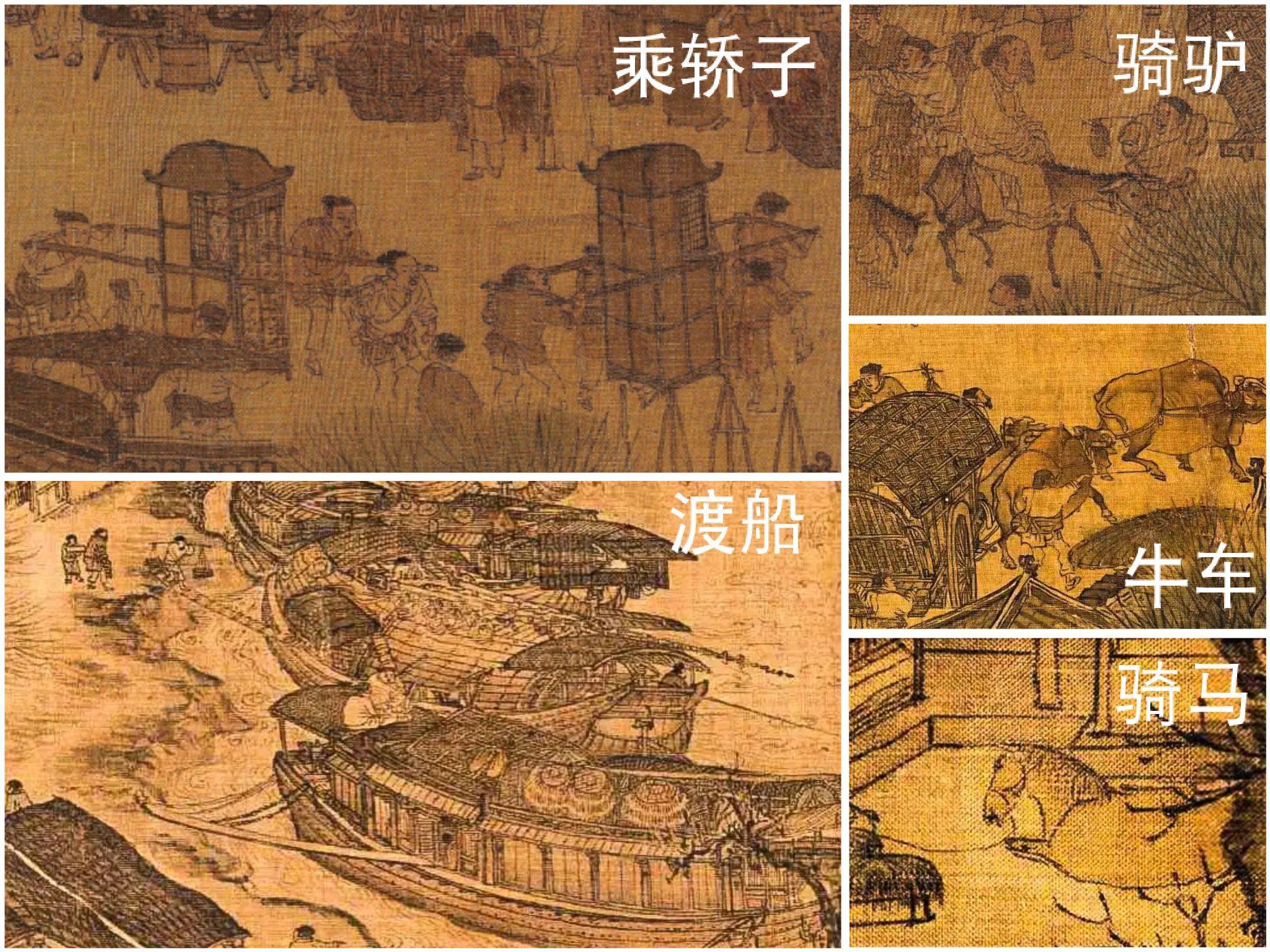 交通“鄙视链”:轿子彰显地位,牛车稳重大气,驴骡轻便经济,舟船连通水系。不同选择,精准对应着不同阶层和场景的需求,构成一幅流动的社会画卷。