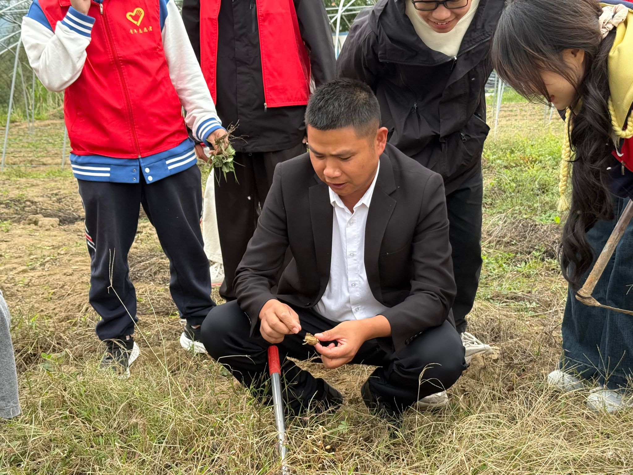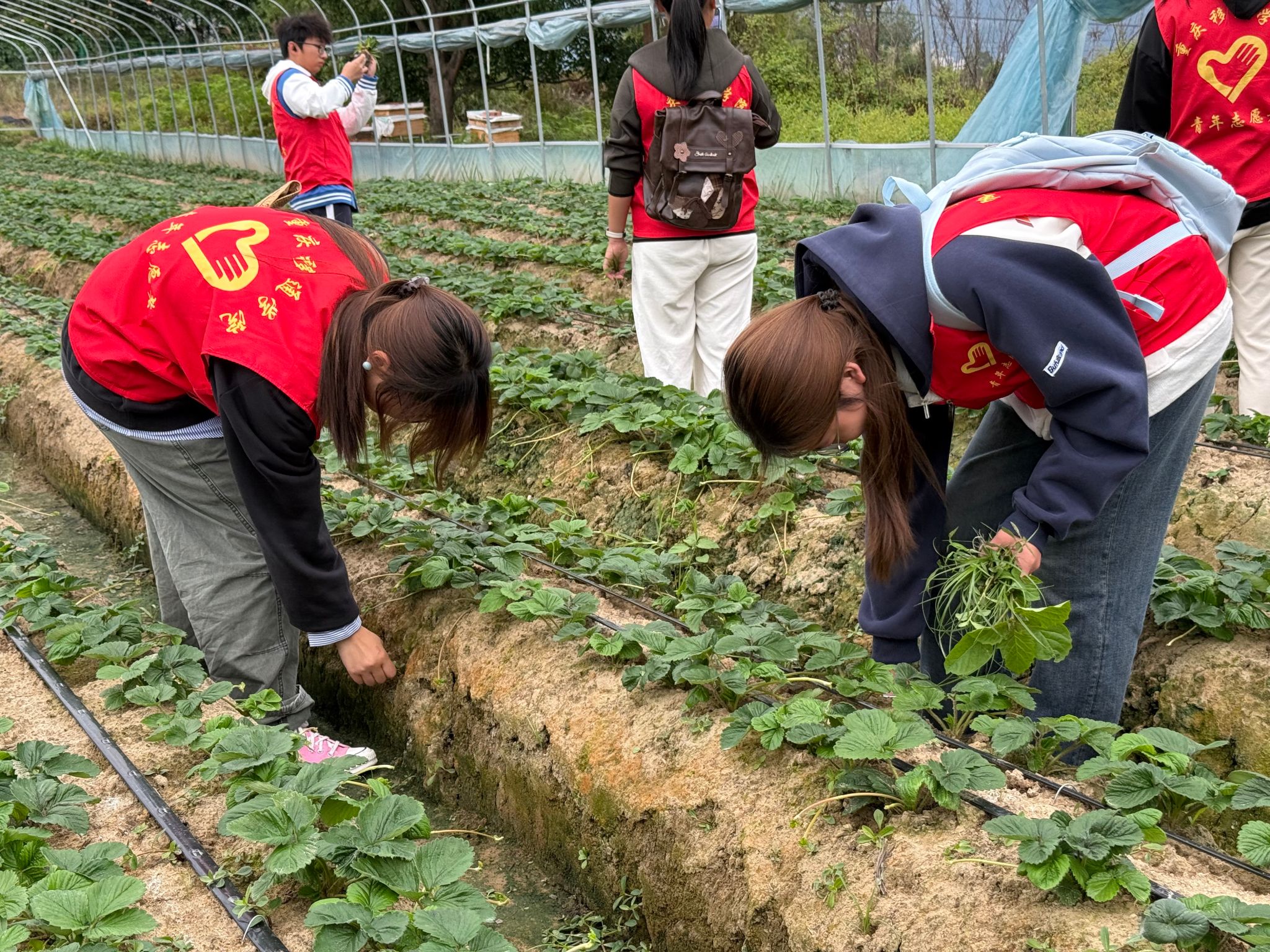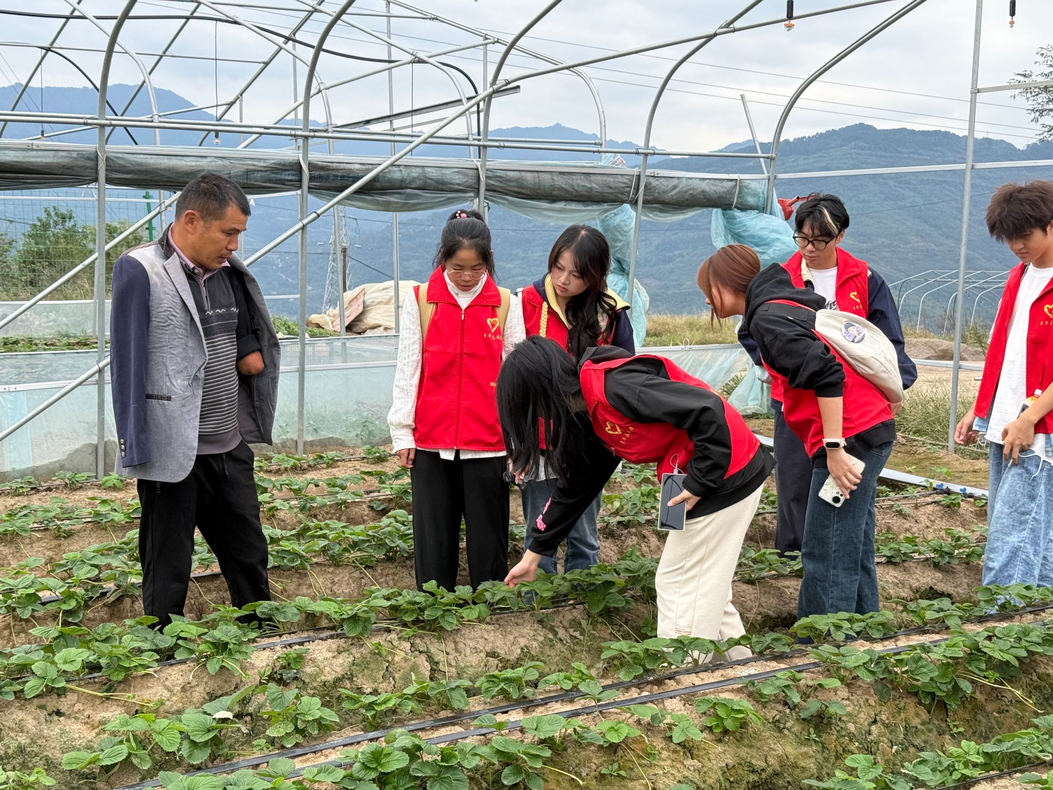 在林碧阳光草莓农场,支队开展了一堂特殊的“田间思政课”。农场创始人、身残志坚的桥坝村新农人陈林,他用脚拨起一片翠绿的草莓叶,将其作为最直观的教具,向同学们细致讲解草莓的生物学特性、不同生长阶段的叶片形态特征及其所反映的植株健康状况。同学们围绕在他身边,不仅学习了农业技能,更从他身上读懂了坚守土地、自强不息的精神品质——这正是“溪”望青年志愿支队精神中“励志笃行、服务为民”的鲜活体现。