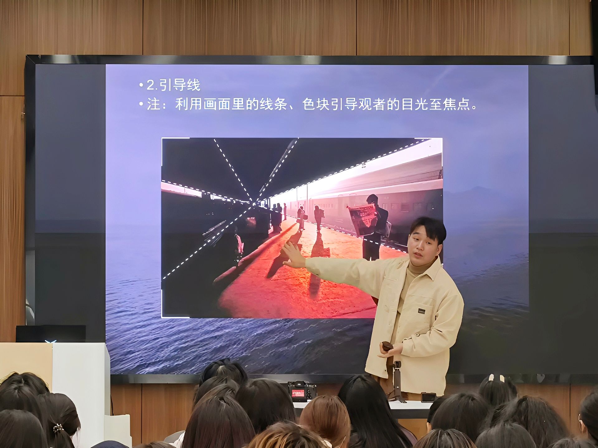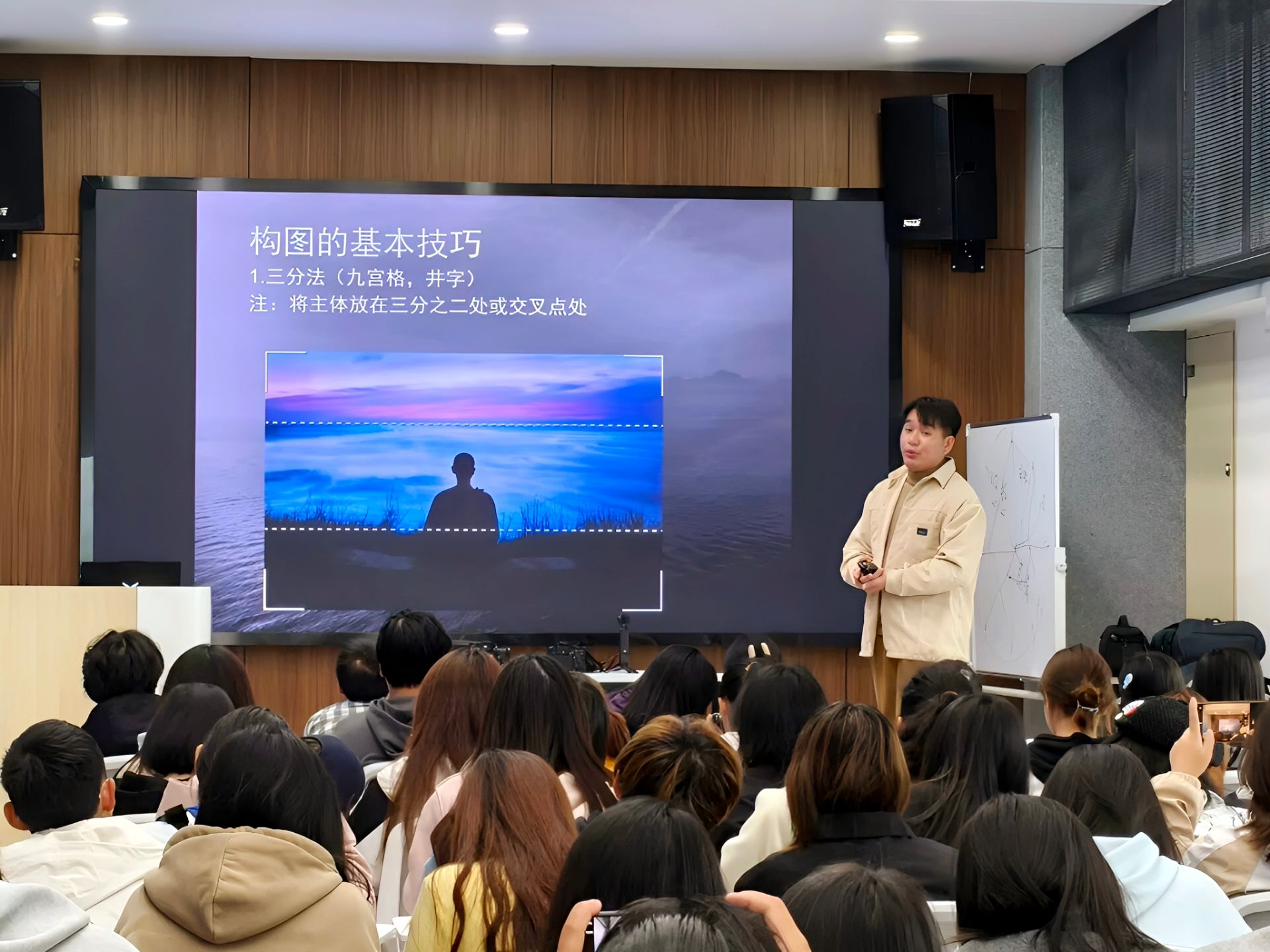 活动中,李鑫以摄影“三条基本原则”为切入点,通过案例拆解,让在场同学直观理解“主题鲜明”“注意力引向主体”“画面简洁”对优质照片的核心作用。随后,他针对摄影参数展开讲解,并现场演示参数搭配技巧,帮同学们轻松掌握“拍亮、拍清”的核心方法。 理论讲解后,活动进入实操环节。像素方庭工坊为同学们提供摄影设备,大家结合所学参数知识,选择拍摄对象——或聚焦书院现场景色,或捕捉同学互动瞬间。