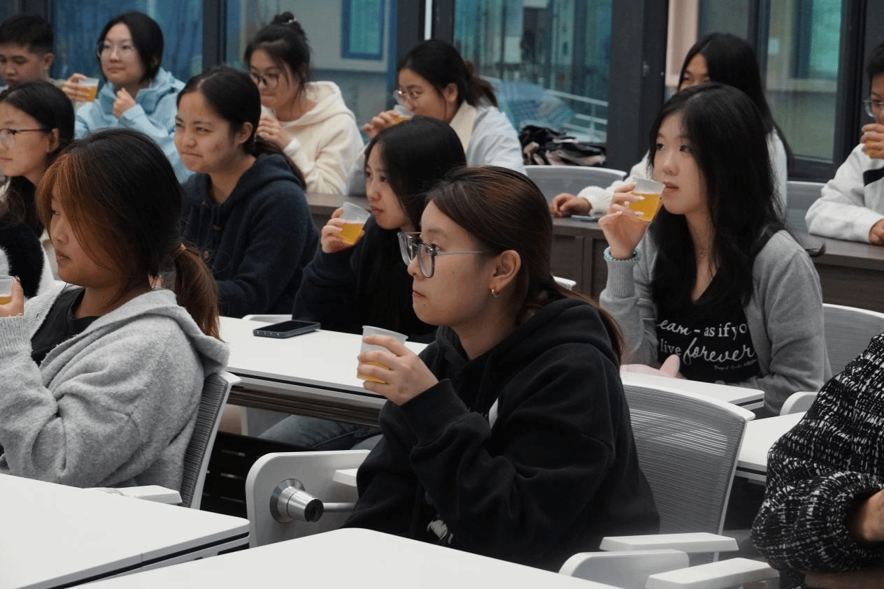 活动伊始,一段德国修道院啤酒起源的视频迅速抓住了大家的注意力,泛黄的画面与生动的解说,将众人带回千年之前的啤酒文化发源地。随后,主持人详细讲解了小麦啤、黑啤、白啤等德国经典啤酒种类的特点,以及不同啤酒与碱水包、黑麦面包等餐包的搭配秘诀,让在场师生对德国饮食搭配有了初步认知。
