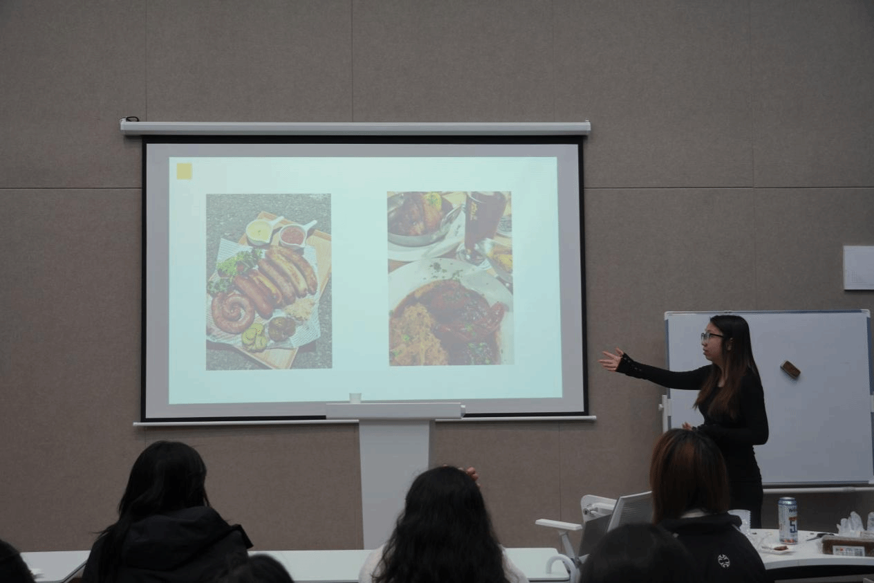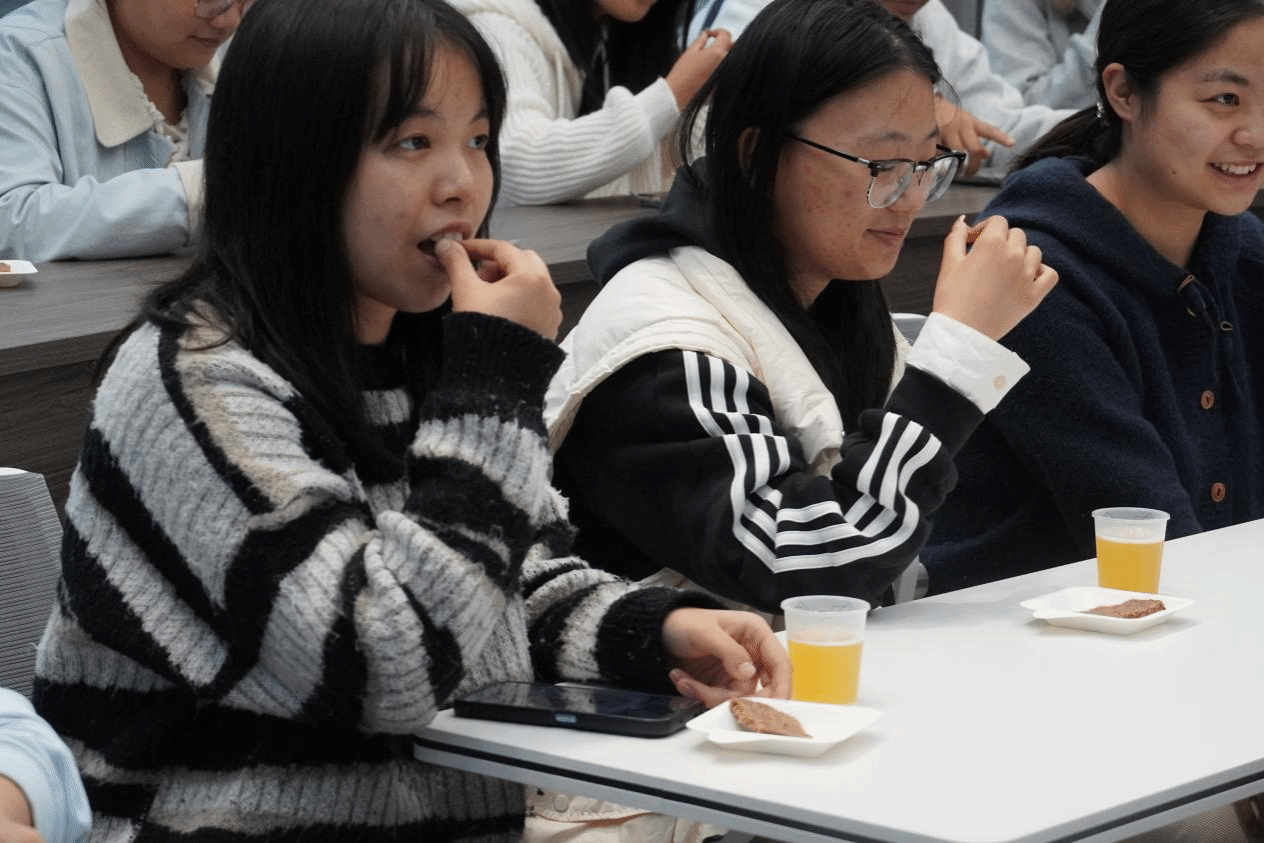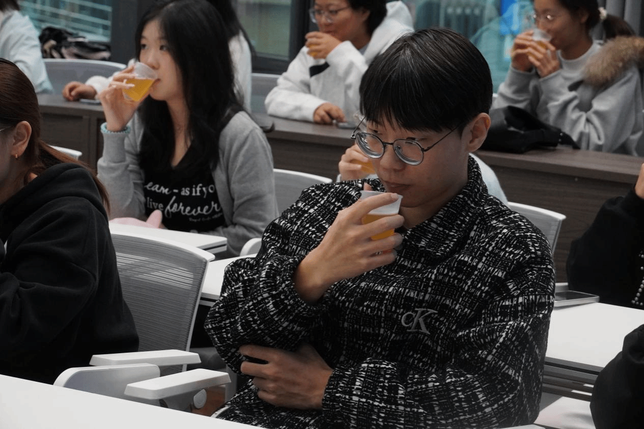 当杯中泛起细腻泡沫,师生们迫不及待地品尝起德国啤酒,“入口微苦后味甘甜”“有淡淡的香蕉香气”,大家纷纷分享着自己的味觉感受。紧接着,主持人深入解读了《德国啤酒纯净法》的历史渊源与修道院文化,阐述这些传统如何塑造了德国人严谨、注重品质的饮食习惯。香气扑鼻的德国肉肠切块登场后,活动氛围愈发热烈,主持人一边引导大家品尝,一边揭秘德国肉肠多达上千种的种类划分,以及啤酒与肉肠成为经典搭配的历史背景。