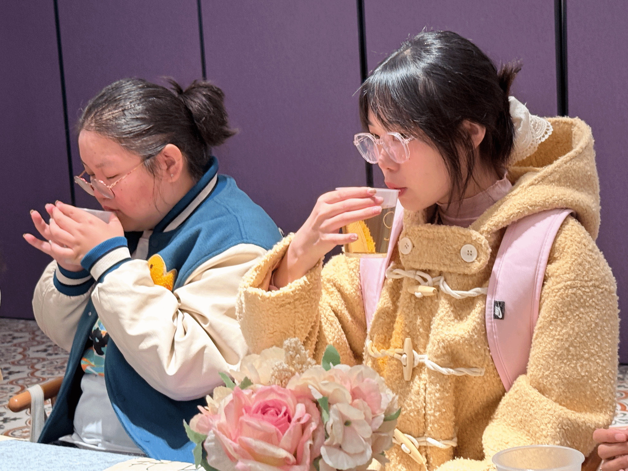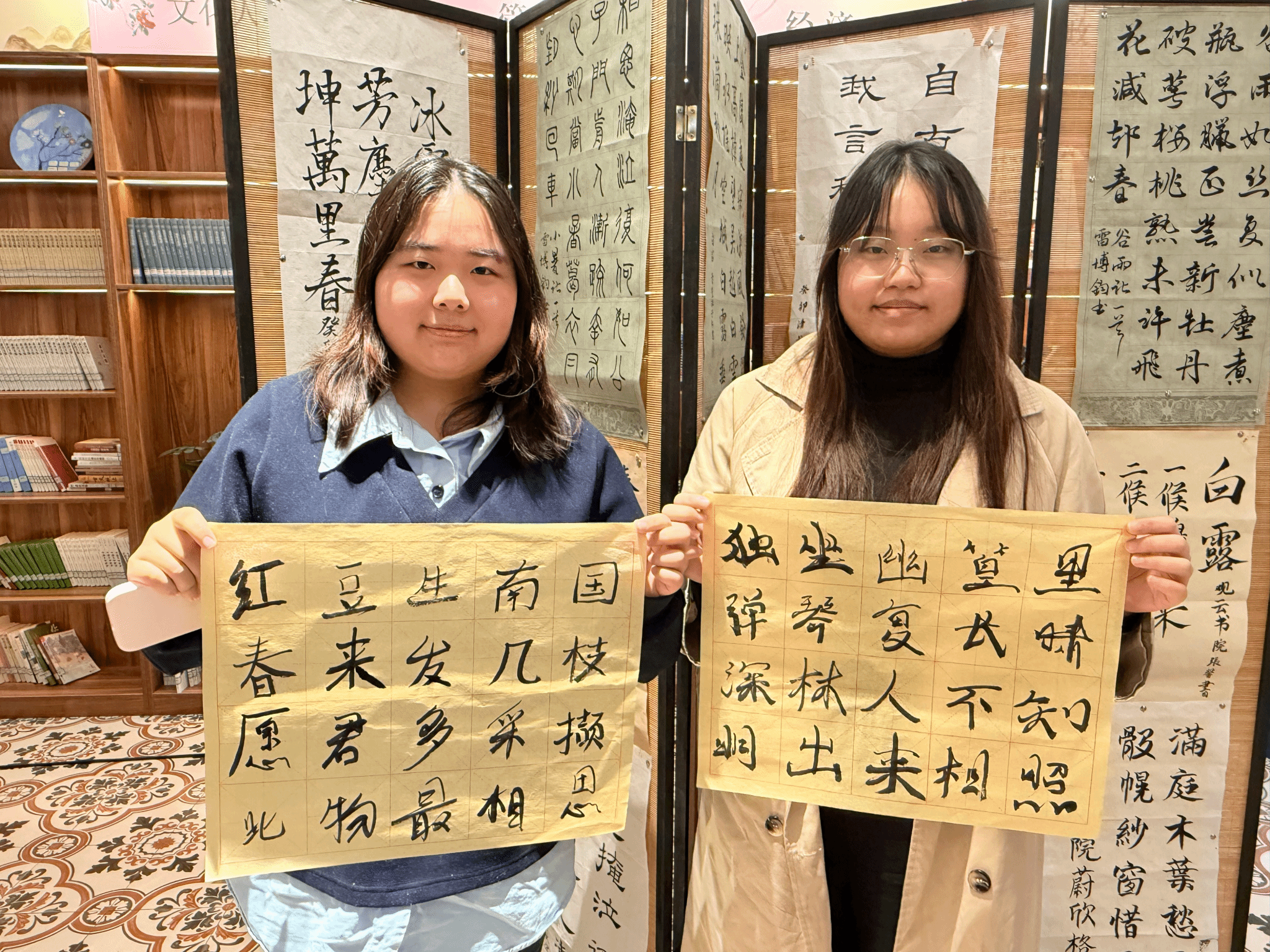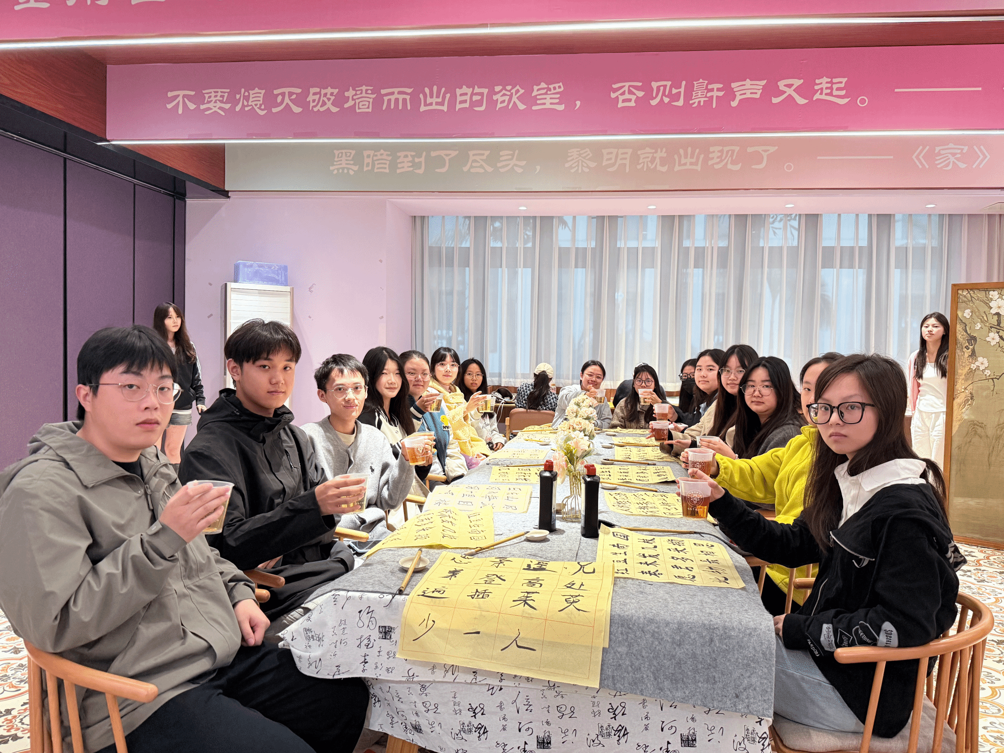 现场掌声迭起,在一来一往的诗词互动中,进行了茶水品鉴交流环节,将活动氛围推向另一重雅致境界。茶香袅袅中,同学们围坐品茗,分享创作灵感、吟奏心得与对王维诗词的全新理解。“原来在临摹写诗时,把自己代入王维隐居辋川的心境,更能体会到“行到水穷处,坐看云起时”的豁达。一位参与者在交流中感慨道。另一位同学则结合茶的清冽,解读出王维诗中“清寂”美学的当代价值。在茶香与思想的交融中,大家对传统文化的认知不断深化,同窗情谊也愈发浓厚。