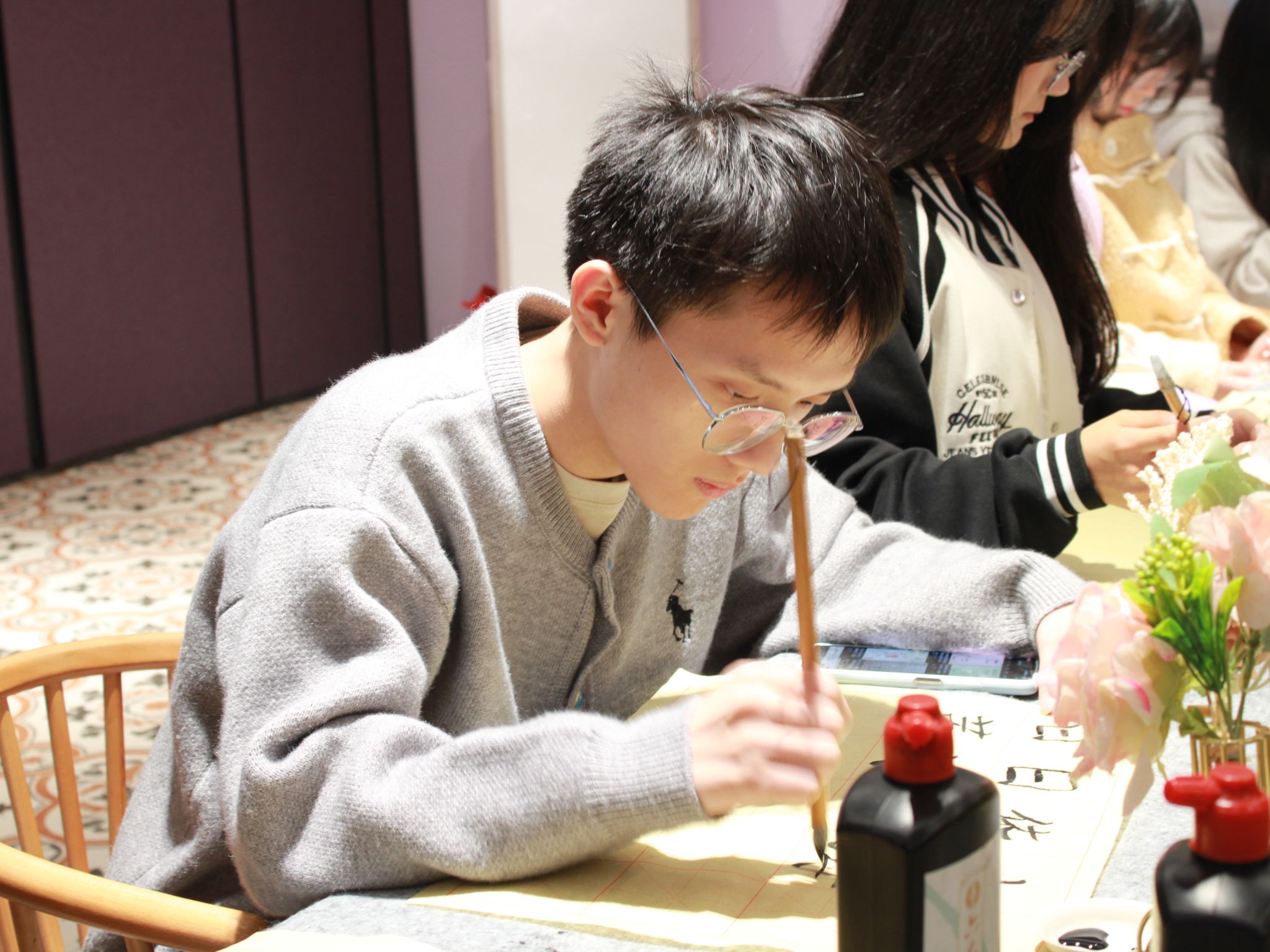 活动伊始,主持人以一段饱含诗意的开场白拉开活动序幕,向在场同学介绍:“王维是‘诗中有画,画中有诗’的山水田园诗派代表,其笔下‘大漠孤烟直,长河落日圆’的雄浑、‘明月松间照,清泉石上流’的雅致,皆为大家今天对话经典的绝佳入口。”在诗歌中,大家进入了第一个环节,临摹写诗环节。参与者们或结合对王维山水田园风格的理解,或从现场雅致氛围中汲取灵感,于纸笔间尽情挥洒才情。