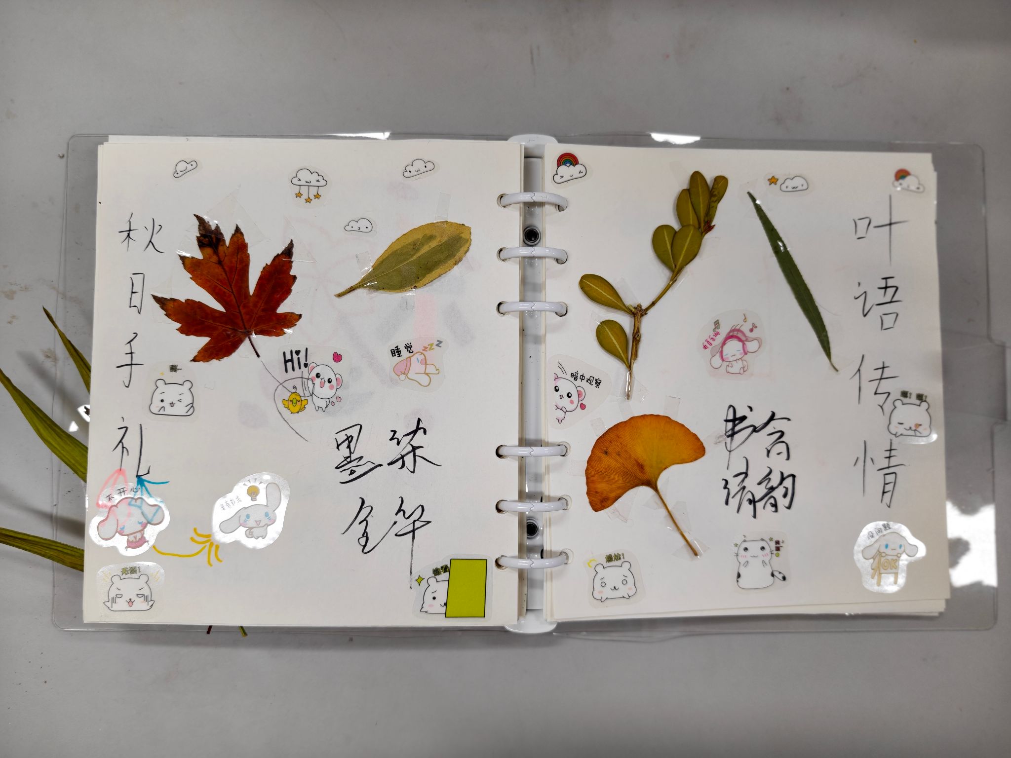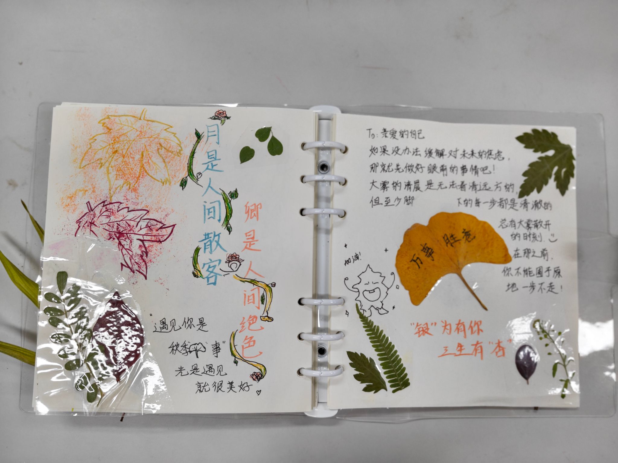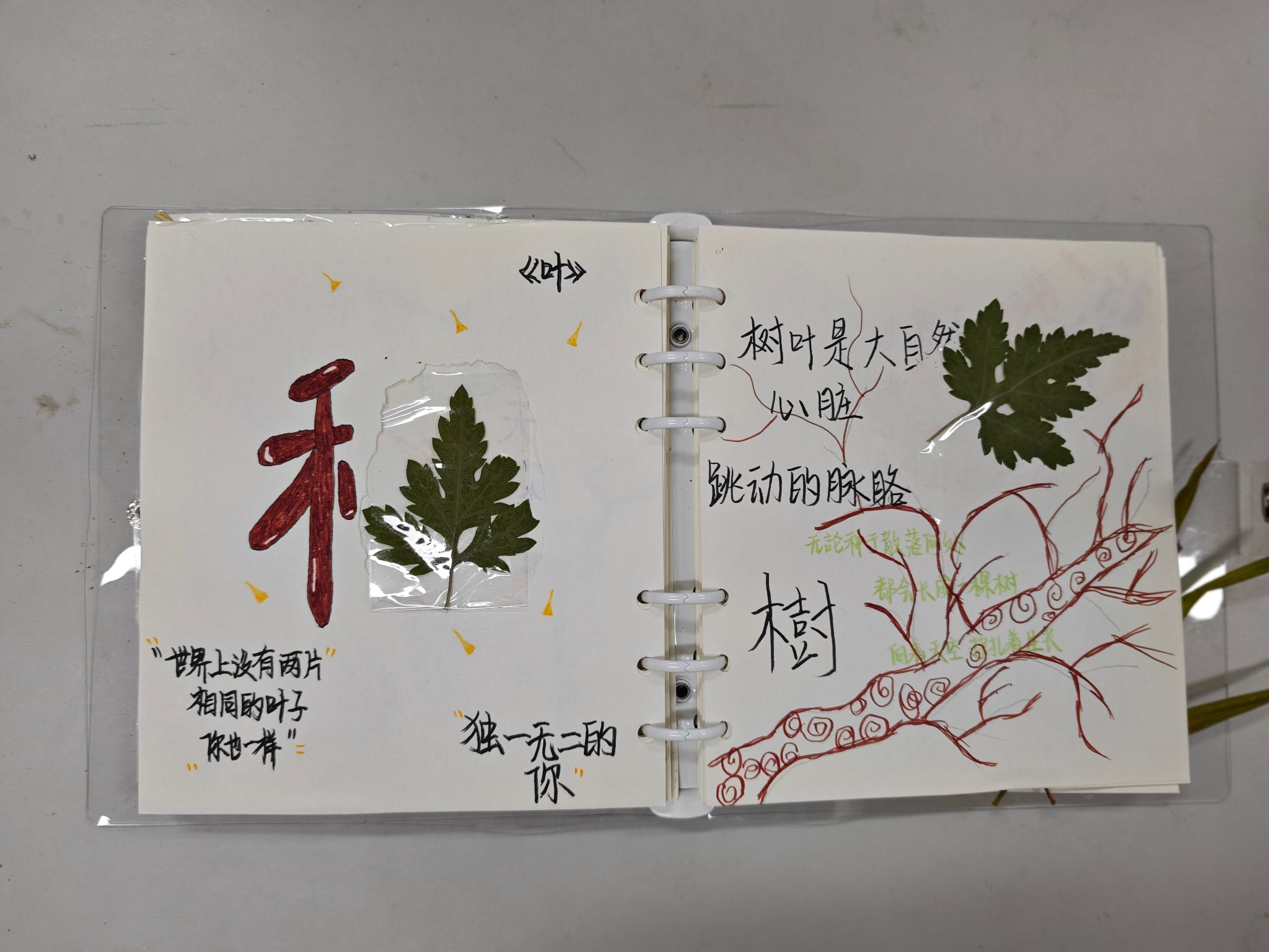 “世界上没有两片相同的叶子。”翠屏书院的冉思琴同学在手账扉页写下这句哲言。她将一片落叶轻轻嵌入纸页,视其为“秋日的符号”;又以另一片形态相似的叶子,勾勒出“大自然的心脏”,让自然之美在纸间流淌诗意。
