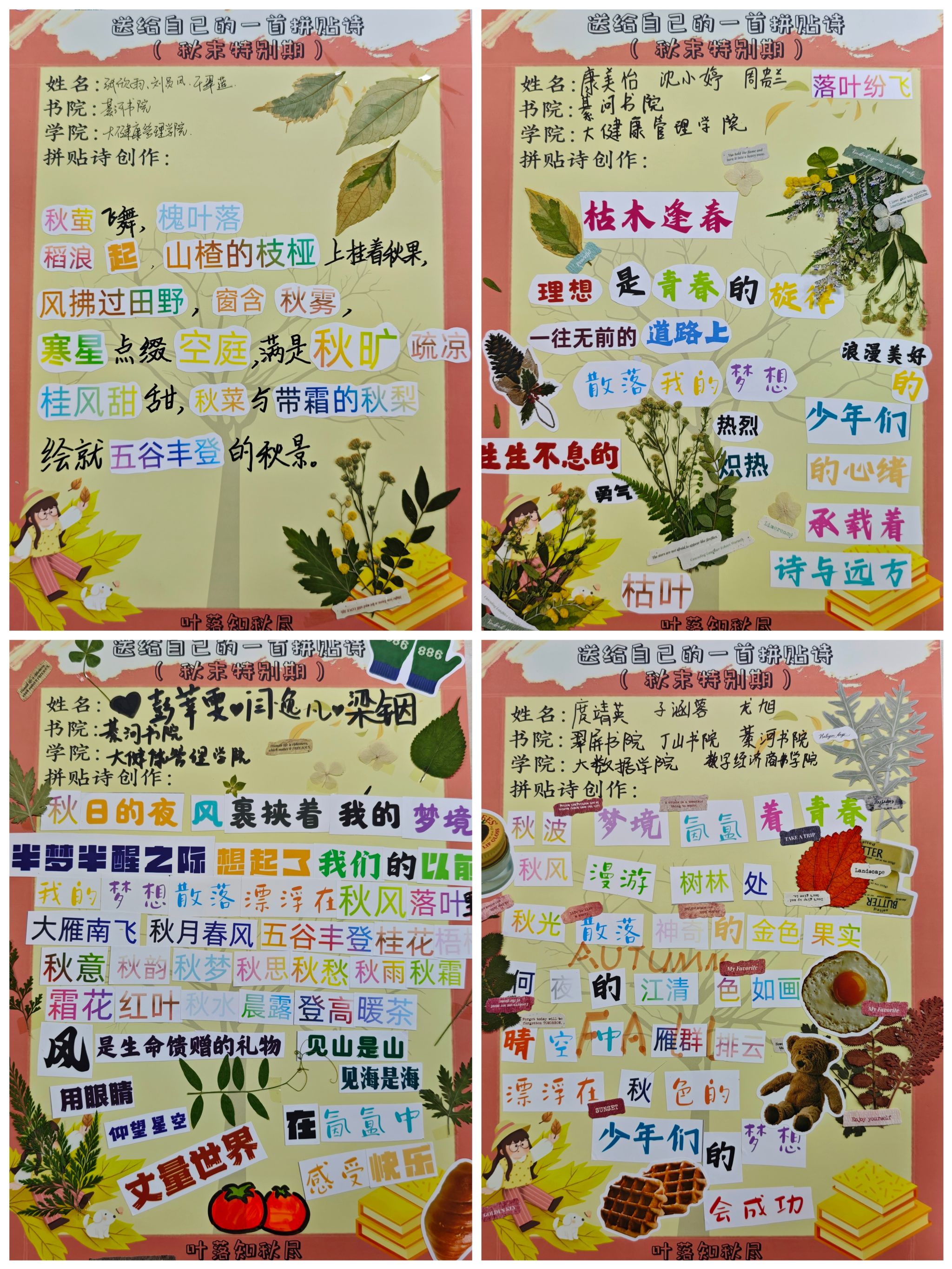 零散的字词,在指尖与灵感之间重获新生。同学们以落叶为饰,以剪贴为媒,将“落叶”“桂香”“清风”等带着秋意的词语拆分、重组、再建构。剪裁与粘贴之间,过往的回忆与当下的感悟悄然融合。大健康管理学院的张欣雨、刘员风、平翠莲写下“秋莹飞舞,槐叶落。稻浪起,山楂树枝桠上挂着球果”,以细腻的笔触捕捉季节的痕迹;而数字经济商学院的同学则写道“枯木逢春,让我们驻望理想,永远热爱生活的感受”,在秋寒中传递出向阳而生的力量。