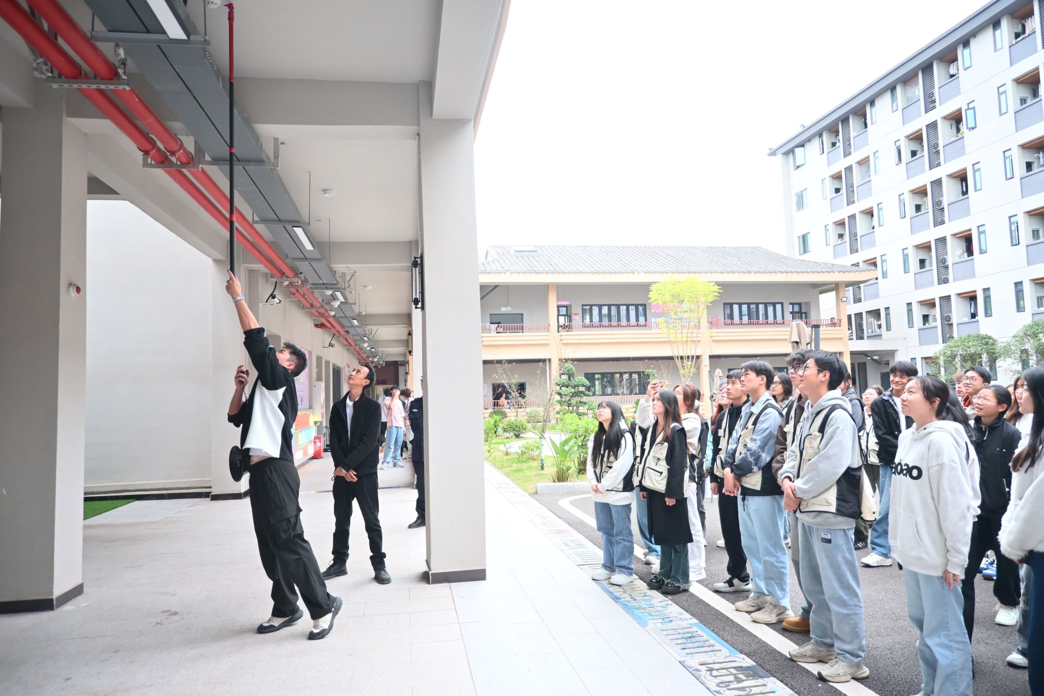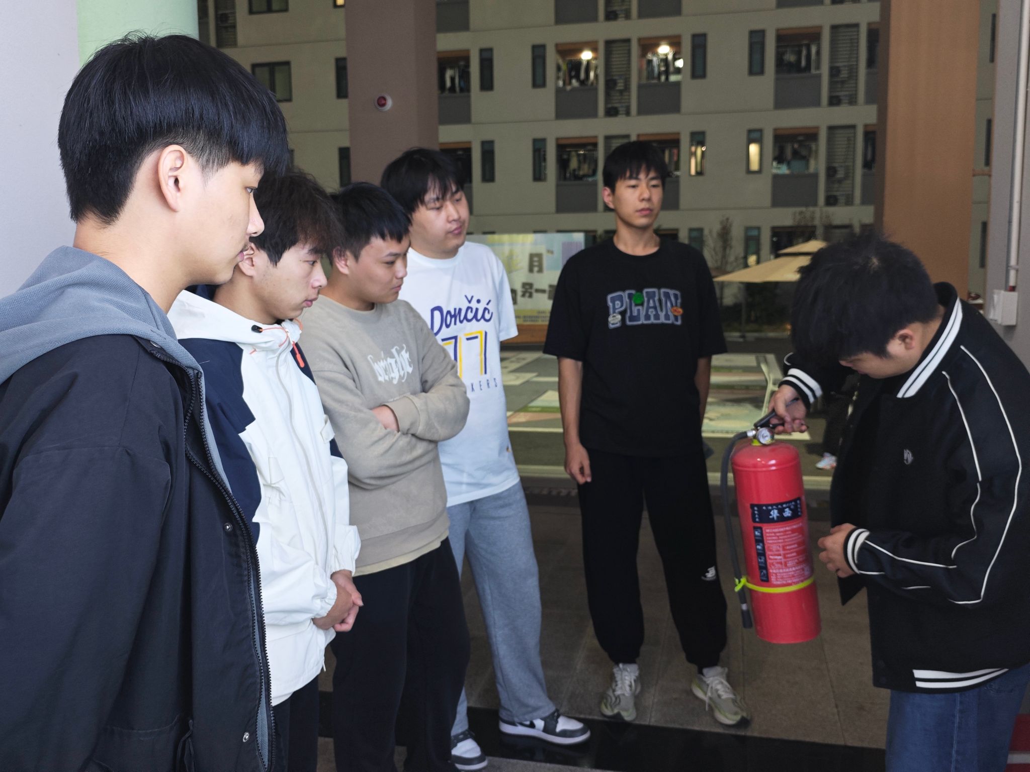 在完成学校组织的集中培训后,南江书院立足自身环境,开启了定制化的“安全地图解锁”环节。书院导师引导学子们深入各楼层与公共区域,逐一辨识、定位消防设施,将抽象的消防知识与书院的具体生活场景紧密关联。过程中穿插随机提问,有效巩固了同学们在学校培训中所学的知识,实现了从“知道”到“能找到、会使用”的深化。