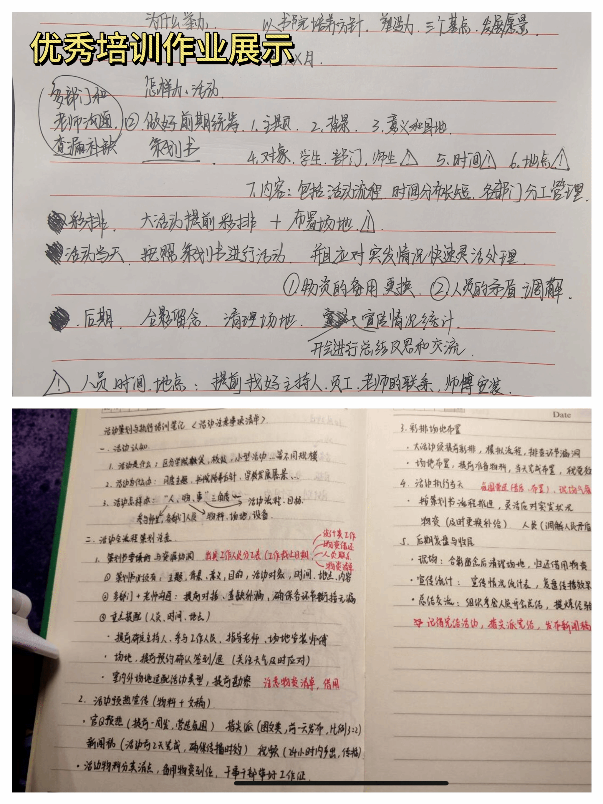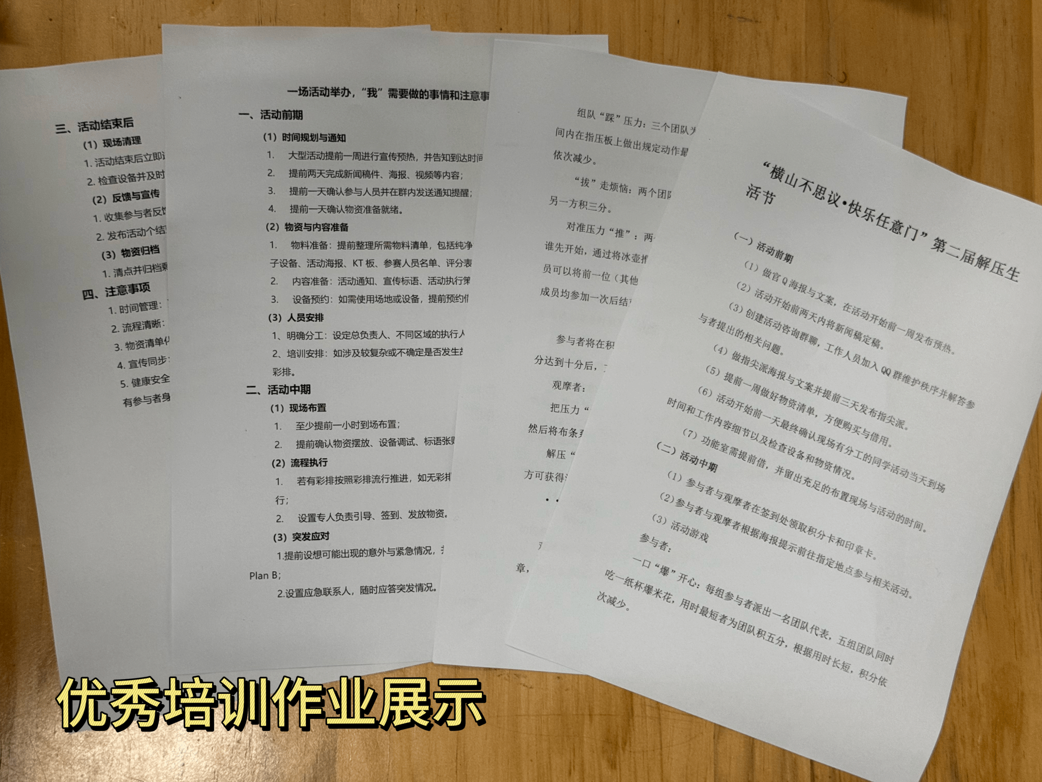 由于干部们反映对活动策划的全流程存在认知模糊,从前期构思到后期落地缺乏系统思路,在资源协调、流程把控等方面经验不足,易出现细节疏漏等问题,杜曦雅老师以活动为写入点展开了第三期培训。杜老师分享了自己整理出的《如何举办一场高品质的书院活动(参考手册1.0)》,包含从初期idea到活动收尾的全流程经验。培训后,干部们各自总结出一份“属于我的活动流程”,未来可以辅助各部门从资源整合、风险预判、现场把控等方面开展活动。