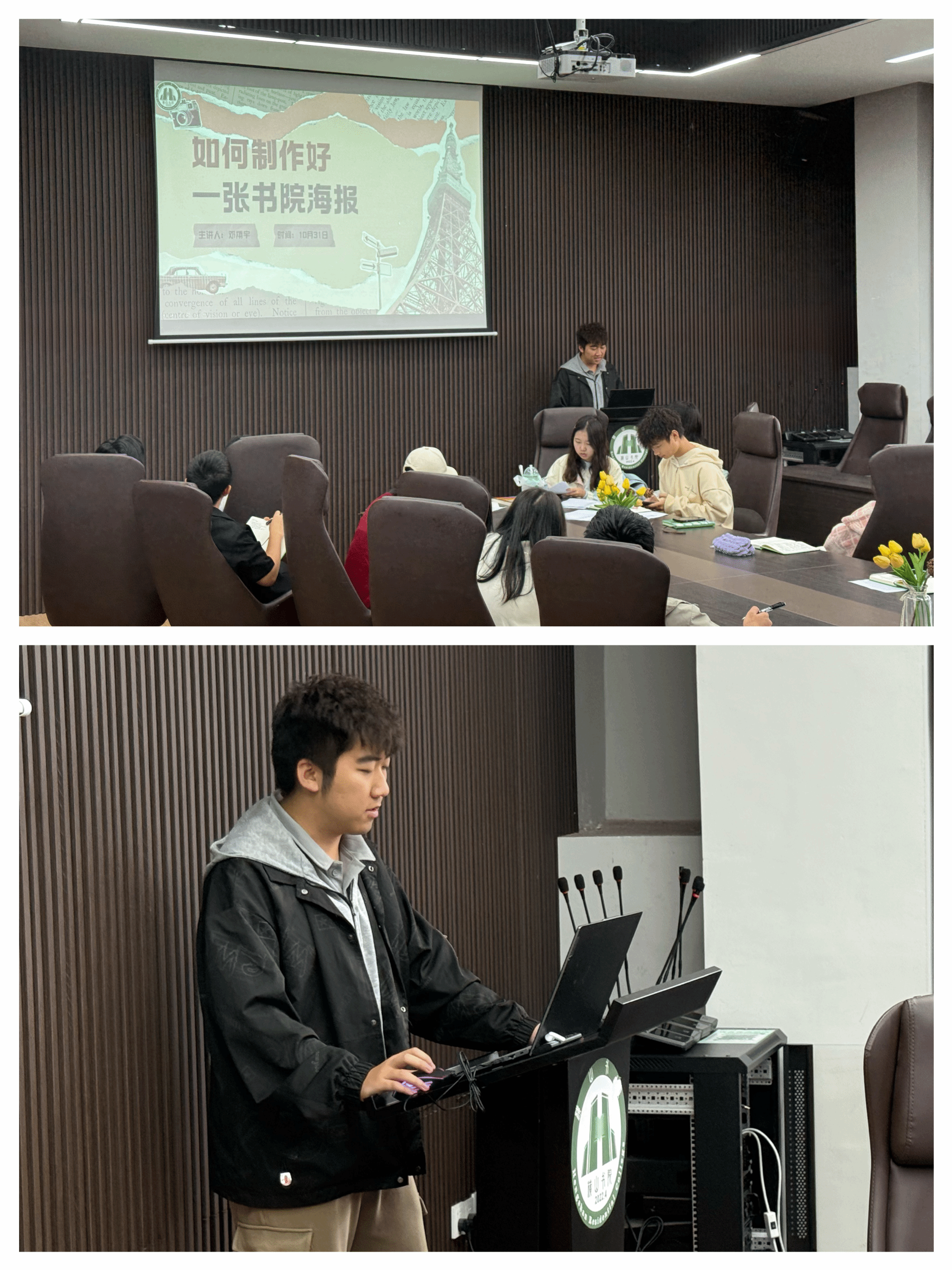 第四期培训针对多数干部缺乏海报设计技巧,设计作品风格杂乱,难以突出活动核心信息,视觉吸引力不足,无法有效助力活动宣传,来自文化推广部的邓翔宇同学分享了自己在海报设计上的心得,为学生干部提供视觉宣传方面的实用技巧和工具。邓翔宇同学分享海报设计心得后,干部们掌握了海报设计的构图、色彩搭配、信息排版等技巧,设计的海报能精准聚焦活动主题,视觉效果更优。
