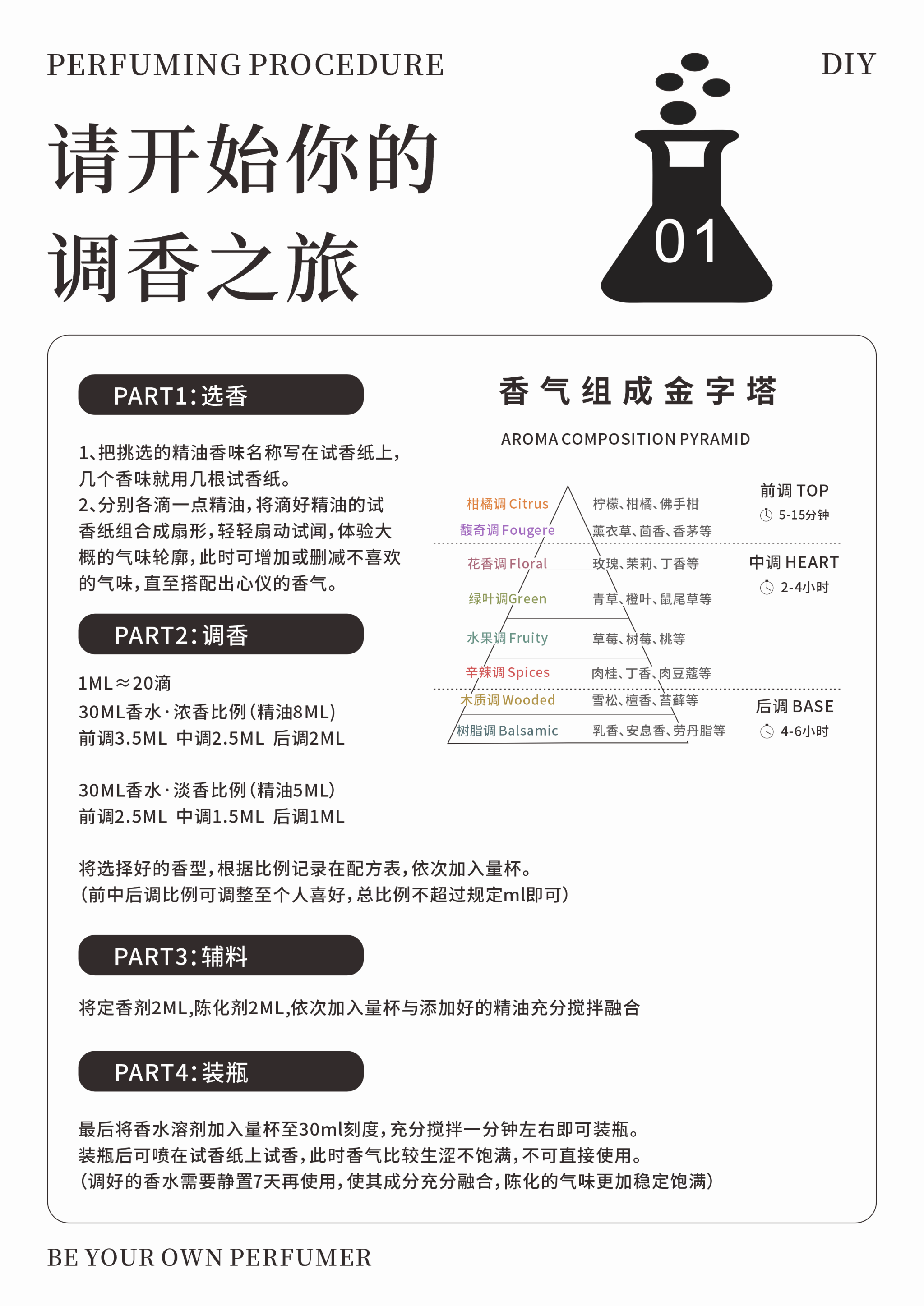 活动伊始,讲解人柏姗言为参与者系统讲解调香知识。她以“香韵金字塔”为核心,细致拆解其韵律逻辑:金字塔基础层为定香剂,负责延长香气留存;中层为承转香型,衔接前后气味;顶层为挥发香型,决定初始嗅觉感受。同时,她结合实例解读前中后三调的层次奥秘——前调多为清新果香(如本次提供的柑橘精油),挥发较快;中调以柔美花香为主(如铃兰精油),是香气的核心;后调则多为沉稳木质香(如檀木精油),赋予香气持久余韵。讲解过程中,参与者们认真聆听,不时低头在笔记本上记录要点,遇到疑问及时举手提问,柏姗言耐心解答,现场笑语不断,为调香体验拉开愉悦序幕。