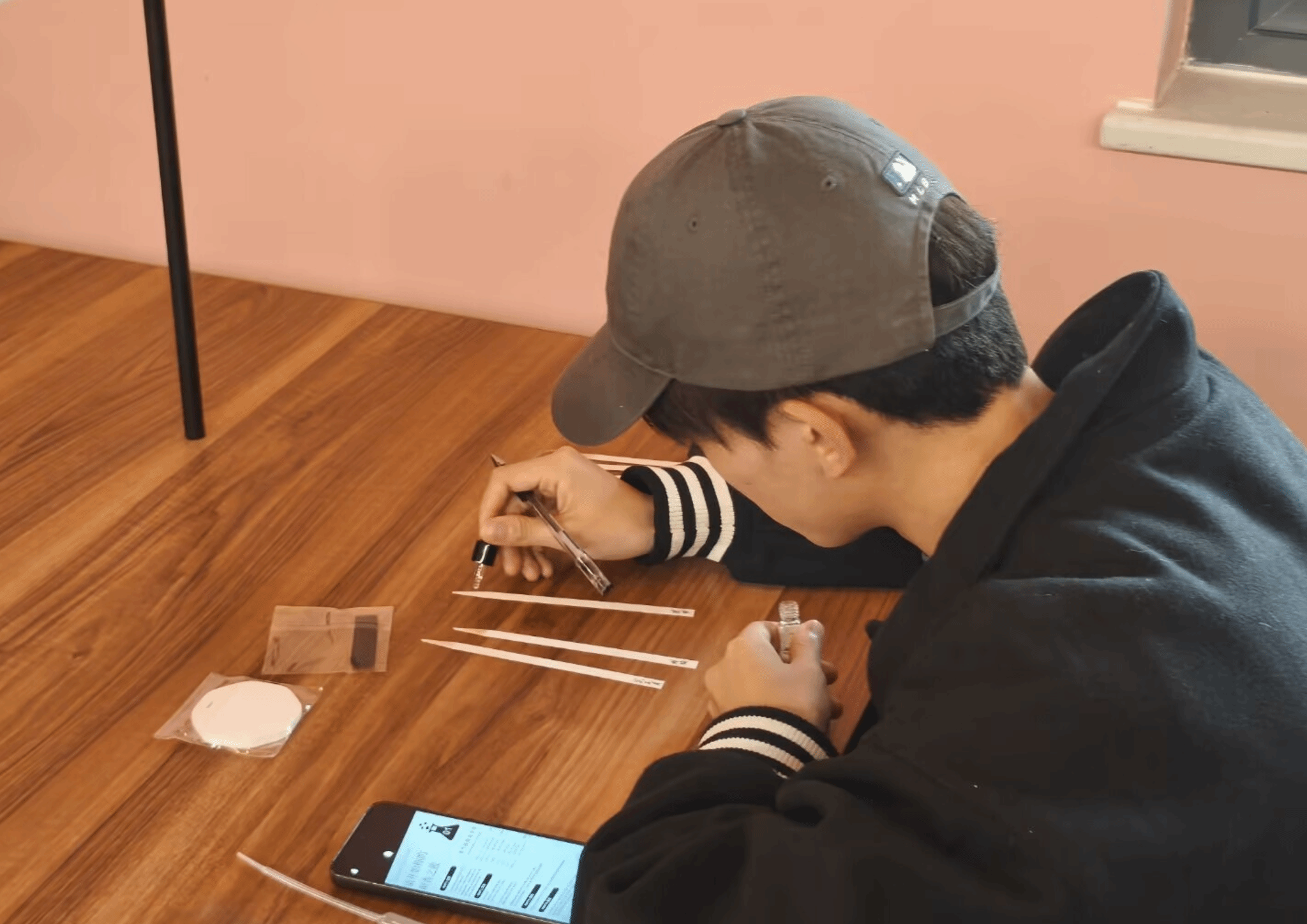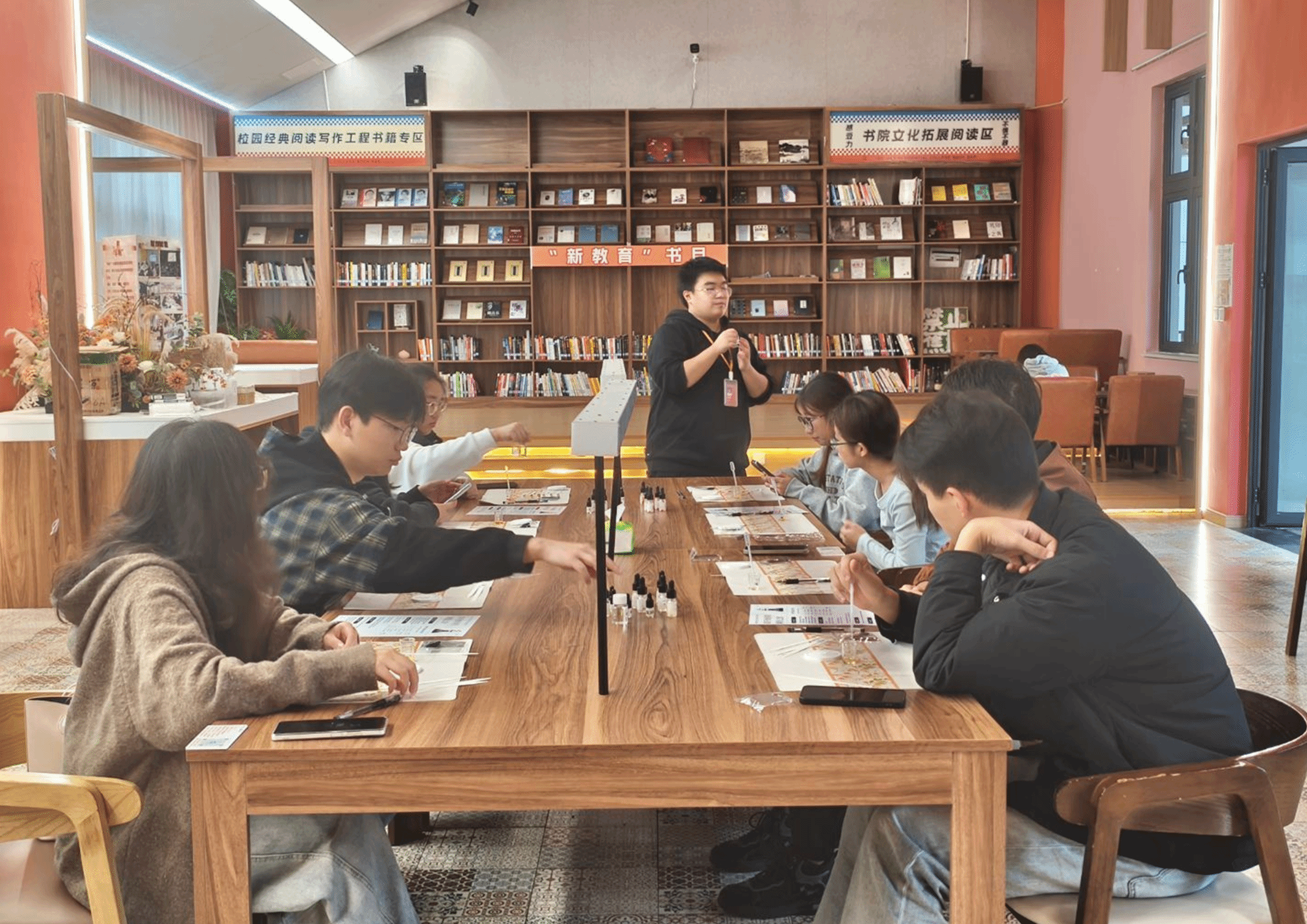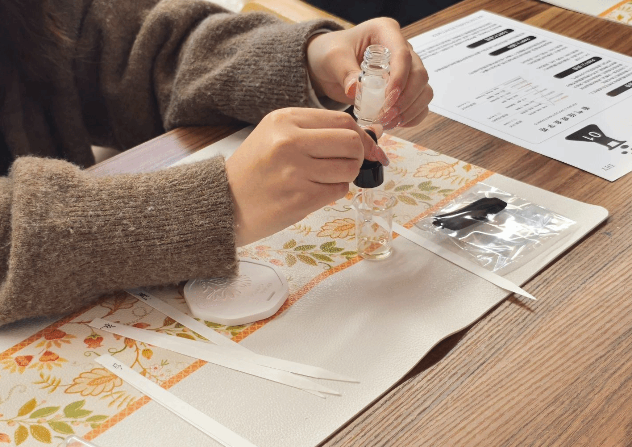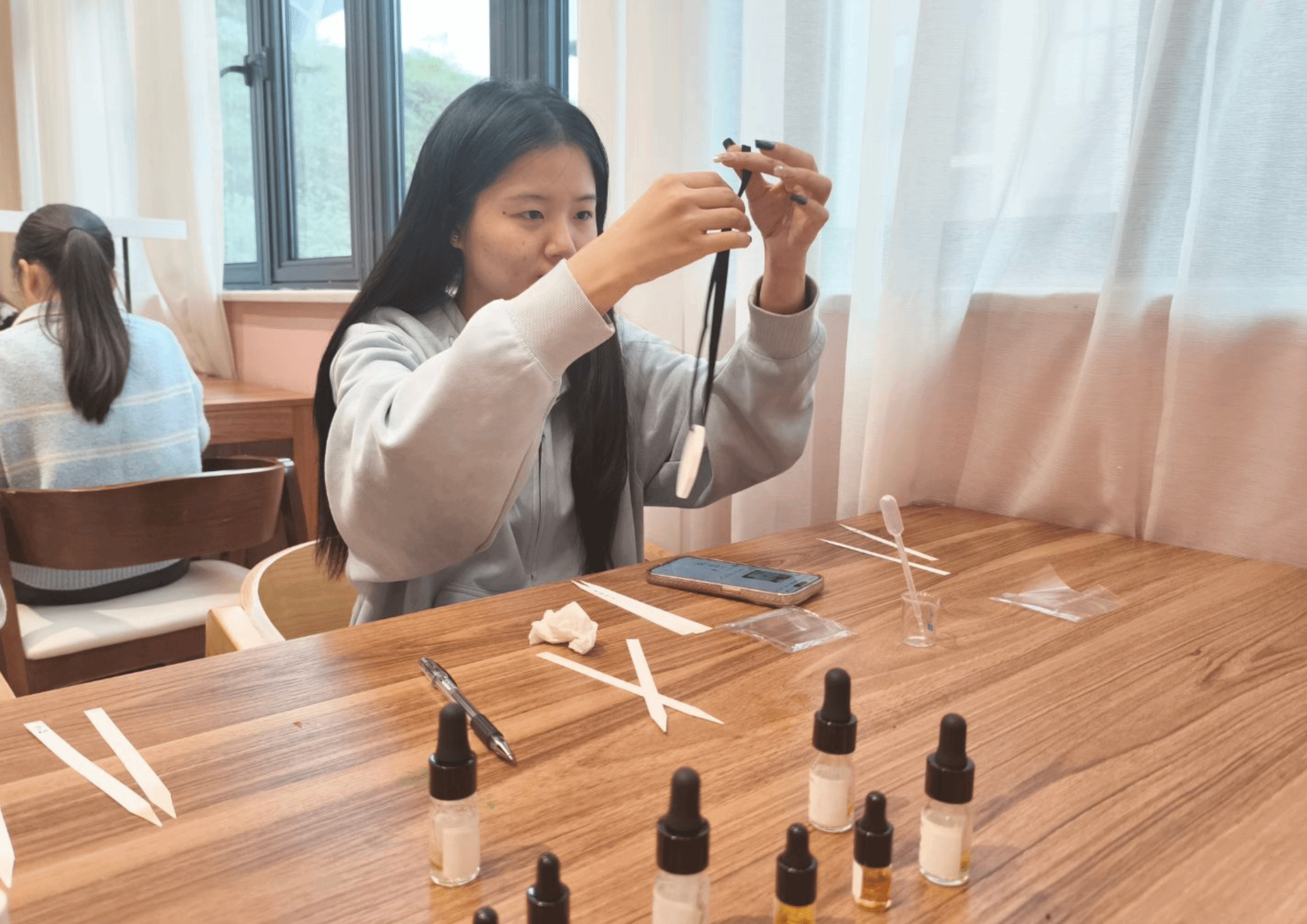 在理解调香知识后,参与者们正式迈入选香环节。讲解人柏姗言拆解制作流程:“大家将精油类型写在试香纸的尾部,再滴一滴精油在前端,搭配好后将其叠成扇形轻轻煽动……”同学们一边听着讲解一边动手挑选起来。在掌握基础调香知识后,参与者们进入选香环节。柏姗言清晰拆解操作流程:“大家先将选中的精油类型标注在试香纸尾部,再用滴管吸取一滴精油滴在试香纸前端,待精油渗透后,将试香纸叠成扇形,轻轻煽动感受气味融合效果。”话音刚落,同学们便行动起来:有人手持试香纸,在柑橘与柠檬精油间反复比对,仔细分辨细微香气差异;有人先滴取铃兰精油,又好奇地添加一滴玫瑰精油,叠成扇形后凑近鼻尖轻嗅;还有同学相互分享自己挑选的香型,交流嗅觉感受,试香纸在手中流转,鼻尖萦绕着不同的芬芳,每个人都在寻找属于自己的气味组合。