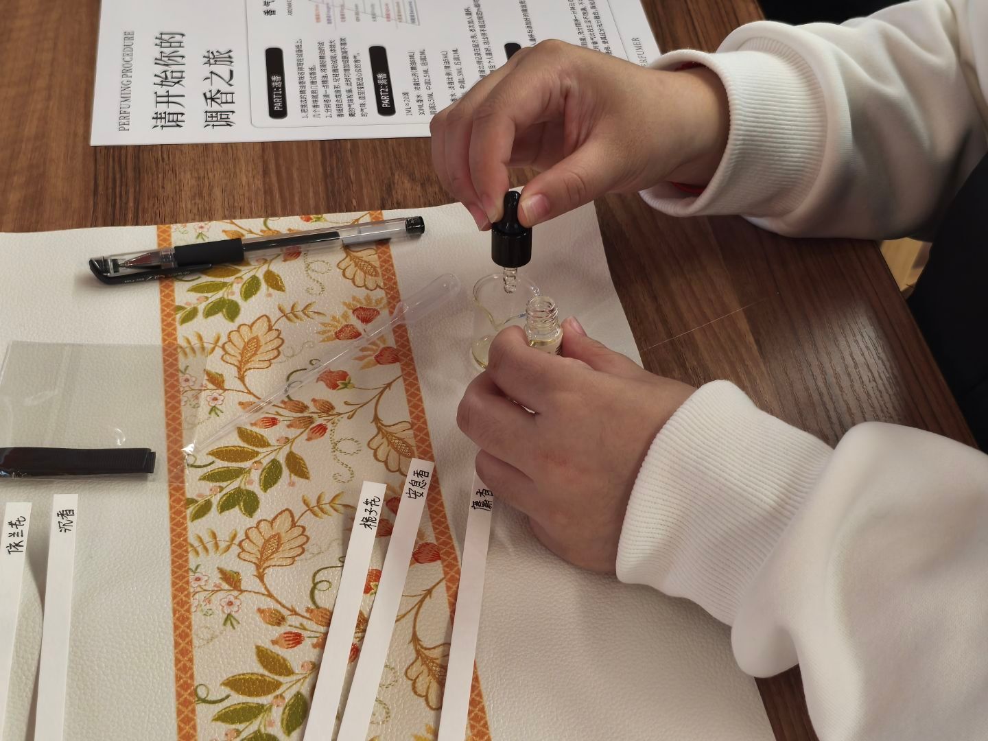 调香完成后,参与者们开始将调好的香氛滴注到香薰片上。香薰片为圆形卡纸,边缘印有精致花纹,中间留有挂孔。大家捏着滴管的手轻轻悬在香薰片上方,目光紧锁滴管尖儿:有人滴完一滴便稍作停顿,观察油印缓缓渗入卡纸的痕迹,再继续滴下一滴;有人担心手晃导致滴歪,特意将胳膊抵在桌沿,稳住手腕确保每一滴都精准落在香薰片中心。经过耐心操作,同学们纷纷完成专属香薰片制作,捧着作品与朋友分享喜悦:“你闻我的,檀木味很安神!”“我的柑橘铃兰特别清新,像冬日里的阳光!”大家仔细将香薰片放进透明密封袋,系上挂绳,把这份可触、可闻、可忆的小确幸妥善保管。