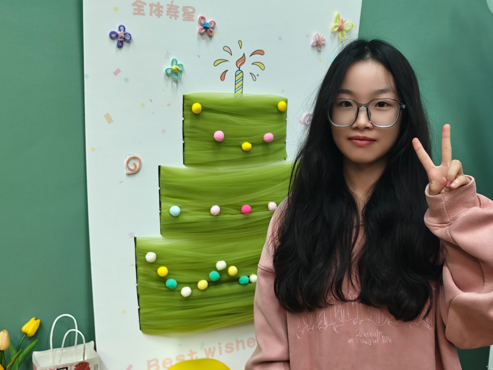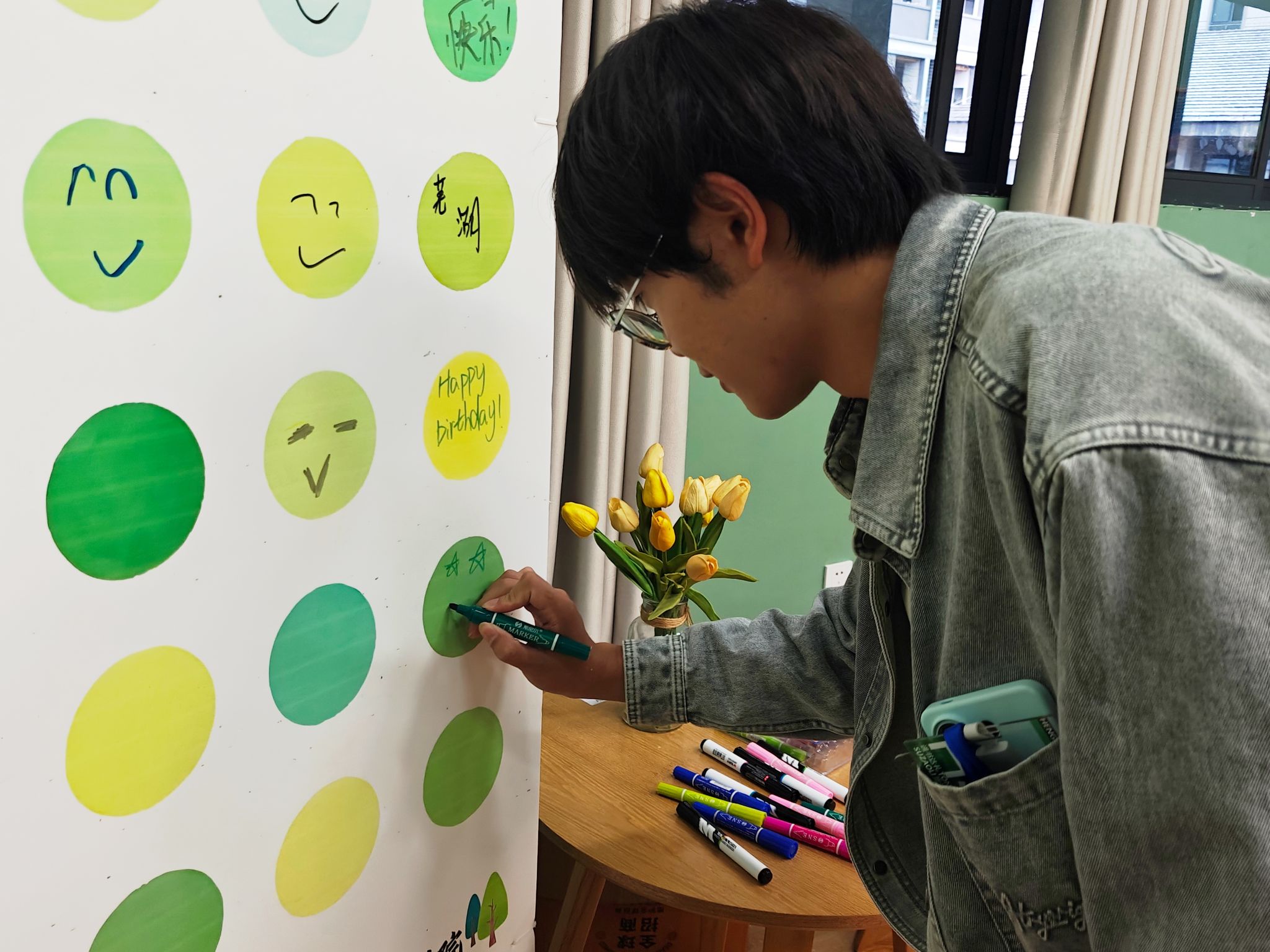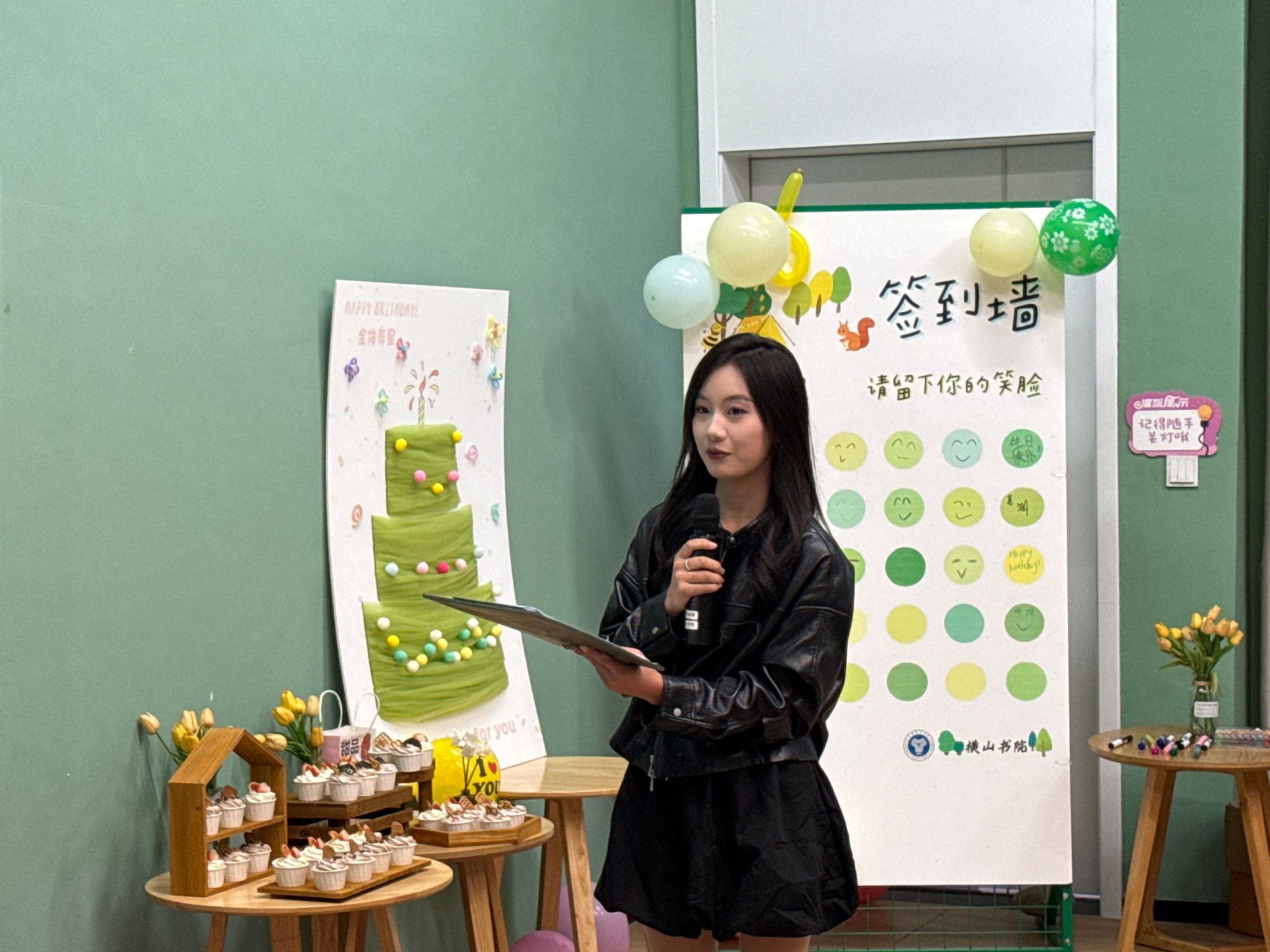 活动伊始,一座融合横山书院色彩与甜蜜氛围的网纱蛋糕艺术装置迅速成为焦点,吸引寿星们纷纷打卡留念。一旁的“生日笑脸签到画板”则成为情绪表达的舞台——寿星们用画笔勾勒专属表情,或俏皮“裂开”,或开心“撒花”,在轻松共创中完成破冰,也为书院留下了一份生动的秋日记忆。