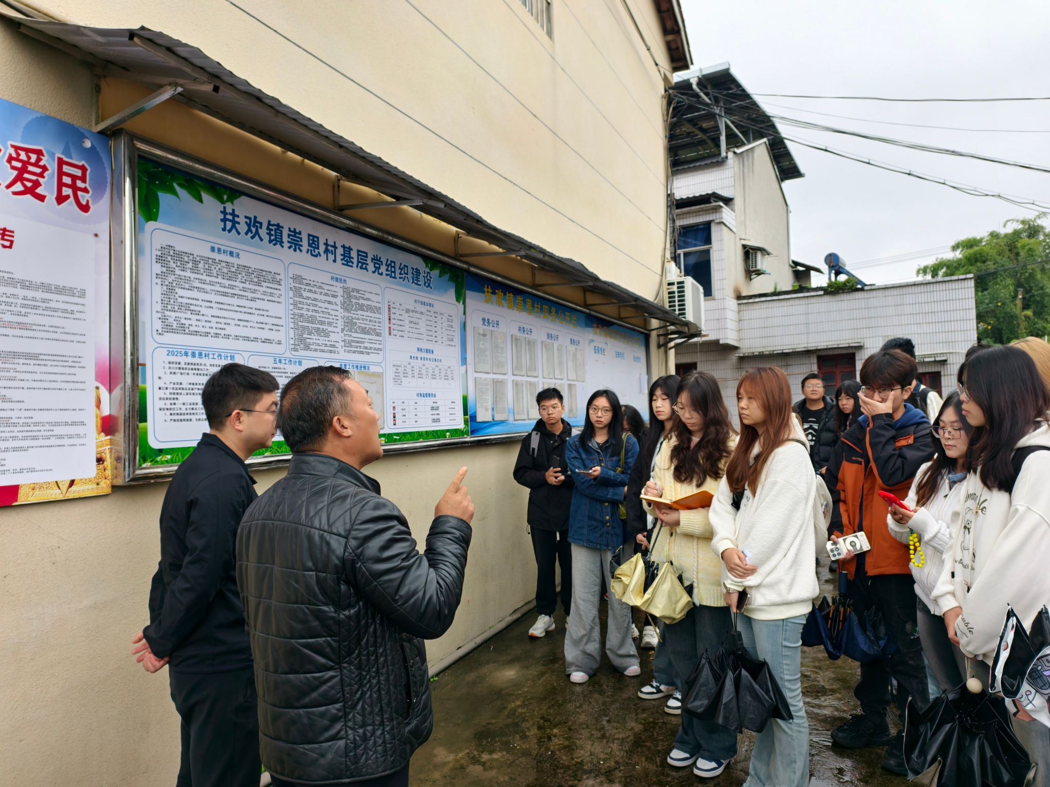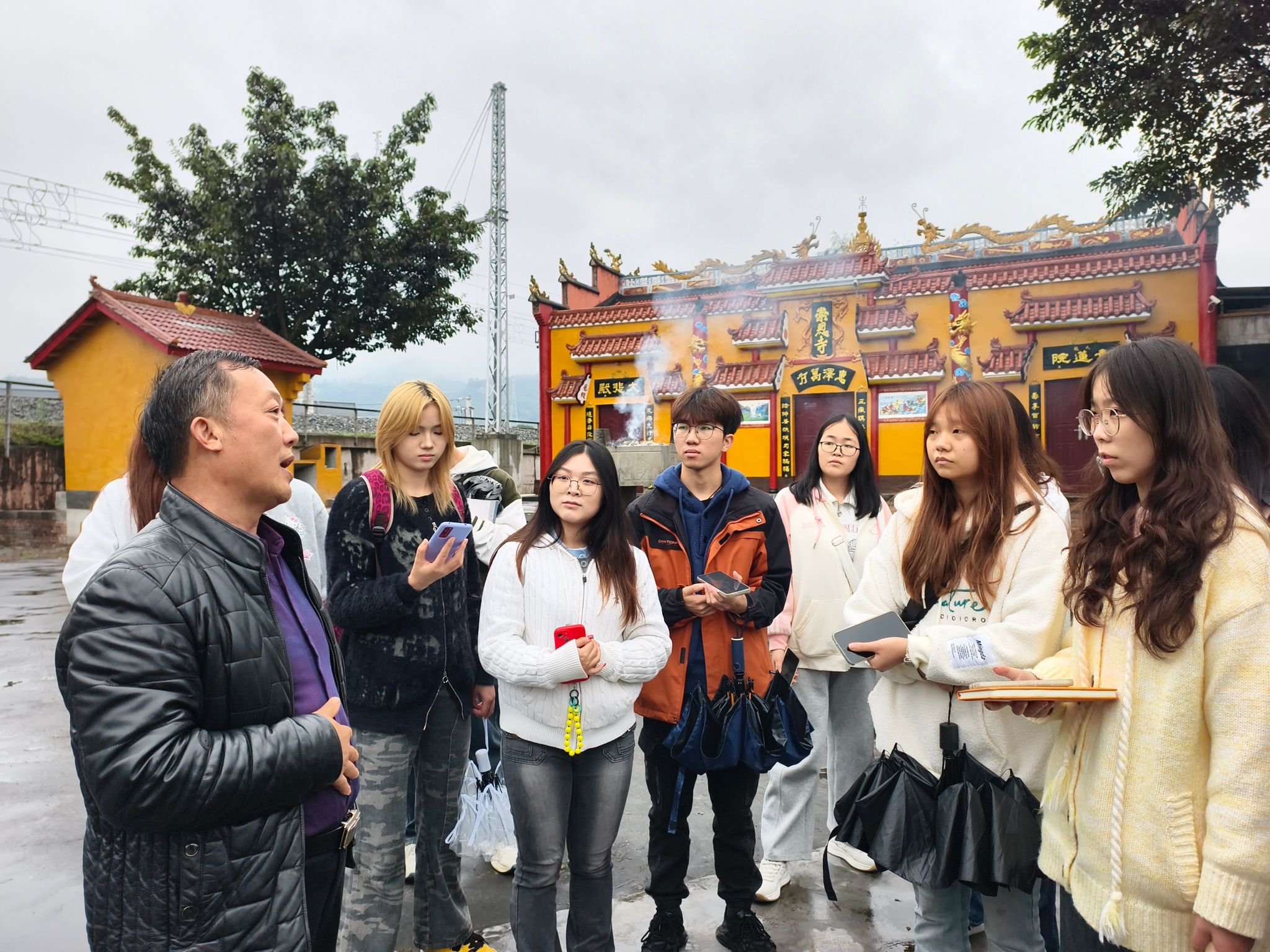 扶欢镇副镇长卢林菓与崇恩村党总支副书记田维科向同学们详细介绍了村情,包括人口结构、产业布局和发展规划,重点突出了以“草蔸萝卜”为代表的特色农产品及其深加工产品“萝卜蓝莓汁”,还重点介绍了国家能源集团为当地带来的就业机会。同时,也向大家介绍了安育村达600余亩的蓝莓园及其丰富的衍生产品,如蓝莓鲜果、蓝莓汁、蓝莓酱和蓝莓酒。他特别提到,蓝莓采摘时间集中在6—7月,并热情欢迎广大师生前来体验采摘乐趣,感受乡村魅力。田副书记带领大家参观市级文物保护单位崇恩寺,讲解其历史、建筑特色与文化价值。调研中,同学们围绕特色农业资源、文化遗产资源和就业与产业支撑等问题交流初步想法,结合现有资源,推动推动农产品品牌化、发展文化研学等新业态,借助在地企业资源,探索“产业+就业+人才”联动模式,增强村镇可持续发展能力。调研结束后,卢林菓镇长邀请大家共进午餐,并感叹青年的朝气蓬勃,也坚信青年将以这份热情助力村镇发展。