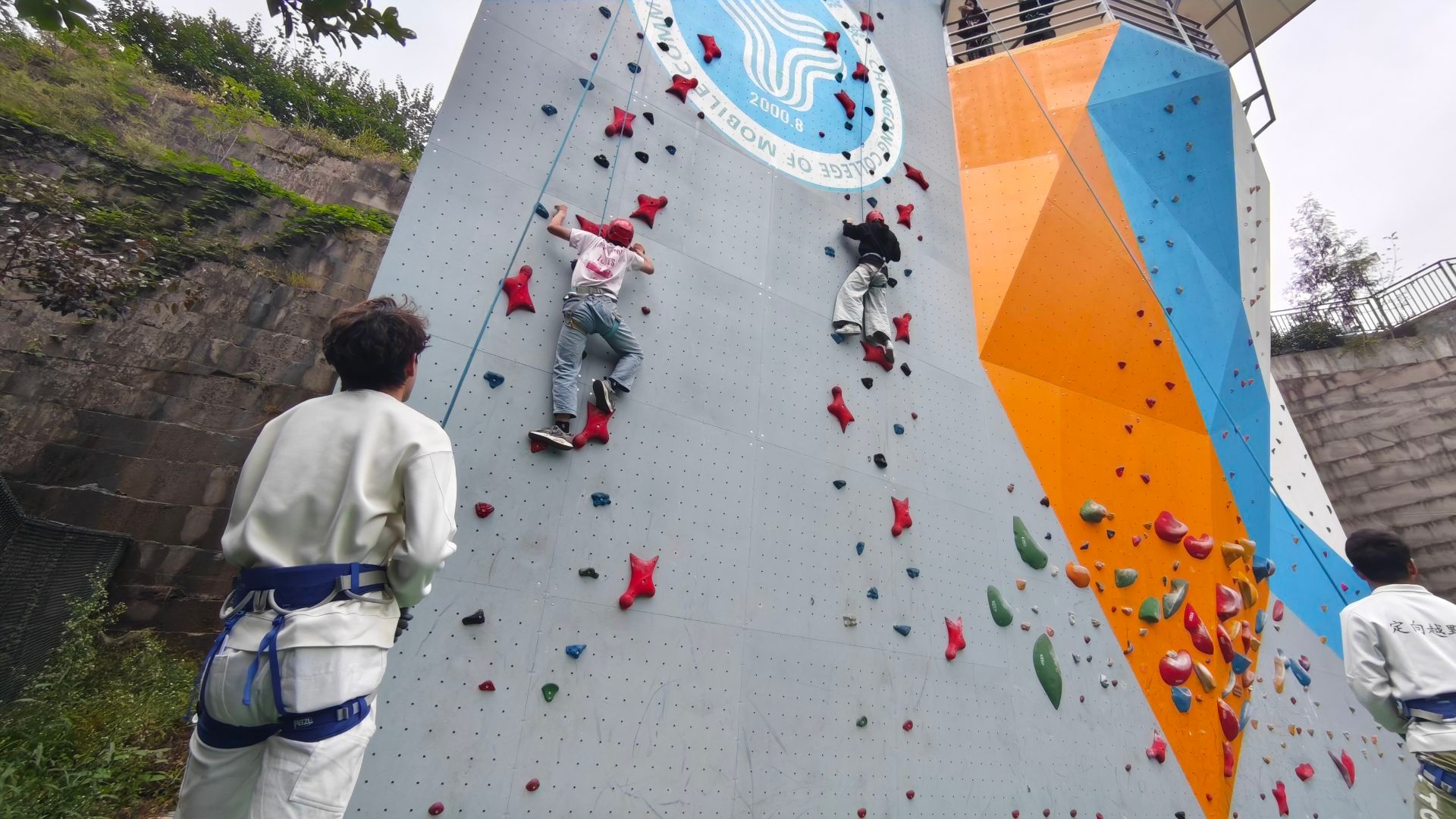 随着攀登环节正式开始,岩壁前瞬间充满了蓬勃的朝气与活力。成员们依次上阵,在岩壁上寻找支撑,也在同伴的鼓励与指引中不断向上。岩壁不仅考验着每个人的体力与意志,也成为连接彼此的信任之桥。此起彼伏的加油声、指导声与欢呼声,交织成一曲动人的团队协奏。