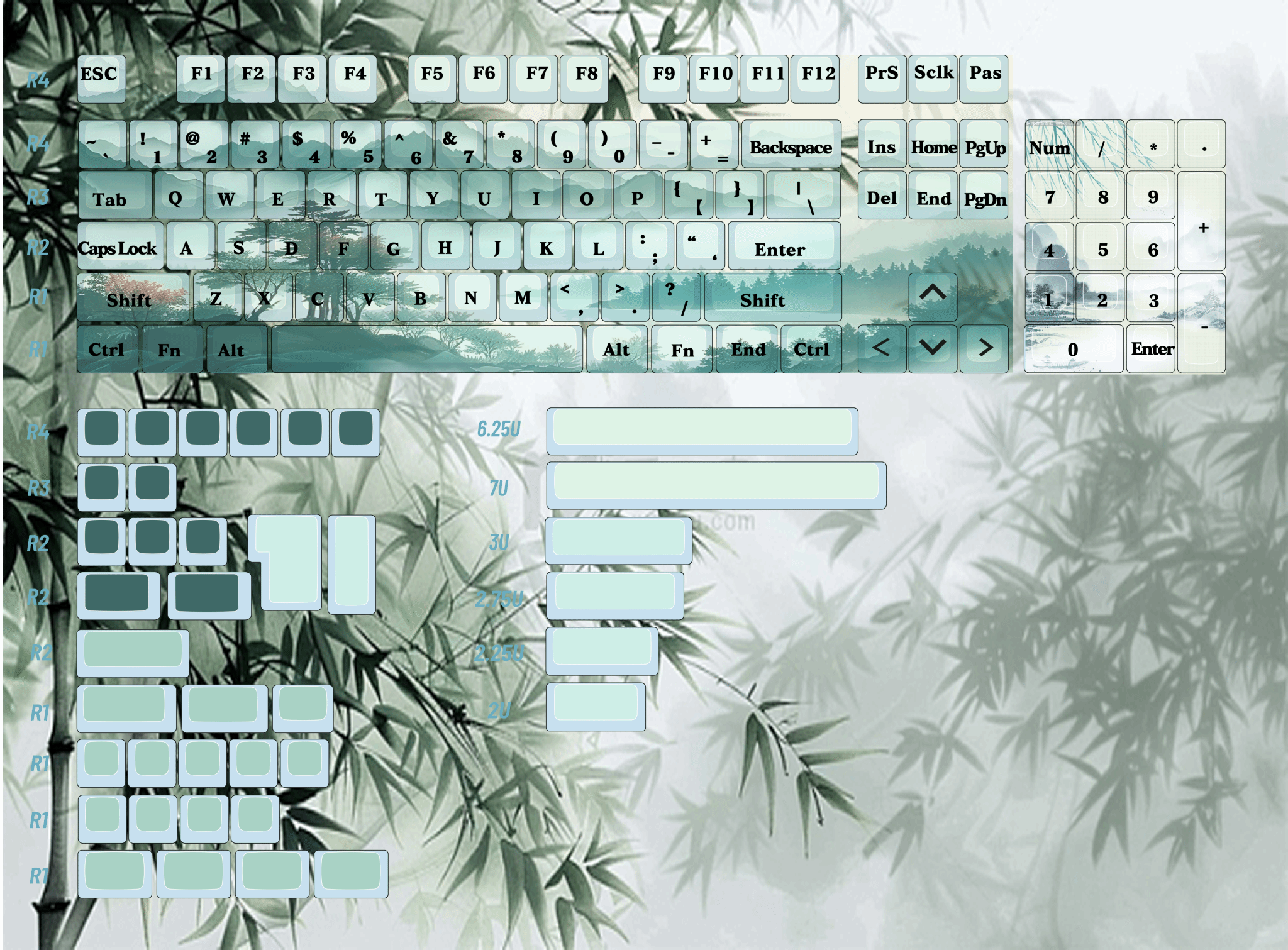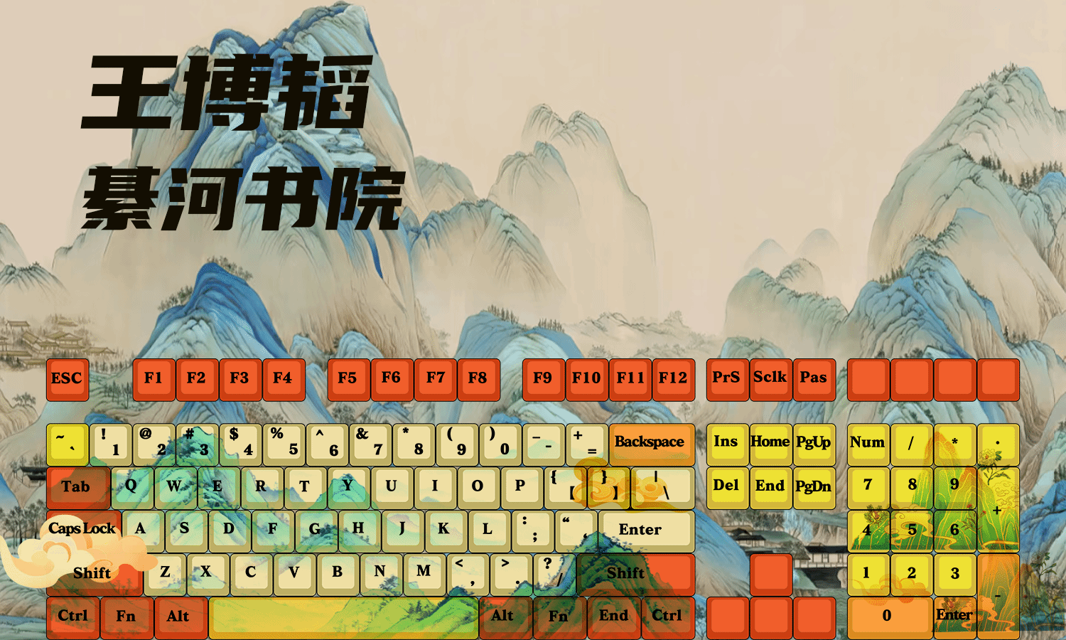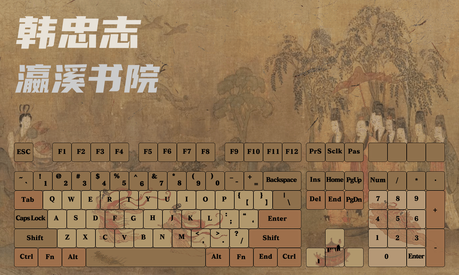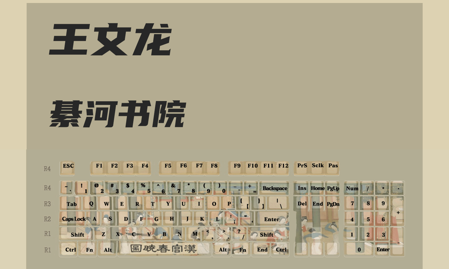 翠屏书院的王甜甜同学将市井烟火气的《清明上河图》搬上键帽。浅米黄键面为宣纸,深褐线条勾勒溪流蜿蜒,用来点缀的万家灯火与生动形象的人物;翠屏书院的毛星月同学则细微的提取了画中各行各业人物的服饰颜色,复刻出北宋的生活美学。