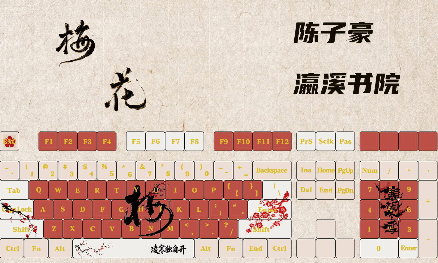 远景学院、瀛溪书院的陈子豪同学设计的梅花键帽,仿若从踏雪寻梅图中走来。霜白键面是没化透的残雪,朱砂点的梅瓣带着股冻不死的韧劲。当指尖碰这梅红时,像能闻着雪后梅林的凉气,诗里的寒梅好似真成了能摸着的鲜活。