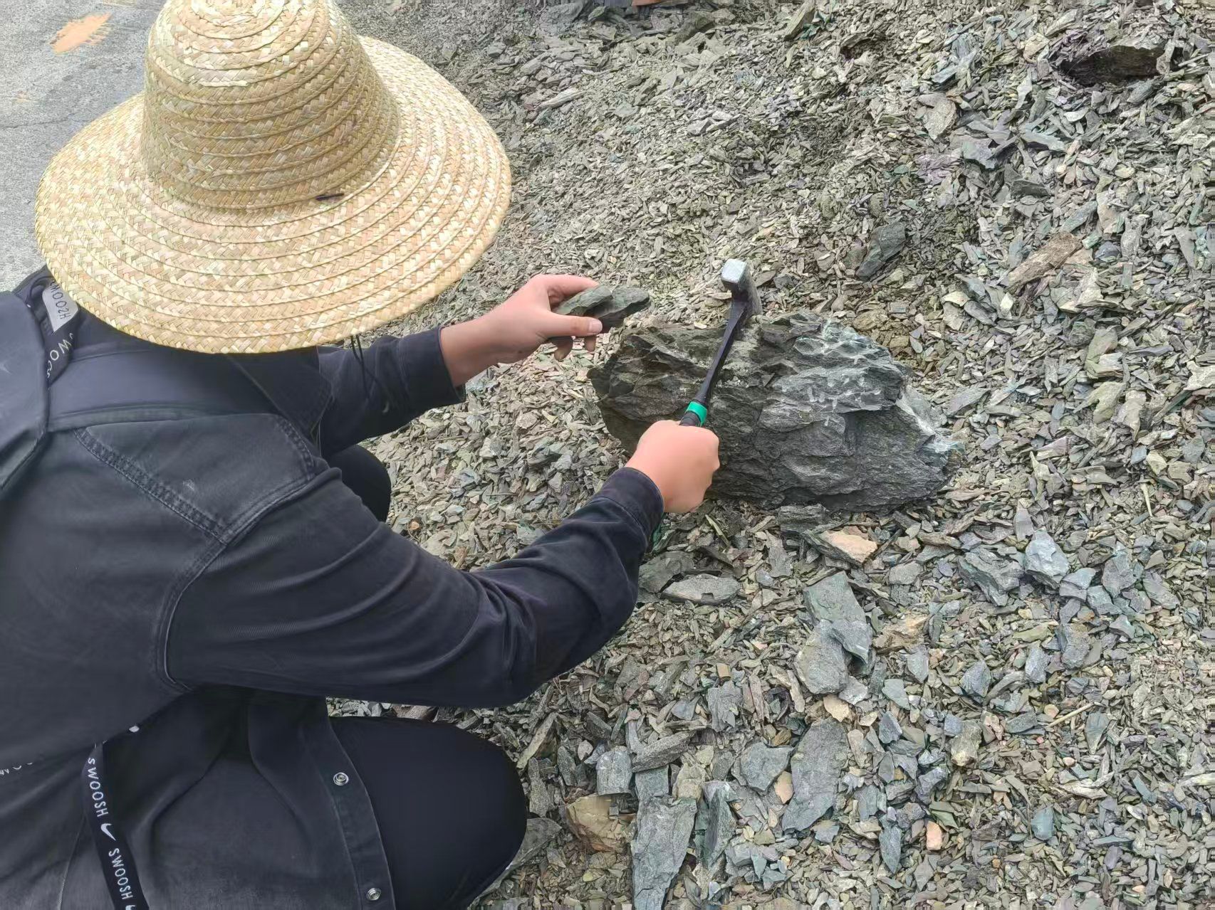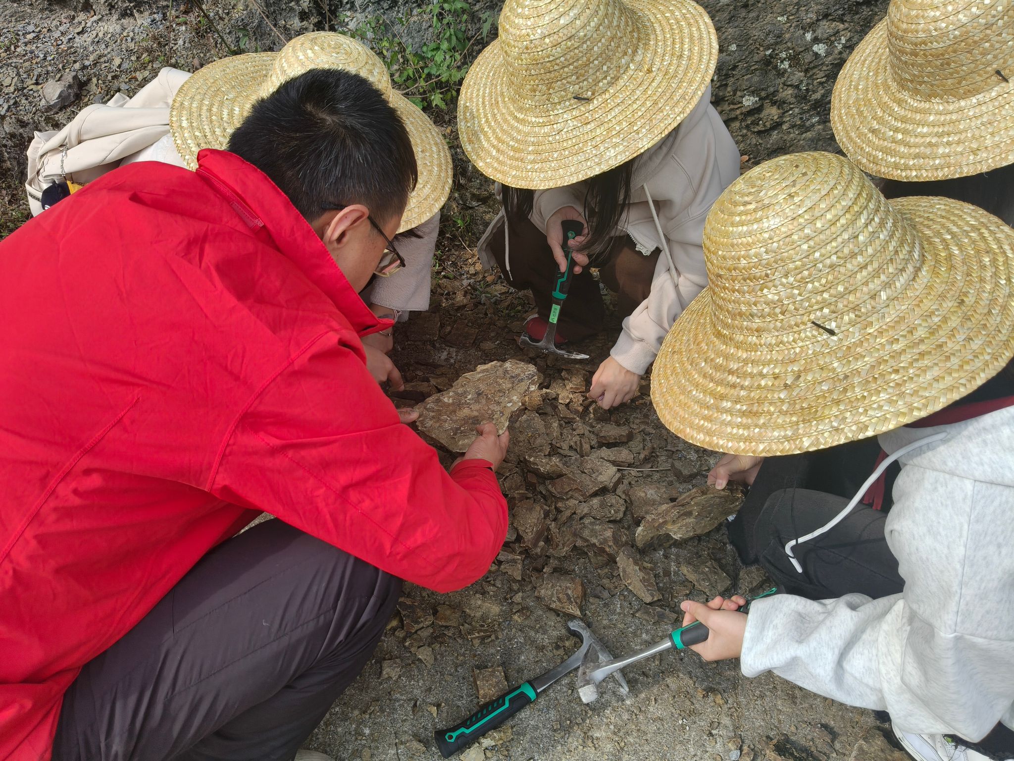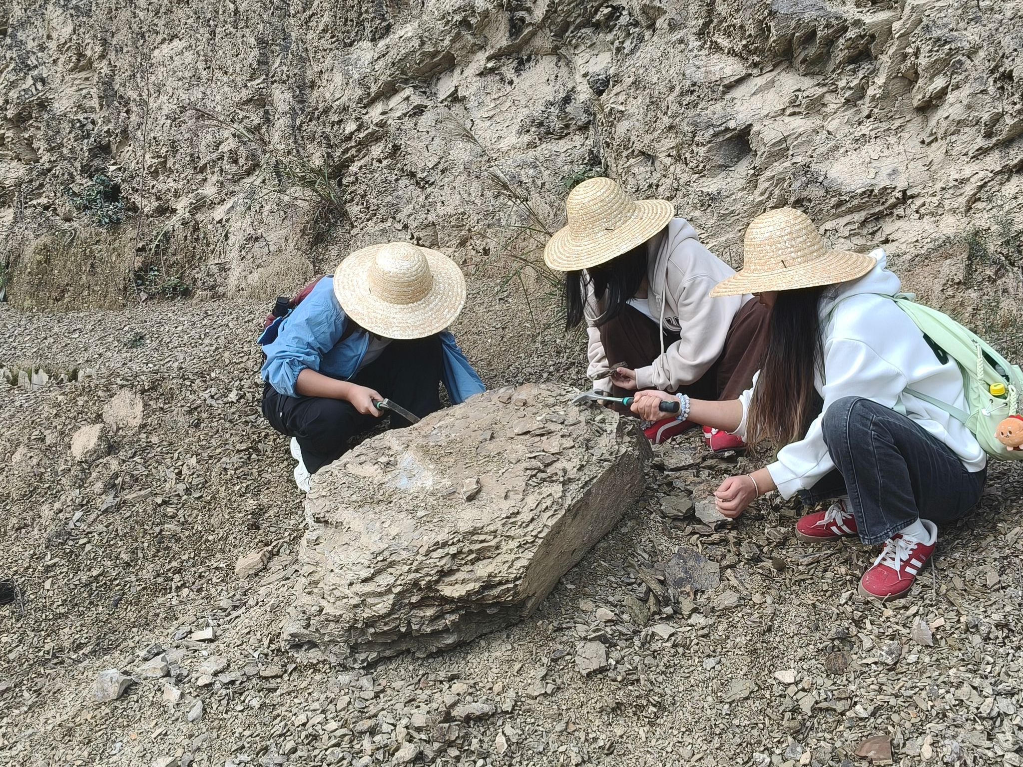 “敲击不是蛮力,而是与地球的对话。”活动一开始,张锋博士手持一枚腕足类化石,向同学们演示“三角轻敲法”。“岩石是有记忆的,我们要做的,是温柔地唤醒它。”从岩层理路的识别,到化石种类的判断,同学们围拢在老师身旁,目不转睛。原来,“挖化石”不只是体力活,更是一场科学与耐心并存的修行。
