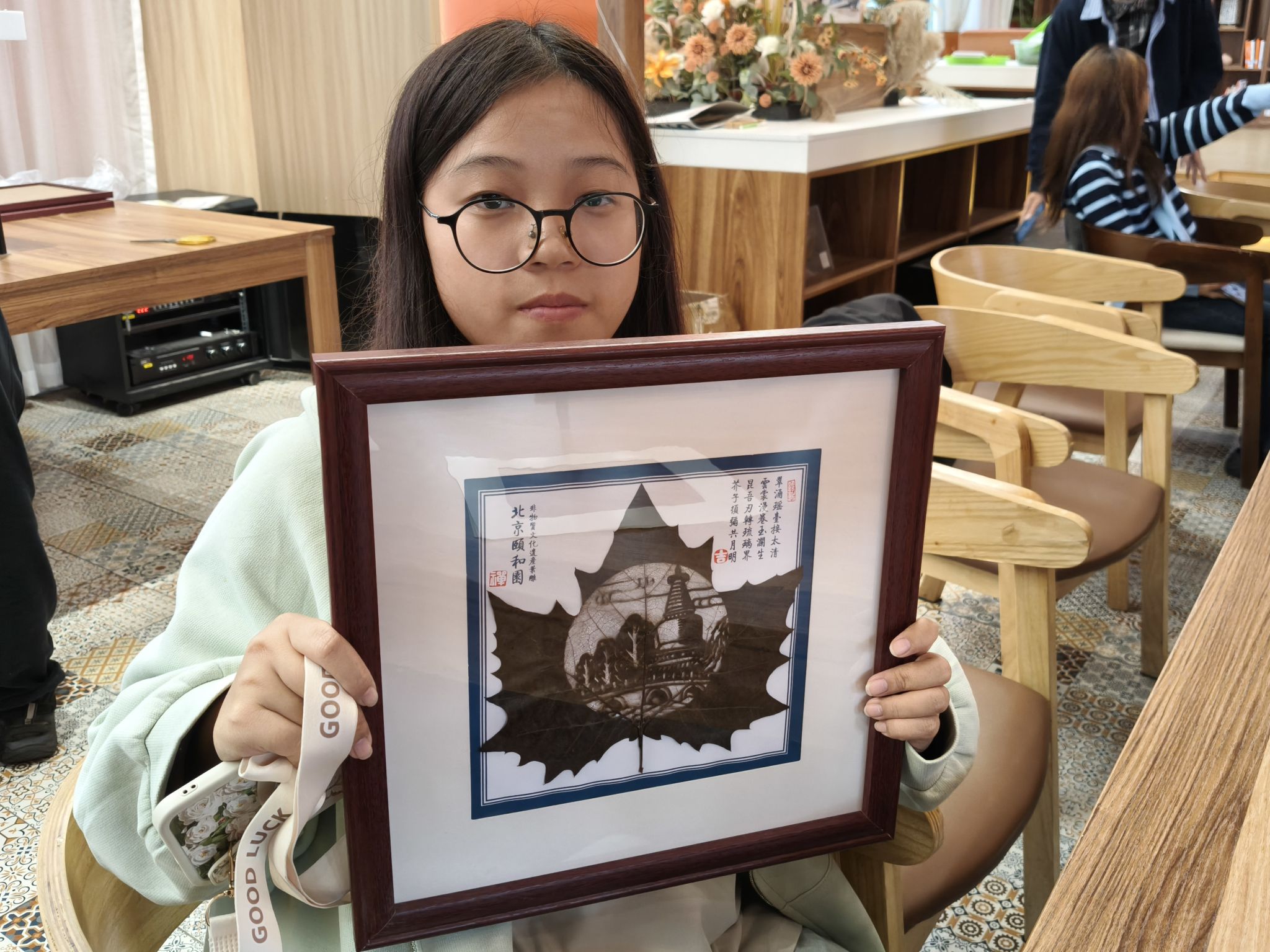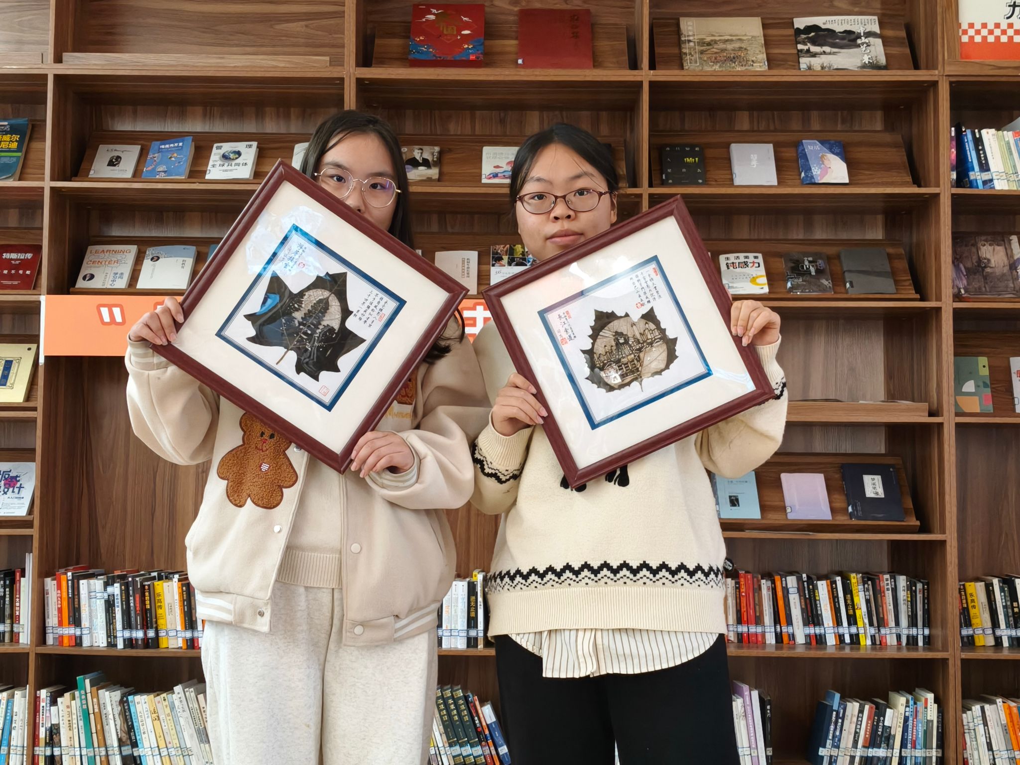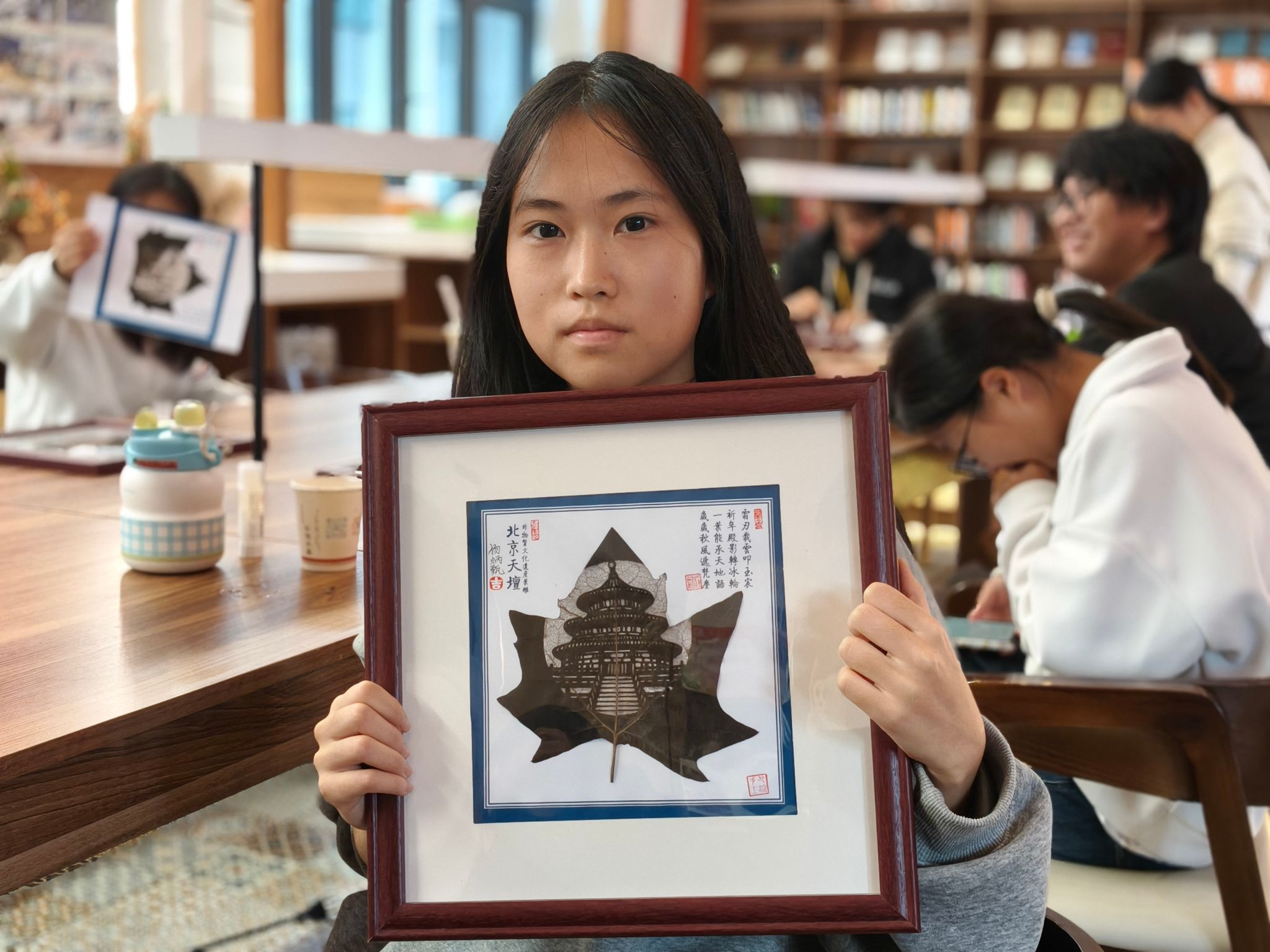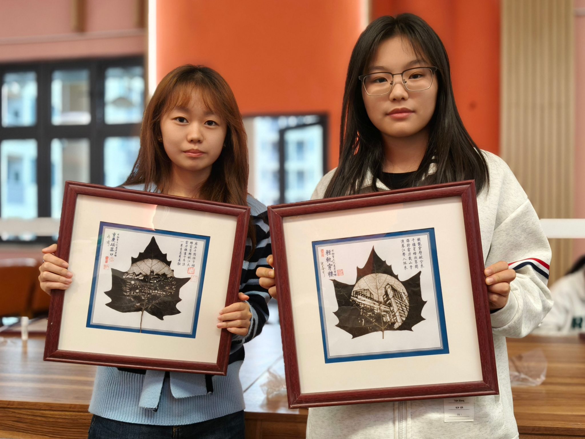 在理论讲解基础上,课程进入实操环节。同学们在李老师的指导下,结合“北京五景”“重庆十景”等特色风景元素,选取合适叶片,开始叶雕制作。大家先将树叶平整固定于白板,再将雕刻模板反向覆盖,细致调整至图案居中对齐,确保构图精准。