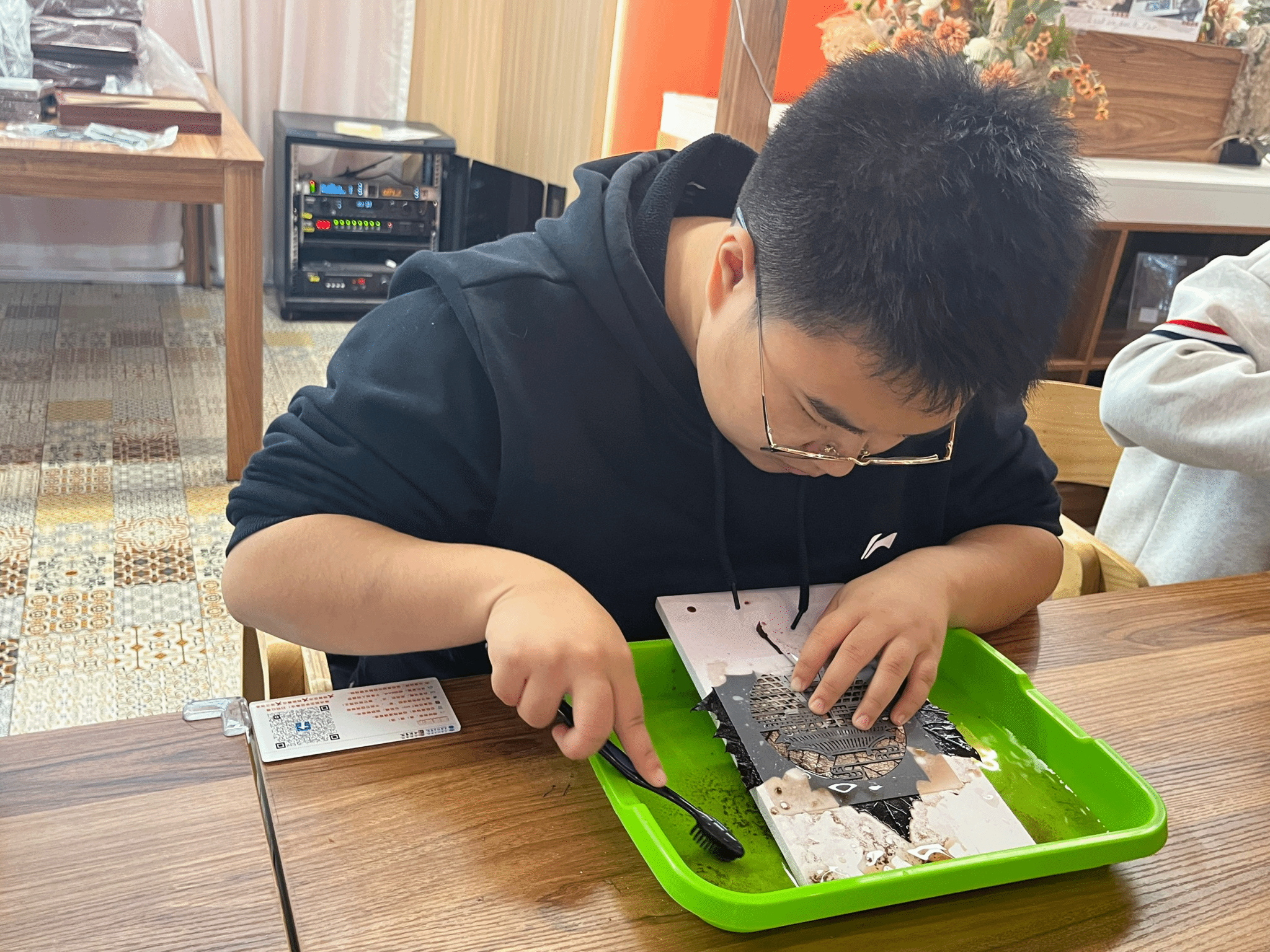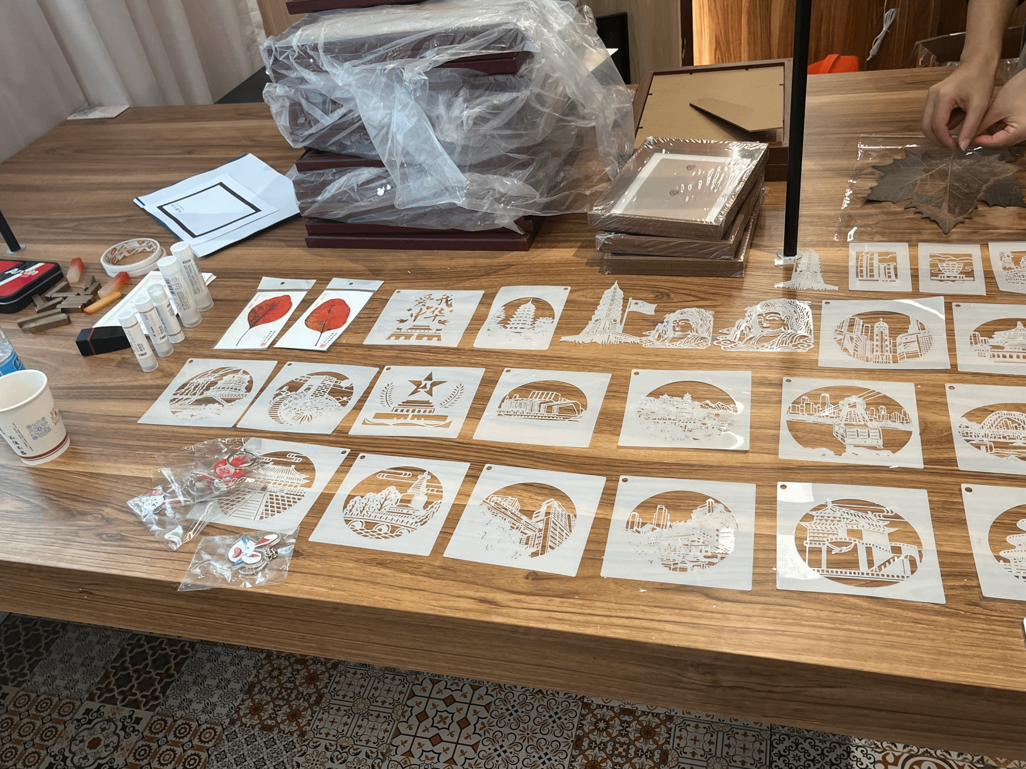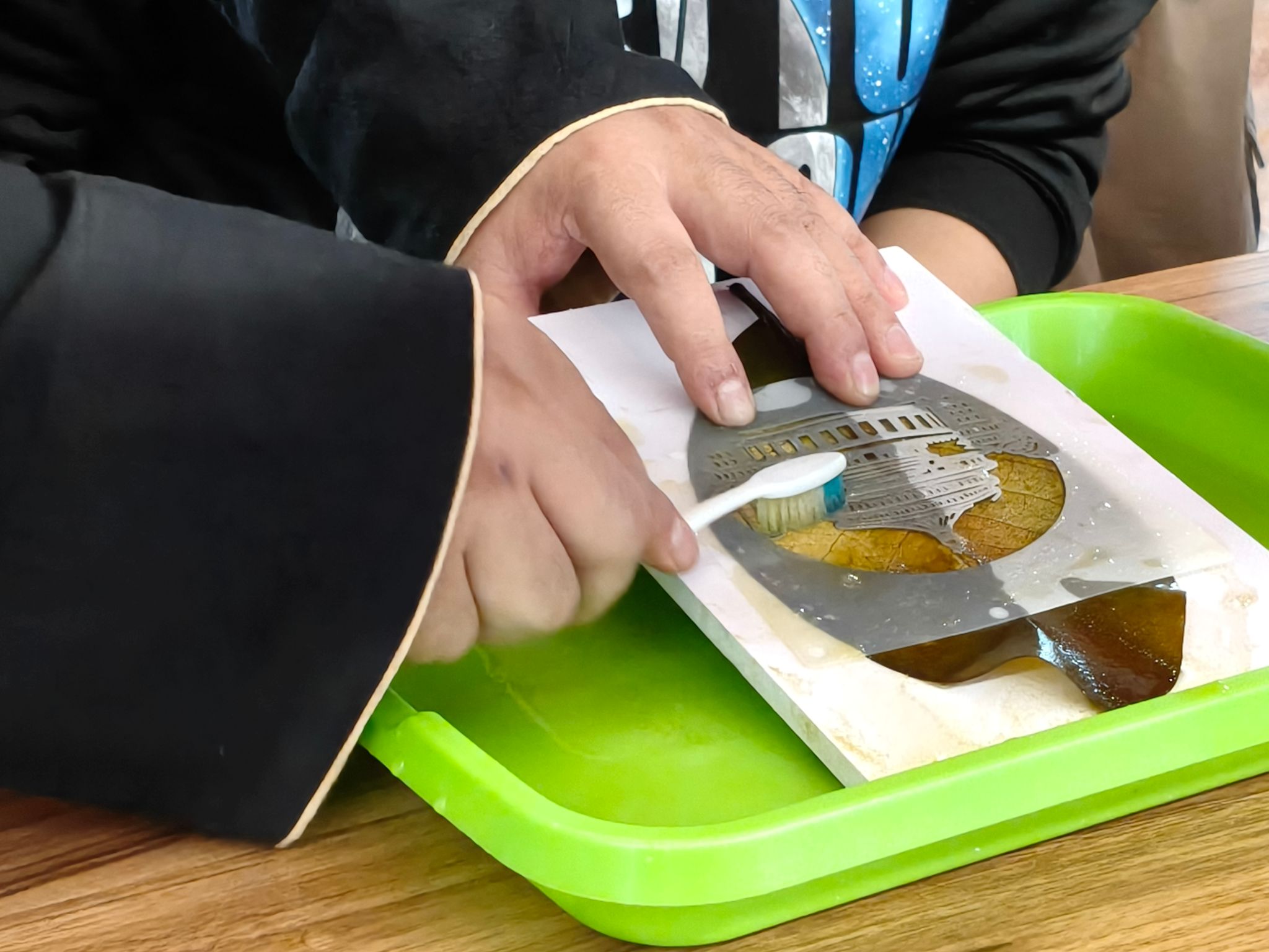 随后,学员们运用软毛刷在模板表面均匀轻刷,通过力度与方向的灵活控制,使图案逐渐清晰地呈现在叶面之上。