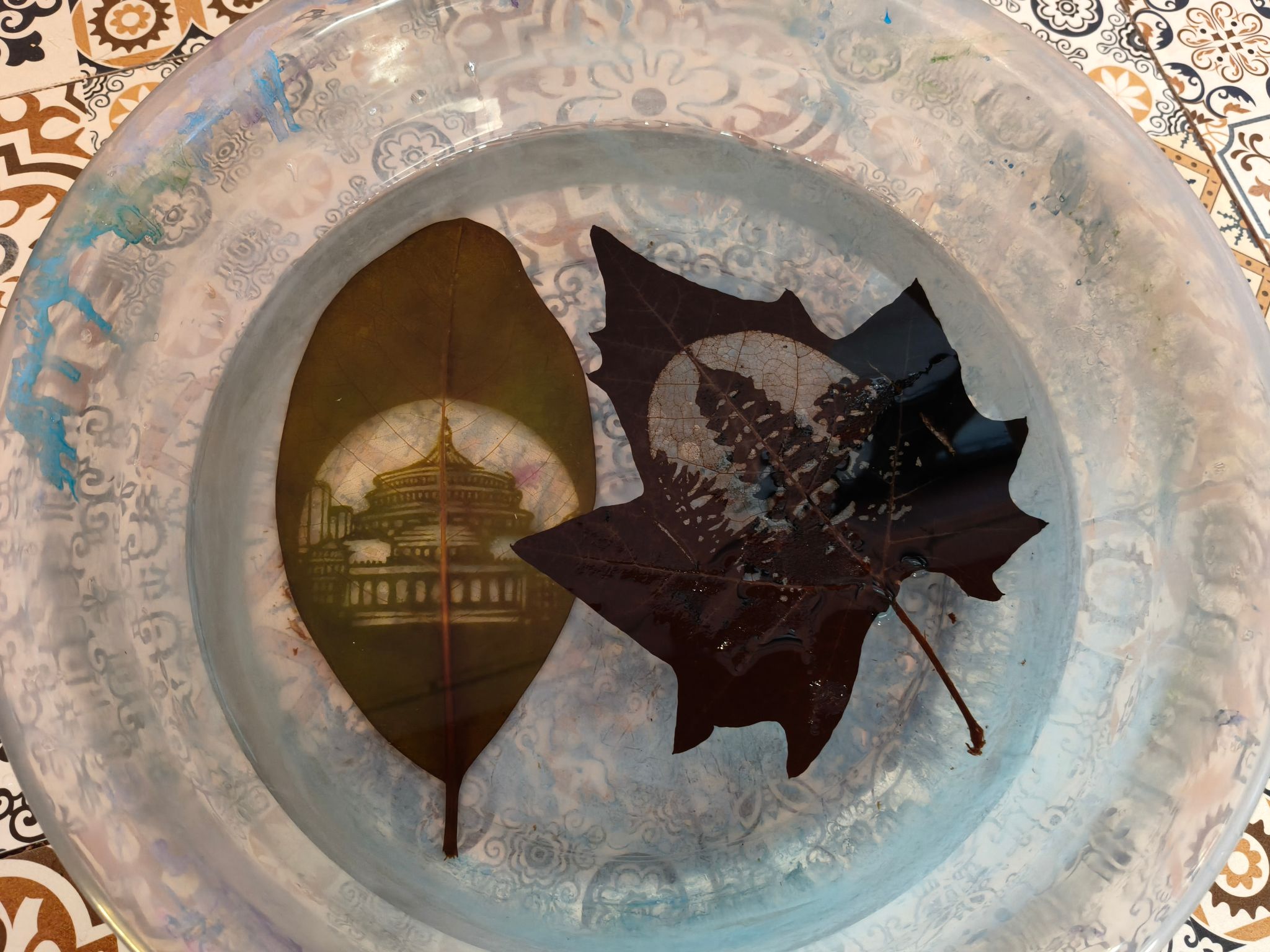 待叶脉纹理充分显露、图案透亮成型后,作品交由李老师通过专业设备进行烘干与压制定型。