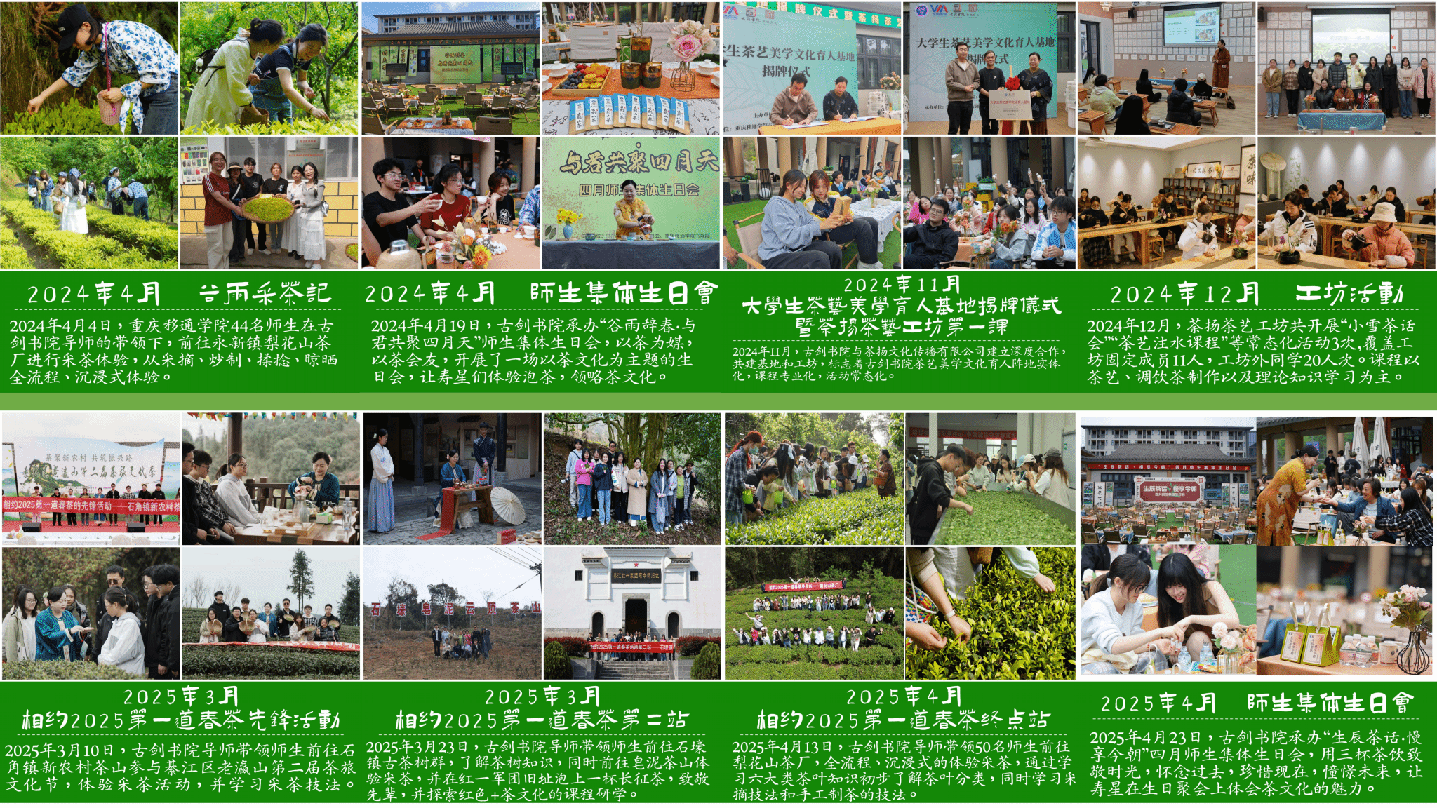 为持续深化茶艺美学实践育人体系,推动劳动育美与在地文化深度融合,古剑书院以“校地联动、文化美育、实践赋能”为核心,持续拓展茶艺美学实践场景与内涵。从綦江各地的茶山工坊开始,打造系列实践活动体系,逐步形成“技能习得—文化浸润—产业联动—国际传播”的完整育人链条,为乡村振兴与文化传承注入青春动能。