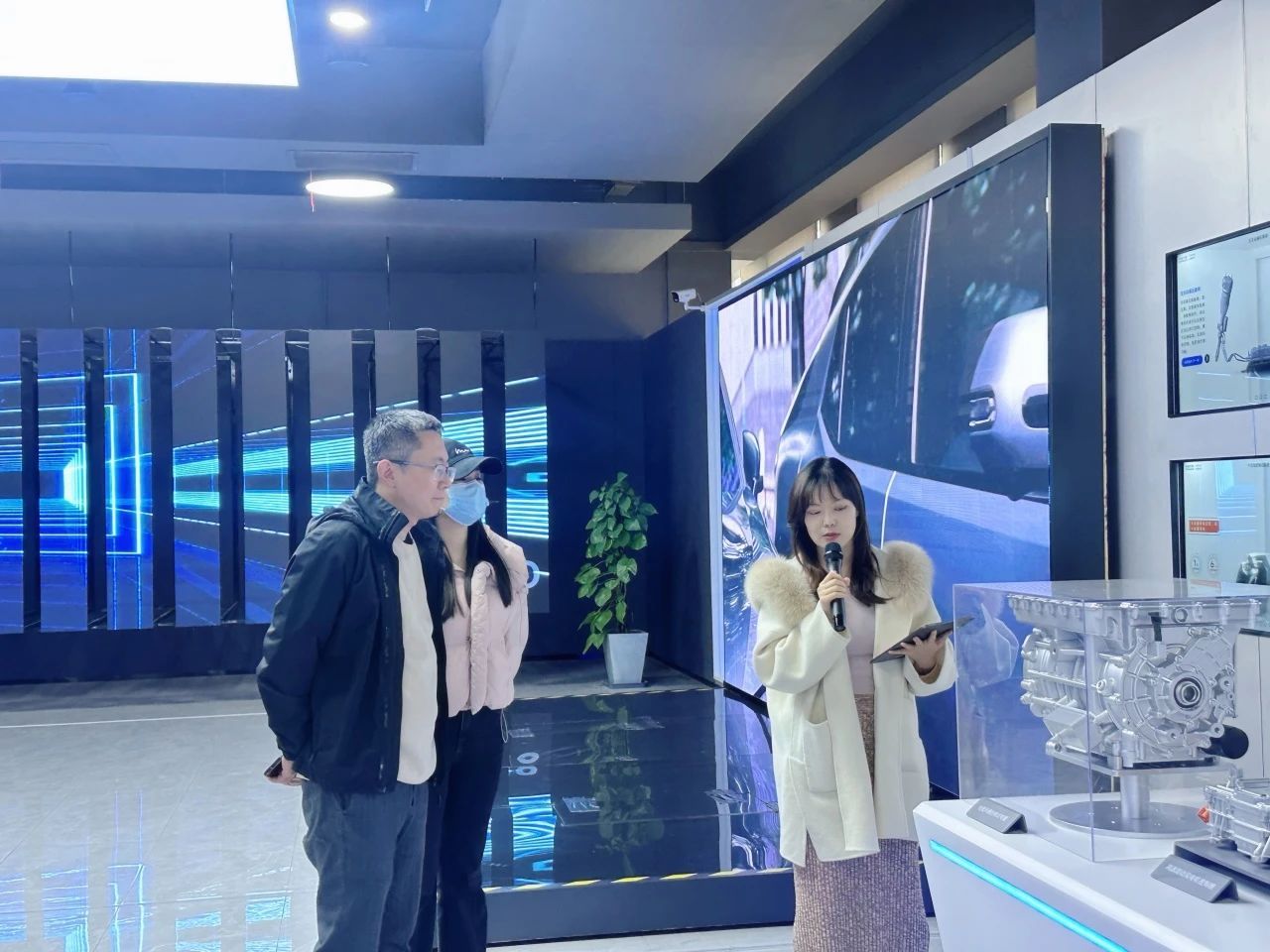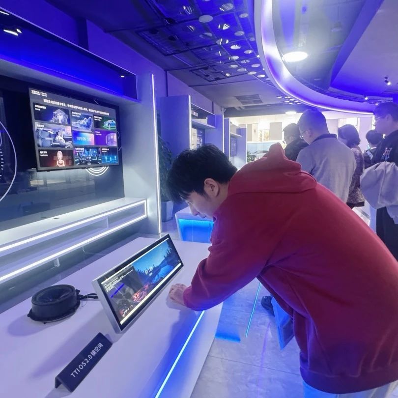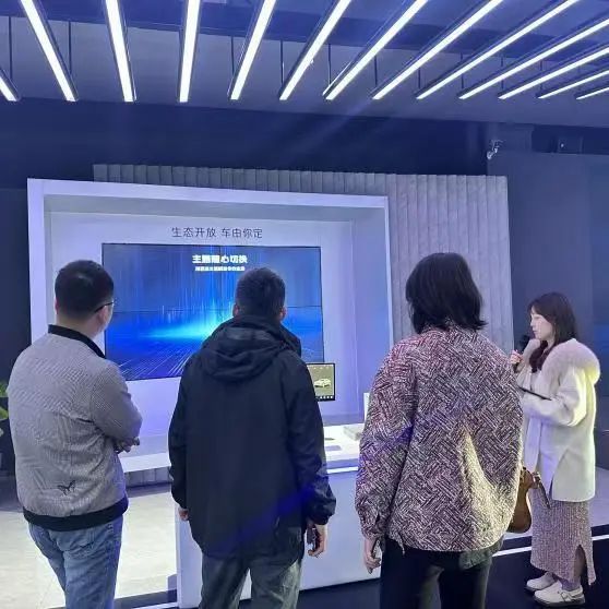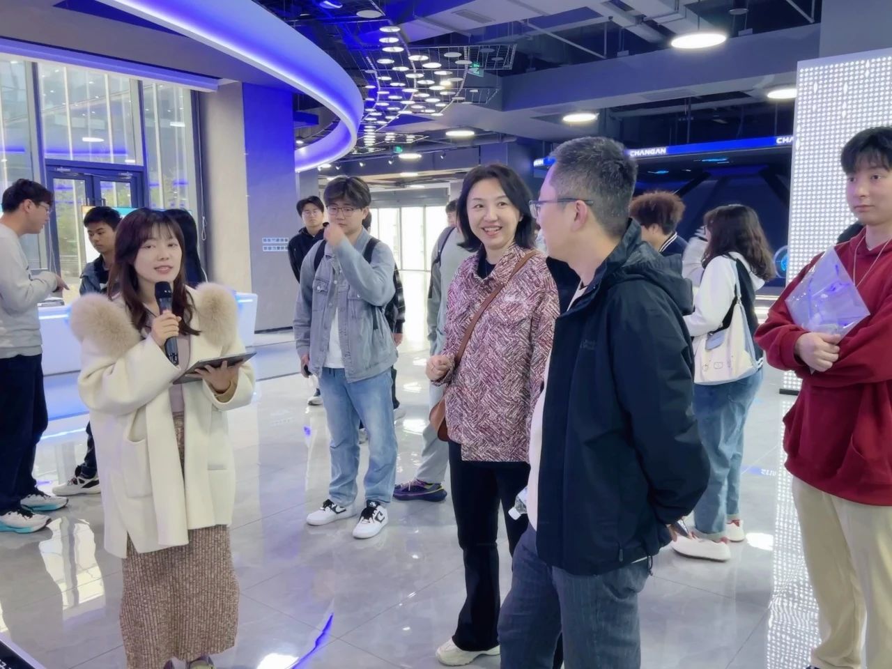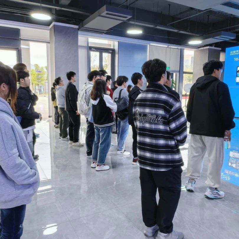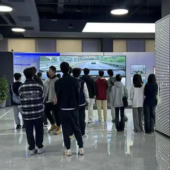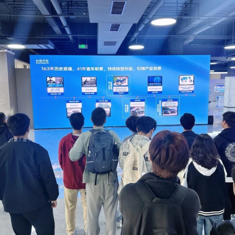 在长安科技园专业讲解员的引导下,师生依次参观了企业历史文化展厅、核心科技展区与智能汽车展馆。通过影像资料、实物模型及互动装置,同学们深入了解汽车工业百年脉动。从1862年上海洋炮局的工业火种,到新时代"香格里拉计划"的新能源蓝图;从蓝鲸动力平台的技术突破,到L4级自动驾驶的智慧跃迁。全息沙盘动态演绎"新四化"转型轨迹,数字孪生技术还原整车开发全流程,让课本中的工业4.0概念在智能总装线上生动呈现。