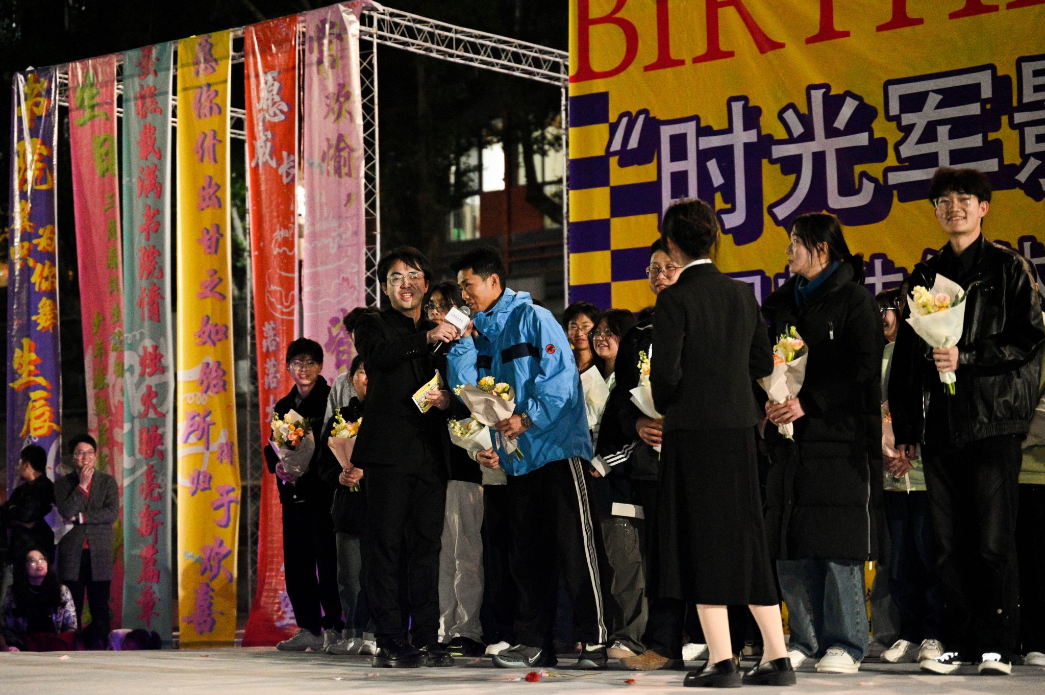 随着社团表演落幕,一场精心设计的“时空指令”突然启动。“全体注意!念到名字的老师和同学请立刻上台!”主持人掷地有声的宣告引发全场期待。当被点名的师生略带忐忑列队时,背景音乐突然切换,高达五米的生日主题喷绘与祝福帷幔瞬间落下,3月师生集体生日会惊喜揭幕!“惊喜不惊喜!意外不意外!”主持人携漫天彩带登场,台下欢呼如浪潮涌动,台上寿星们从错愕到惊喜,有学生捂嘴泪目:“以为要挨训,结果收到全场的祝福,这反转太破防了!”在随机采访环节,一位寿星动情表示:“很感动!很惊喜!很移通!很完满!”