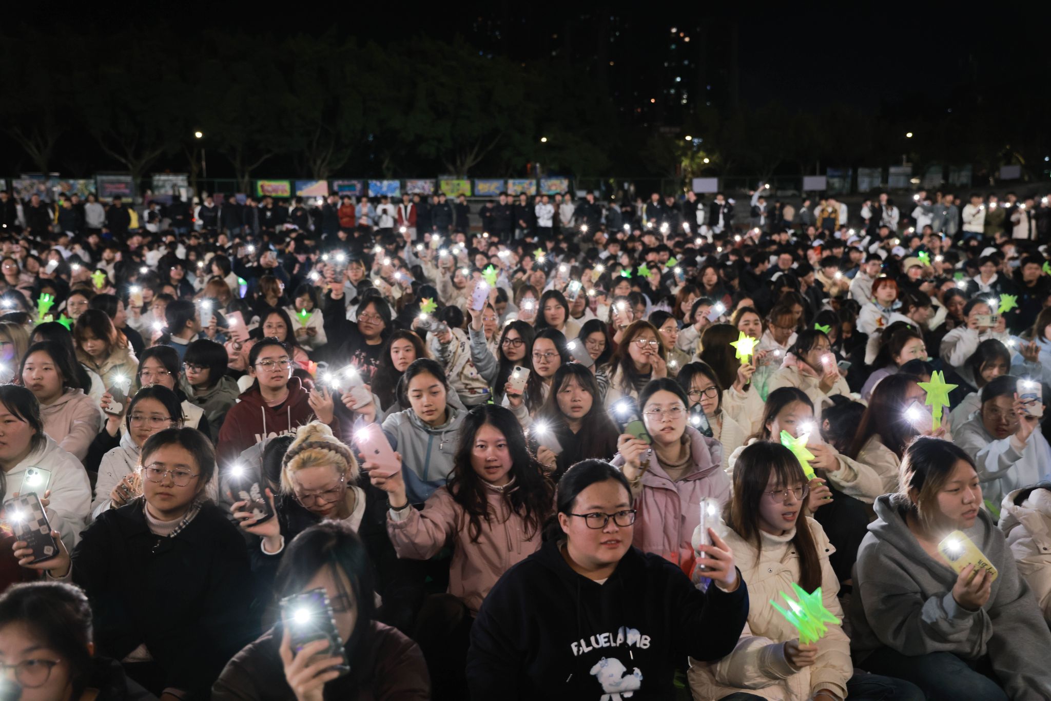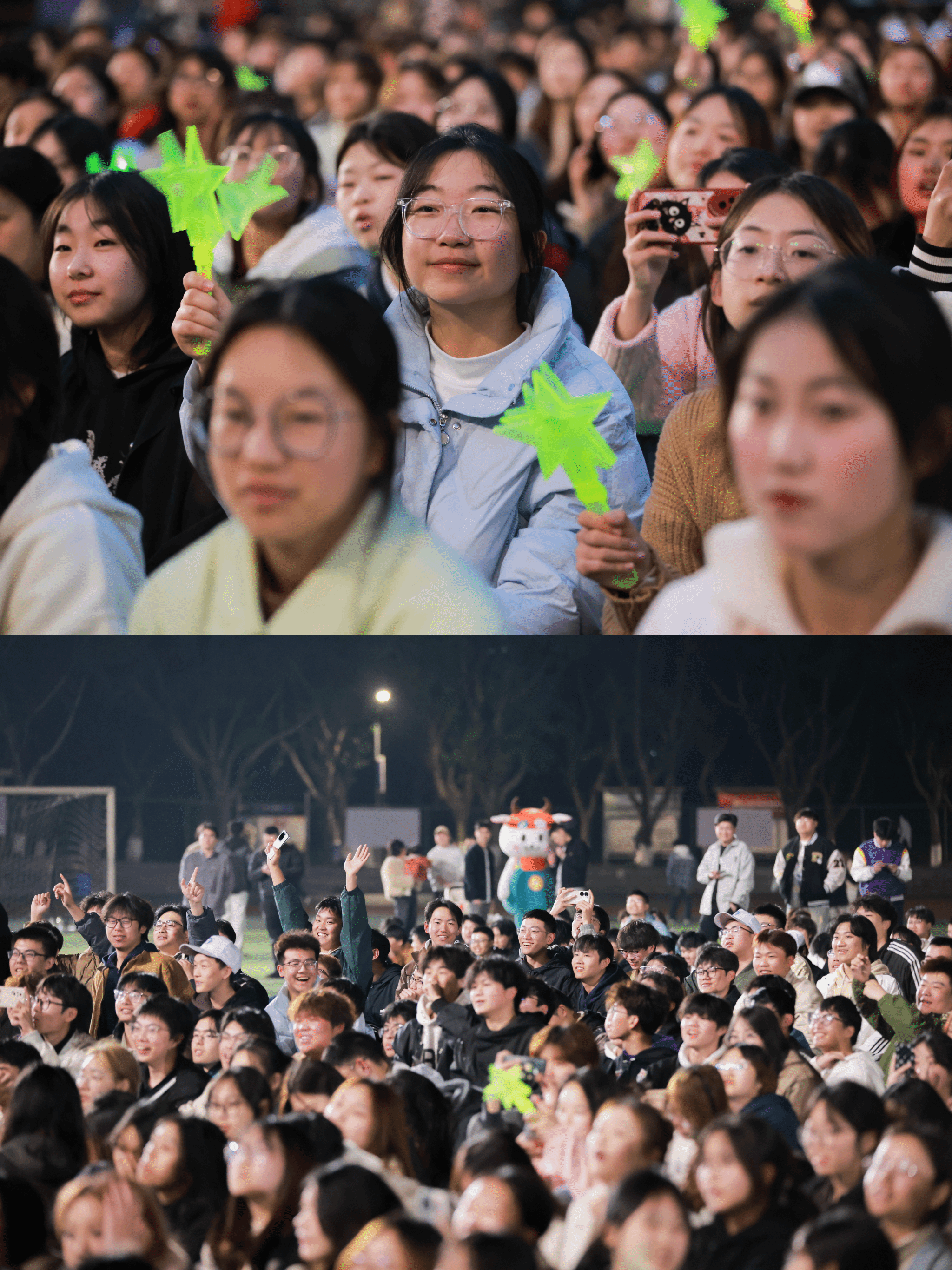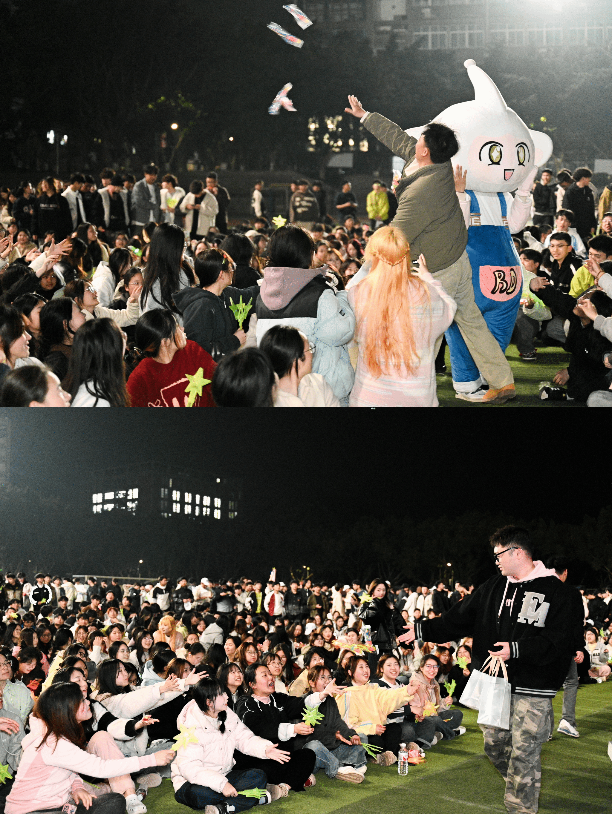 各书院萌力全开的吉祥物团队突然从观众席“空降”现场,与五千余名师生展开热情互动,当特制的星空糖果与飞天弹弓热闹分发时,此起彼伏的欢呼声瞬间点燃移通的夜空。随着《生日快乐》旋律响起,长达2米的“巨无霸”蛋糕在追光灯下缓缓登场,寿星们共点蜡烛,纷纷双手合十、闭目许愿、齐声祝福的瞬间,焰火直冲夜空,书院旗帜迎风狂舞,将氛围推向高潮。“对所有的烦恼说拜拜,对所有的快乐说嗨嗨,亲爱的亲爱的生日快乐,每一天都精彩”5000人的共唱生日歌堪比演唱会现场,当千余枚彩色弹弓载着愿望划破天际,有新生兴奋喊道:“这绝对是年度最酷的许愿方式!”