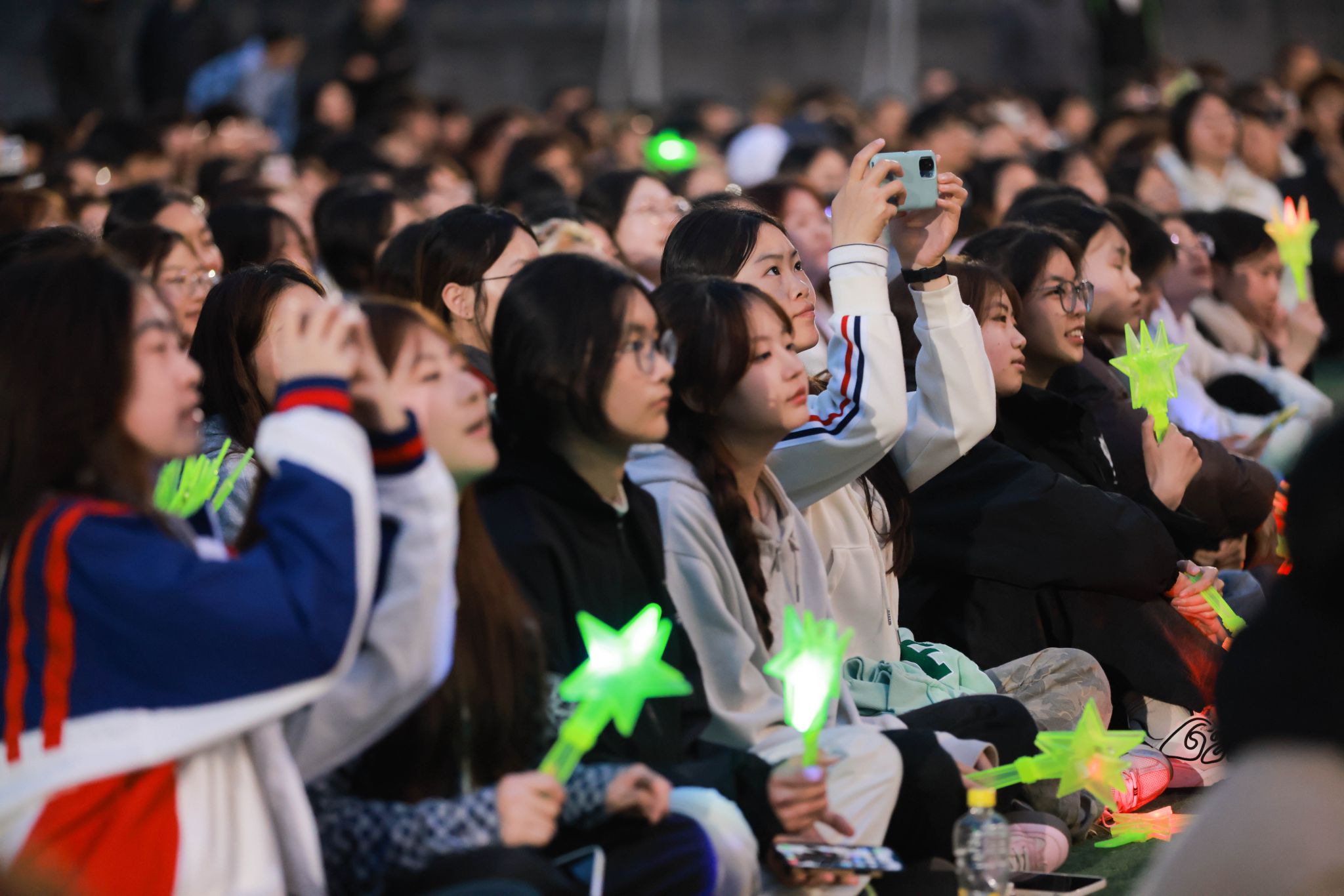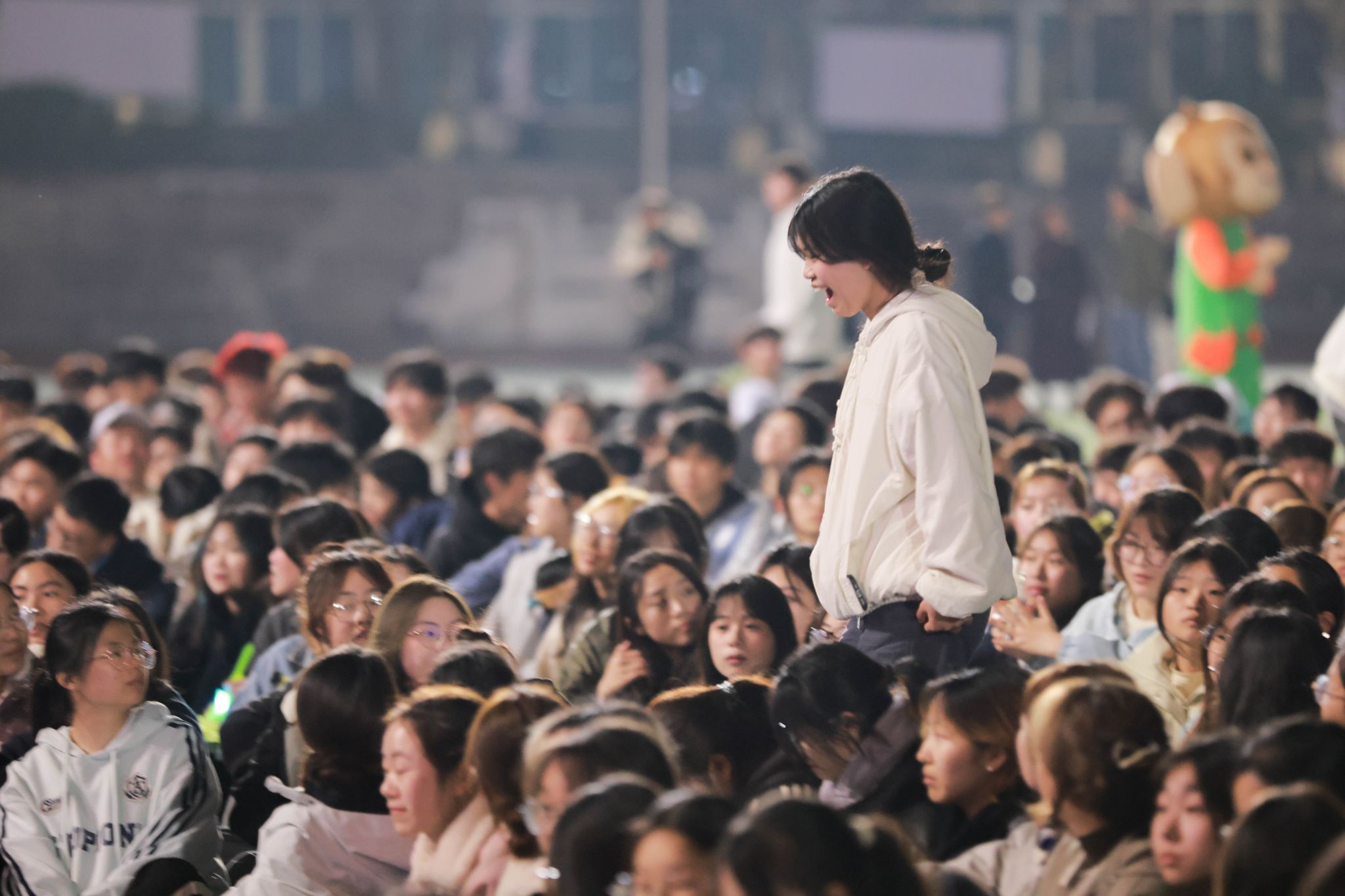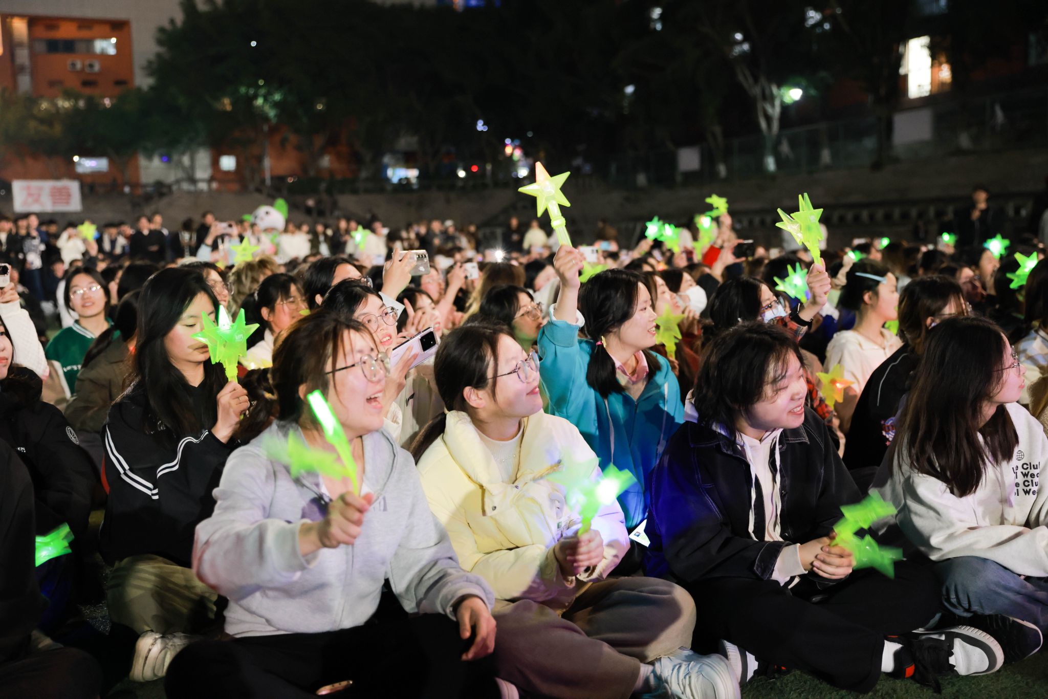 各书院萌力全开的吉祥物团队突然从观众席“空降”现场,与五千余名师生展开热情互动,当特制的星空糖果与飞天弹弓热闹分发时,此起彼伏的欢呼声瞬间点燃移通的夜空。随着《生日快乐》旋律响起,长达2米的“巨无霸”蛋糕在追光灯下缓缓登场,寿星们共点蜡烛,纷纷双手合十、闭目许愿、齐声祝福的瞬间,焰火直冲夜空,书院旗帜迎风狂舞,将氛围推向高潮。“对所有的烦恼说拜拜,对所有的快乐说嗨嗨,亲爱的亲爱的生日快乐,每一天都精彩”5000人的共唱生日歌堪比演唱会现场,当千余枚彩色弹弓载着愿望划破天际,有新生兴奋喊道:“这绝对是年度最酷的许愿方式!”