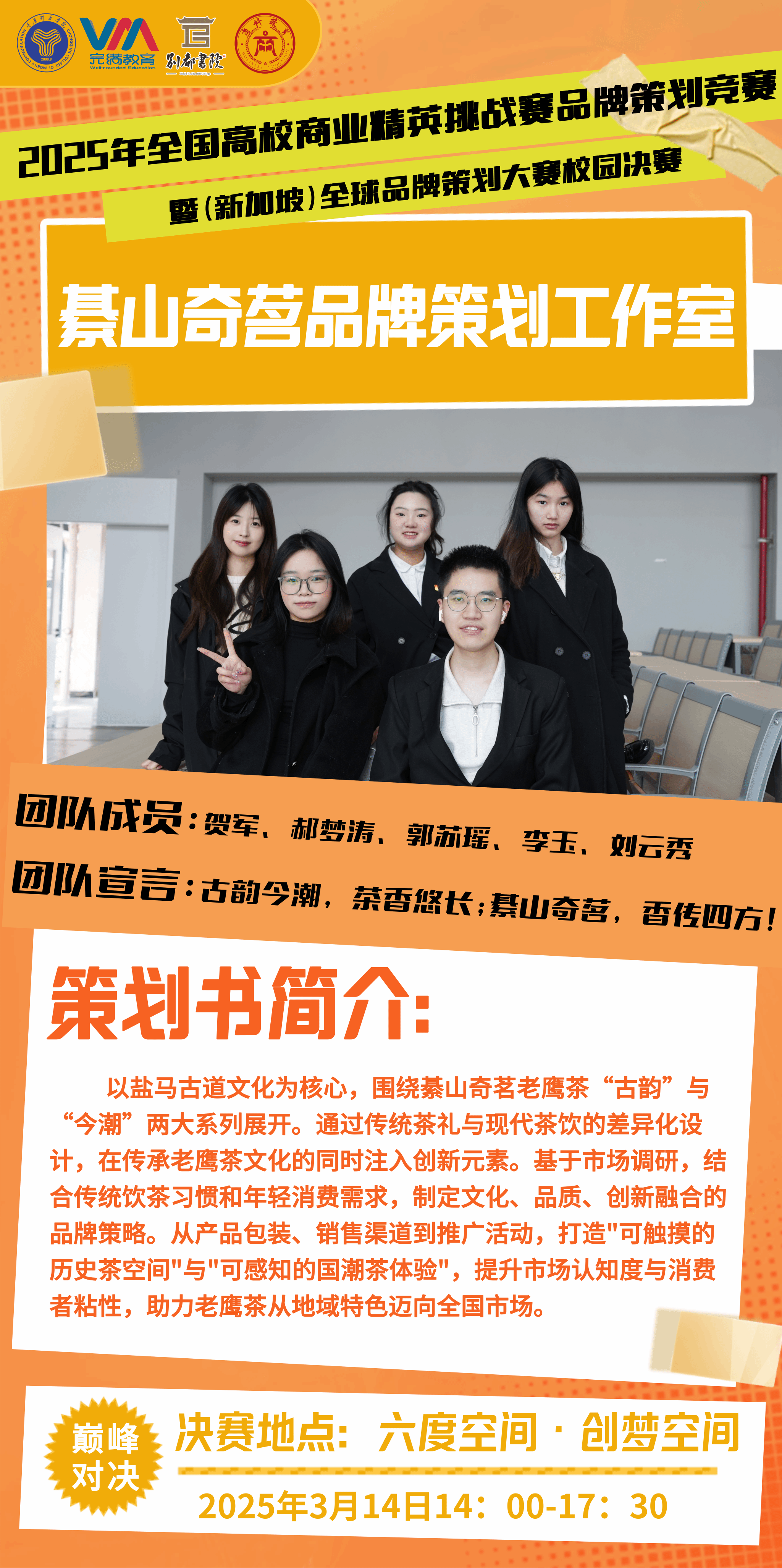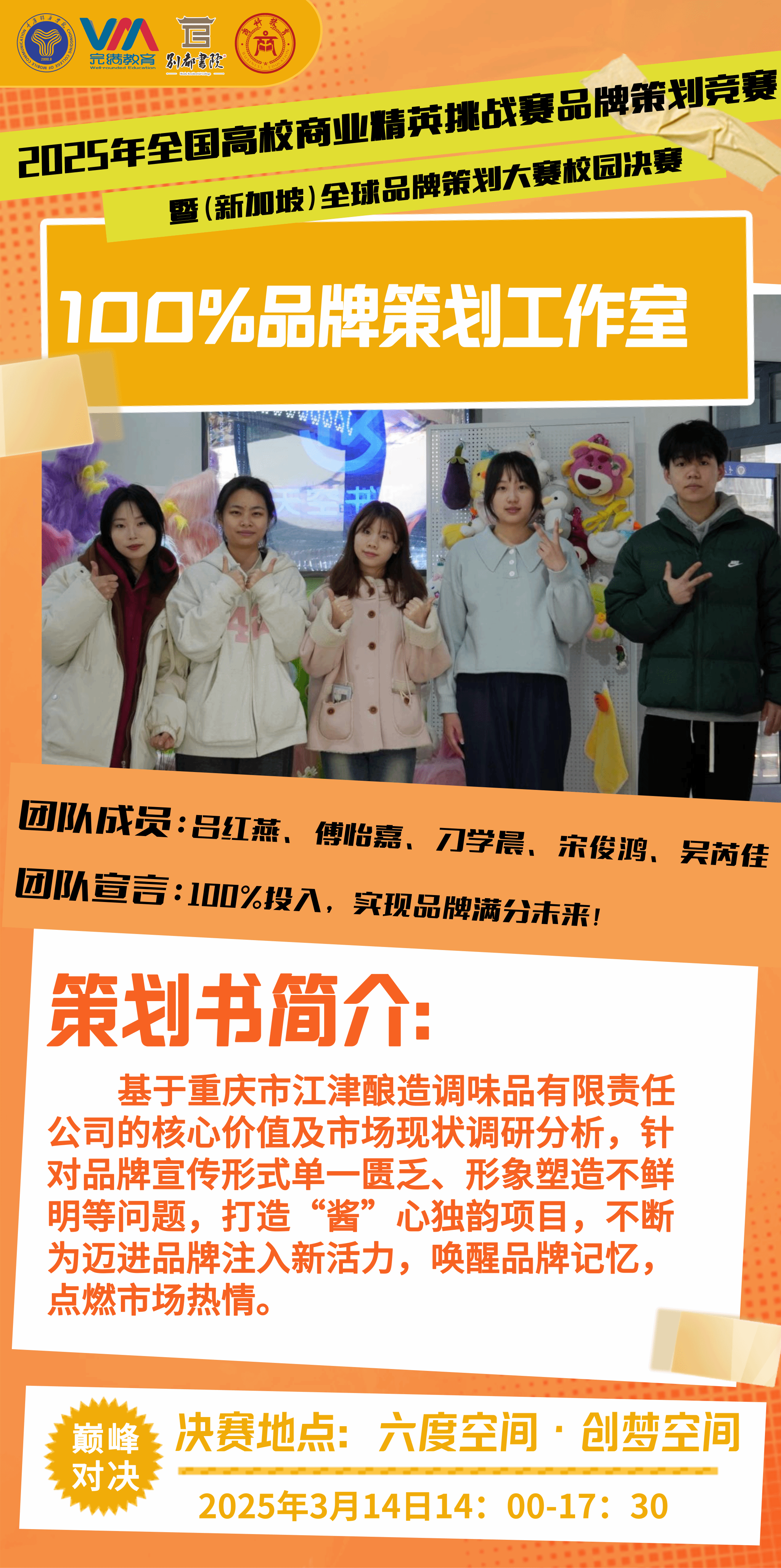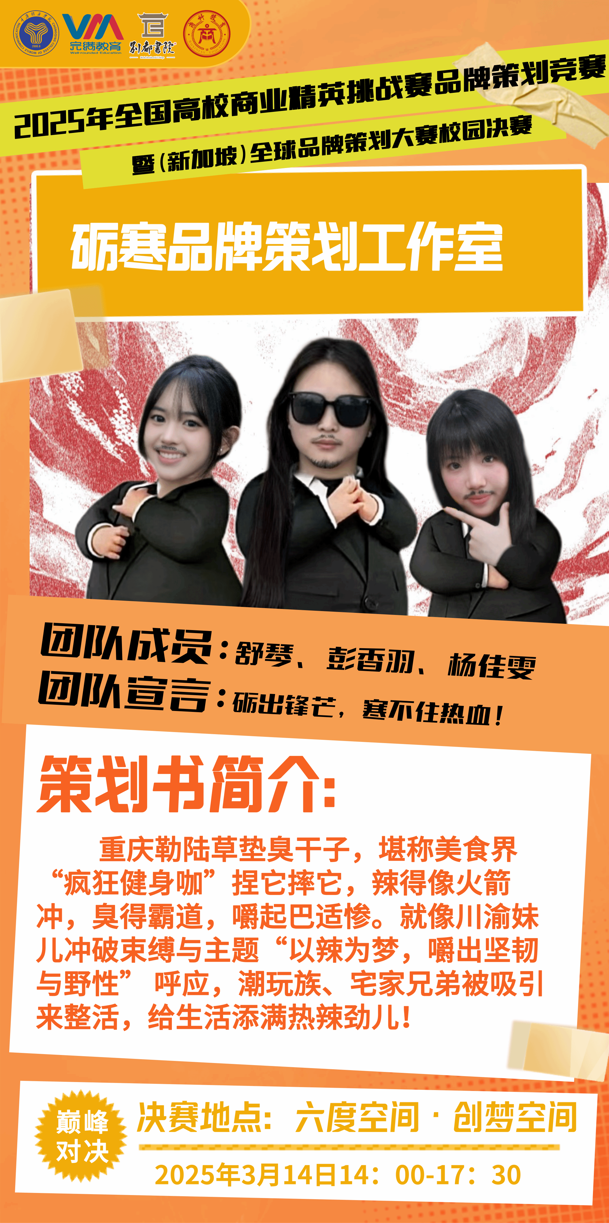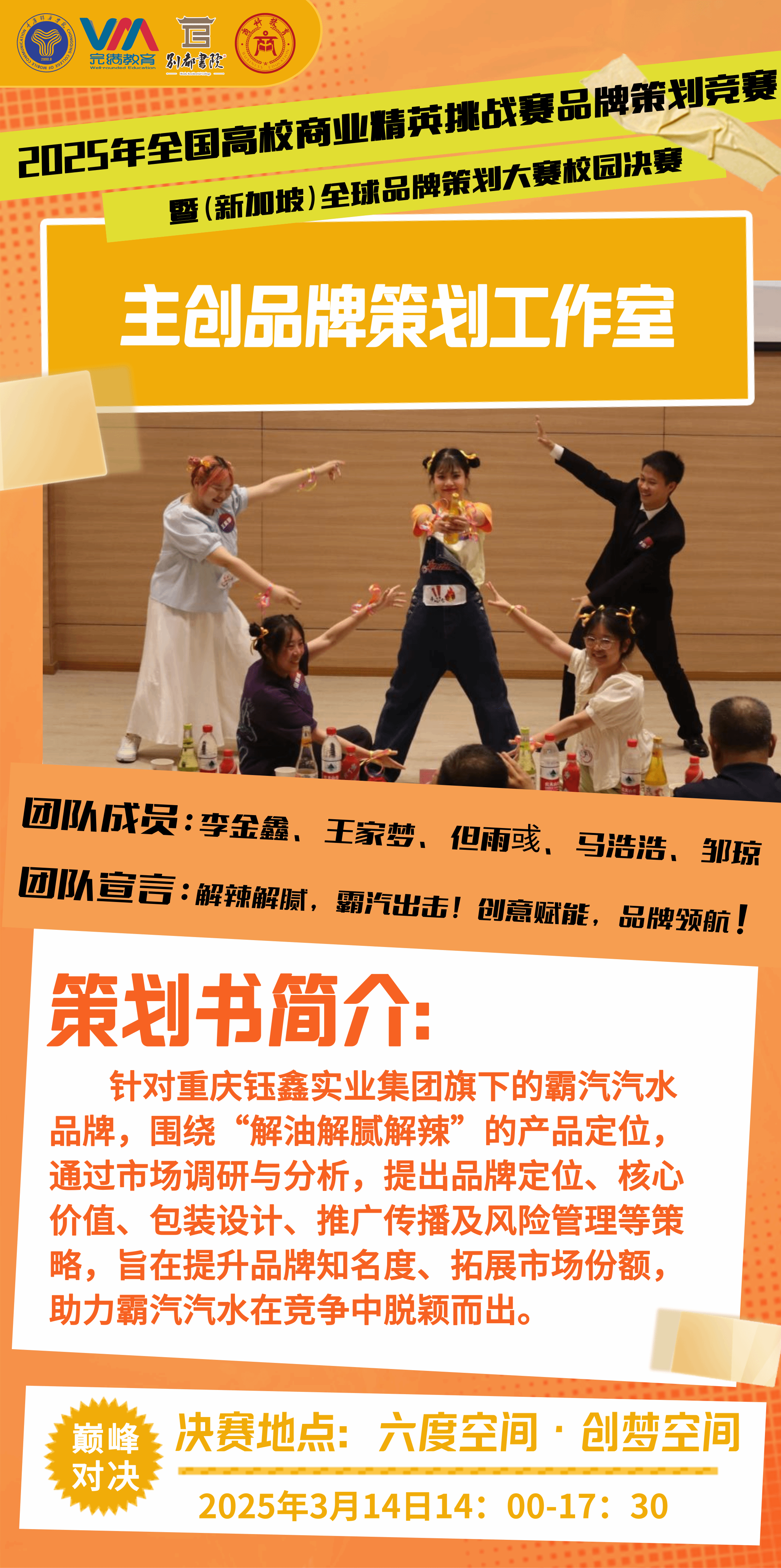 为贯彻落实我校“信息产业商学院”办学定位及“四位一体双院制 +特色课程”人才培养模式,培养数字经济时代高情商经营管理人才,由重庆移通学院别都书院、新商科教学部商业基础课程教研室联合承办的2025年全国高校商业精英挑战赛品牌策划竞赛暨(新加坡)全球品牌策划大赛校内选拔赛决赛将于2025年3月14日14:00在六度空间创梦空间燃爆登场,争夺全国预选赛入场券!