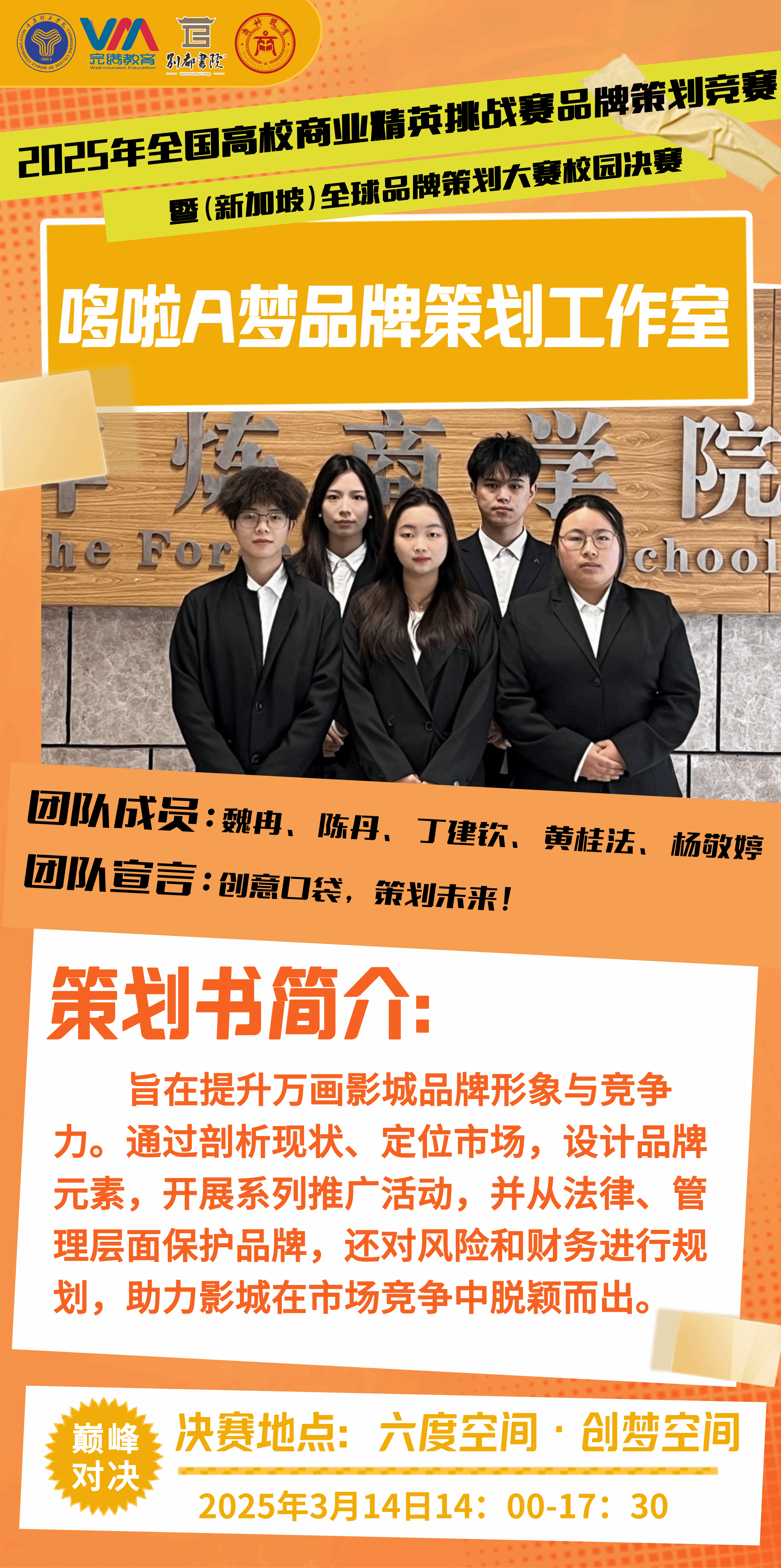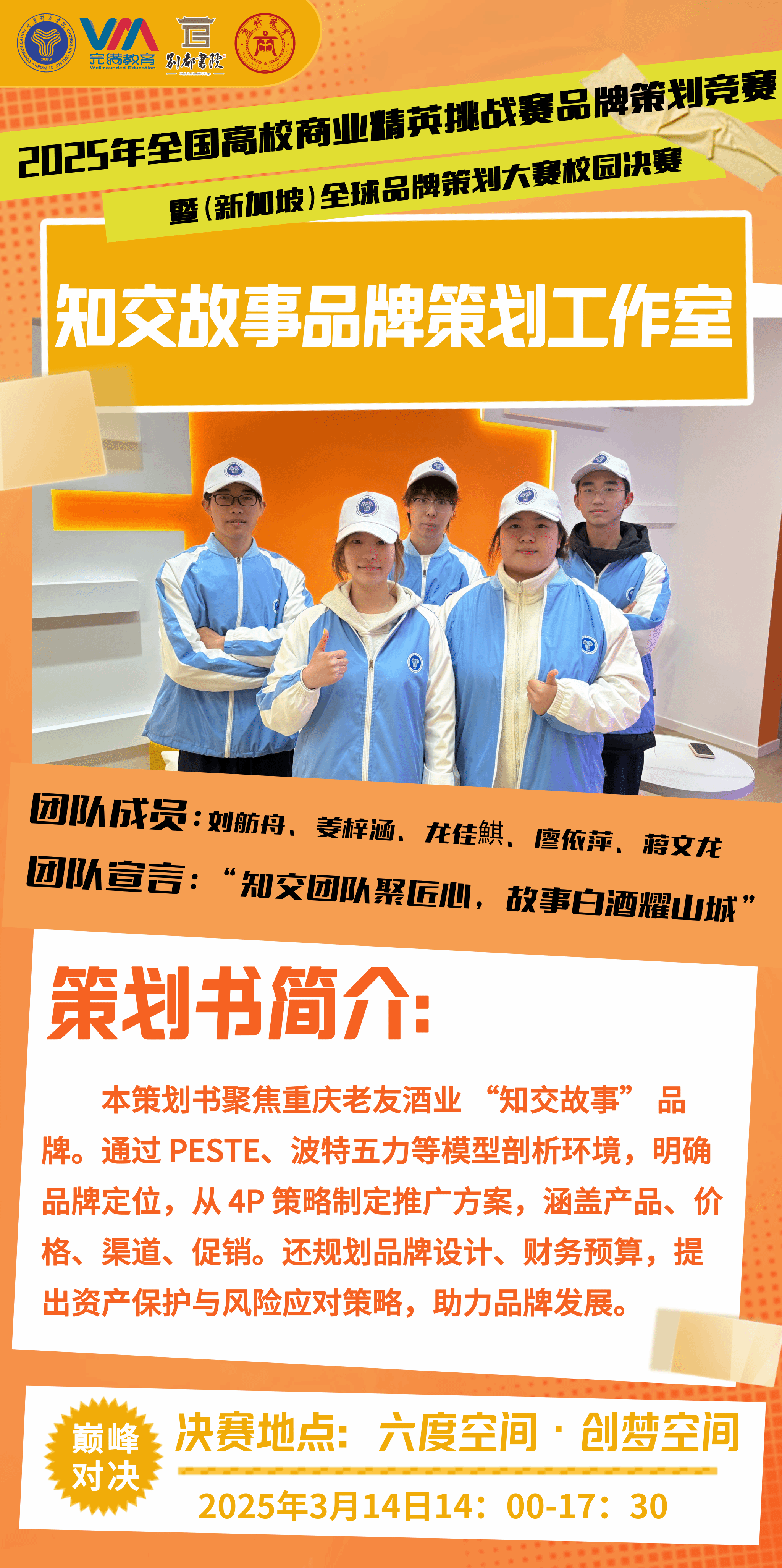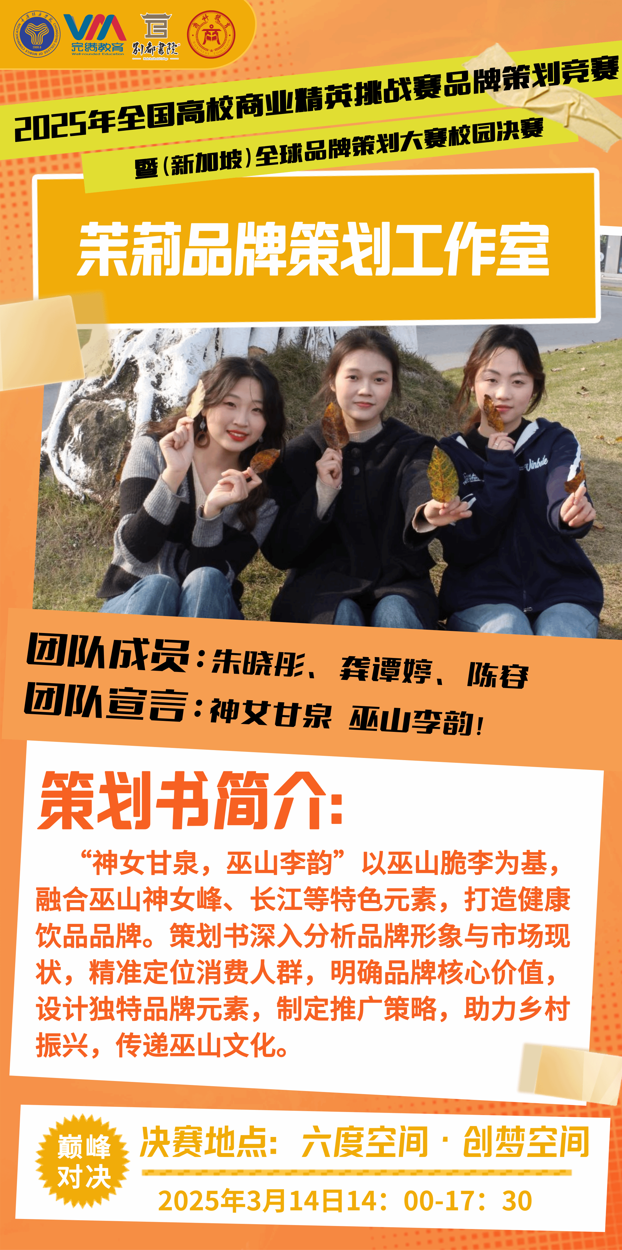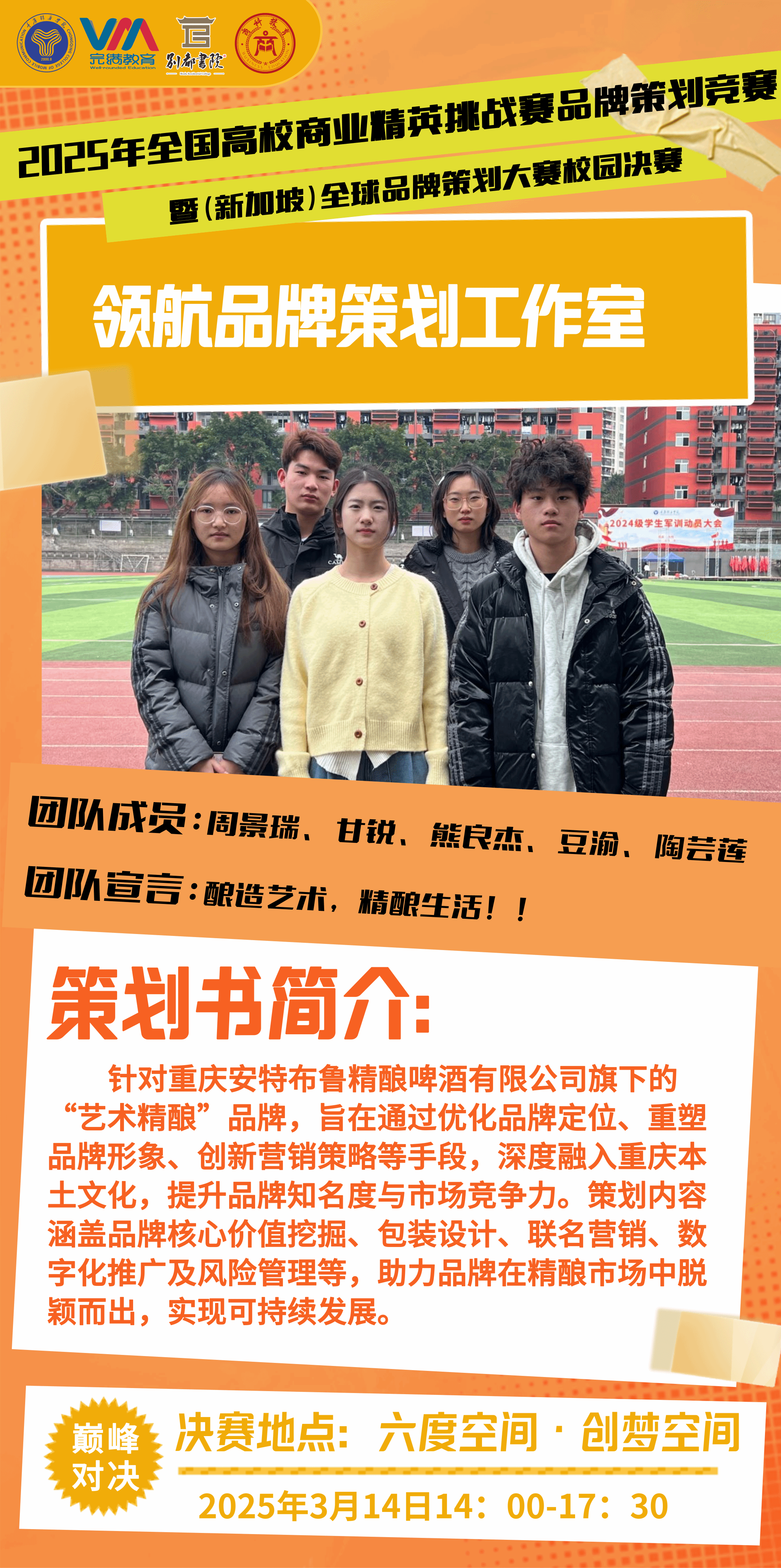 为贯彻落实我校“信息产业商学院”办学定位及“四位一体双院制 +特色课程”人才培养模式,培养数字经济时代高情商经营管理人才,由重庆移通学院别都书院、新商科教学部商业基础课程教研室联合承办的2025年全国高校商业精英挑战赛品牌策划竞赛暨(新加坡)全球品牌策划大赛校内选拔赛决赛将于2025年3月14日14:00在六度空间创梦空间燃爆登场,争夺全国预选赛入场券!