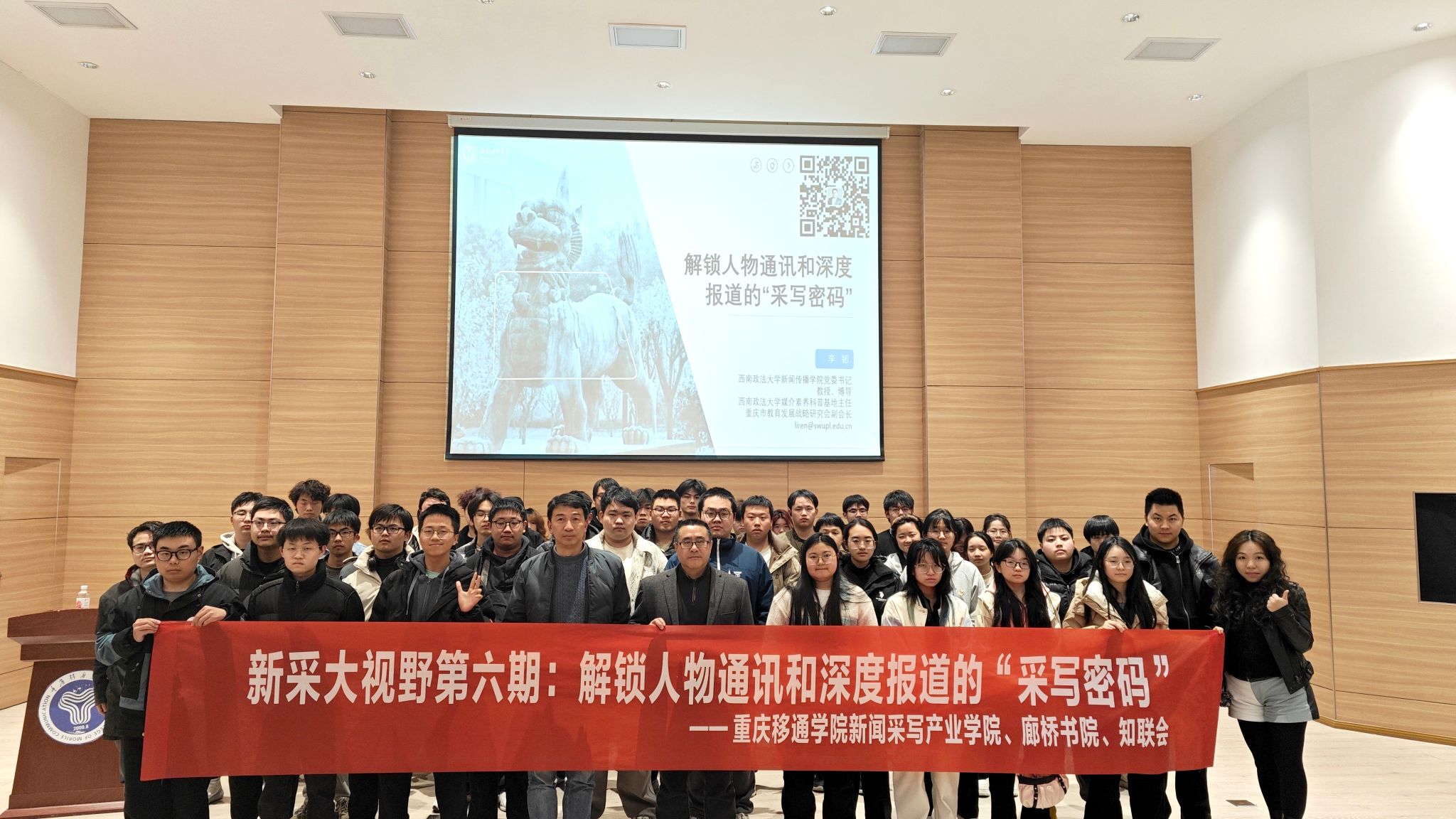 3月19日晚,由重庆移通学院新闻采写学院、廊桥书院、党外知识分子联谊会联合主办”新采大视野”系列讲座第六期在六度空间创梦空间火热开讲。来自西南政法大学新闻传播学院党委书记、博士生导师李韧教授,以”人物通讯与深度报道的采写密码”为主题,为近百名师生带来一场干货满满的分享。这场讲座,旨在帮助更多有志于在新闻采写领域发展及感兴趣的同学们,提供一个集学习、交流于一体的平台,助力同学们在新闻采写领域探寻前行路径。
