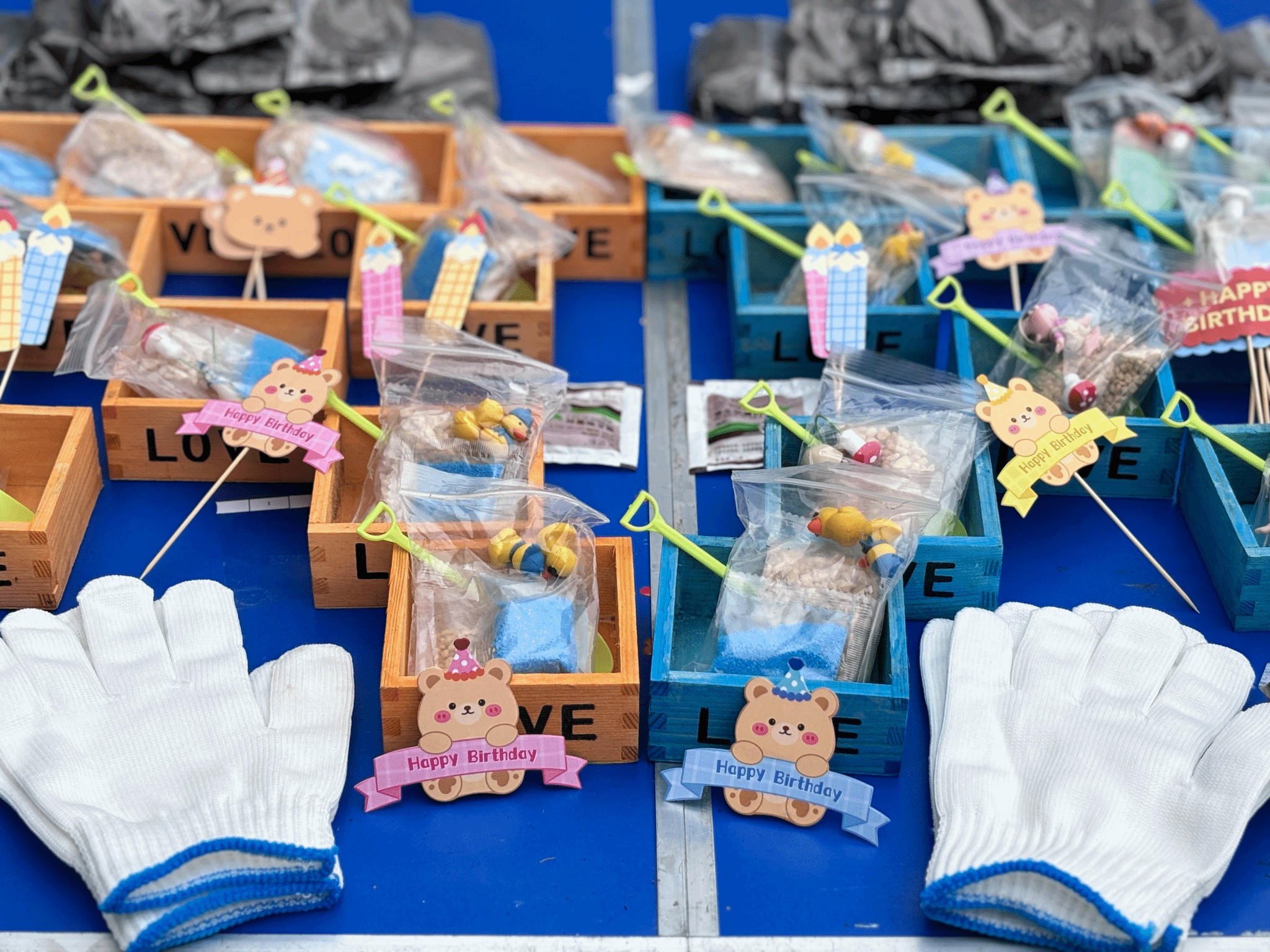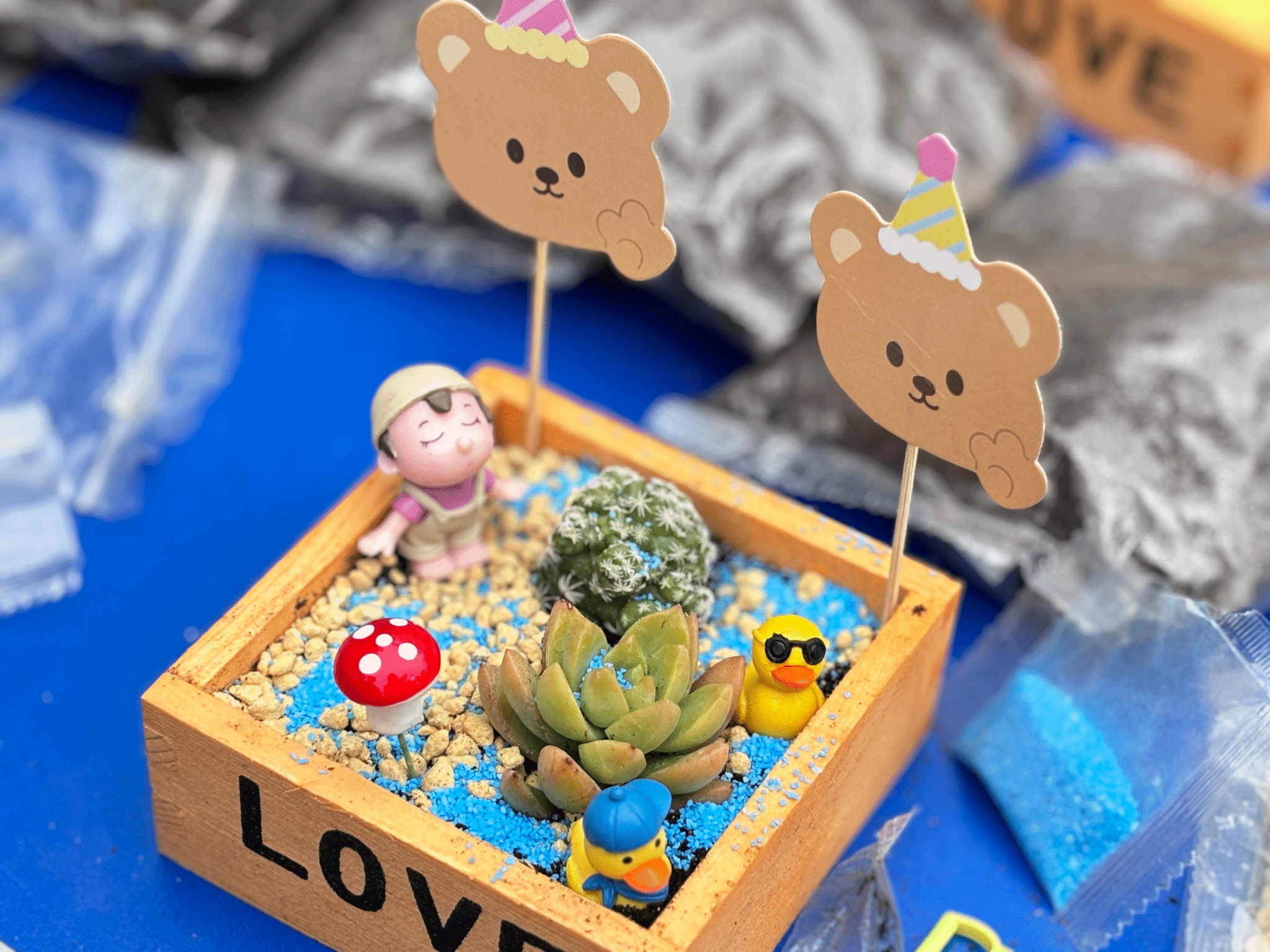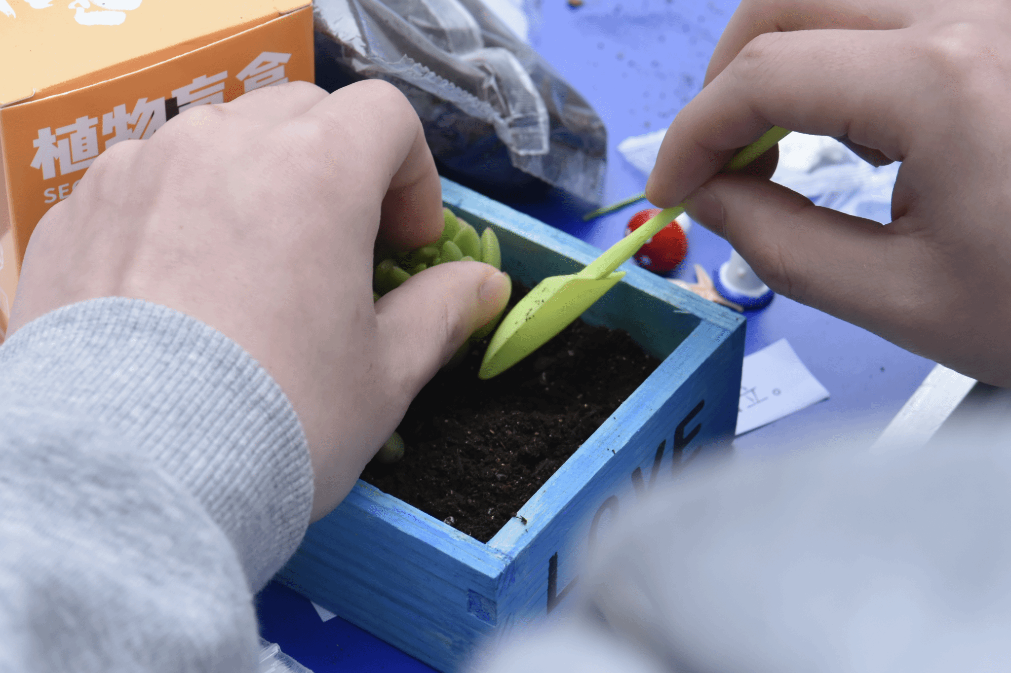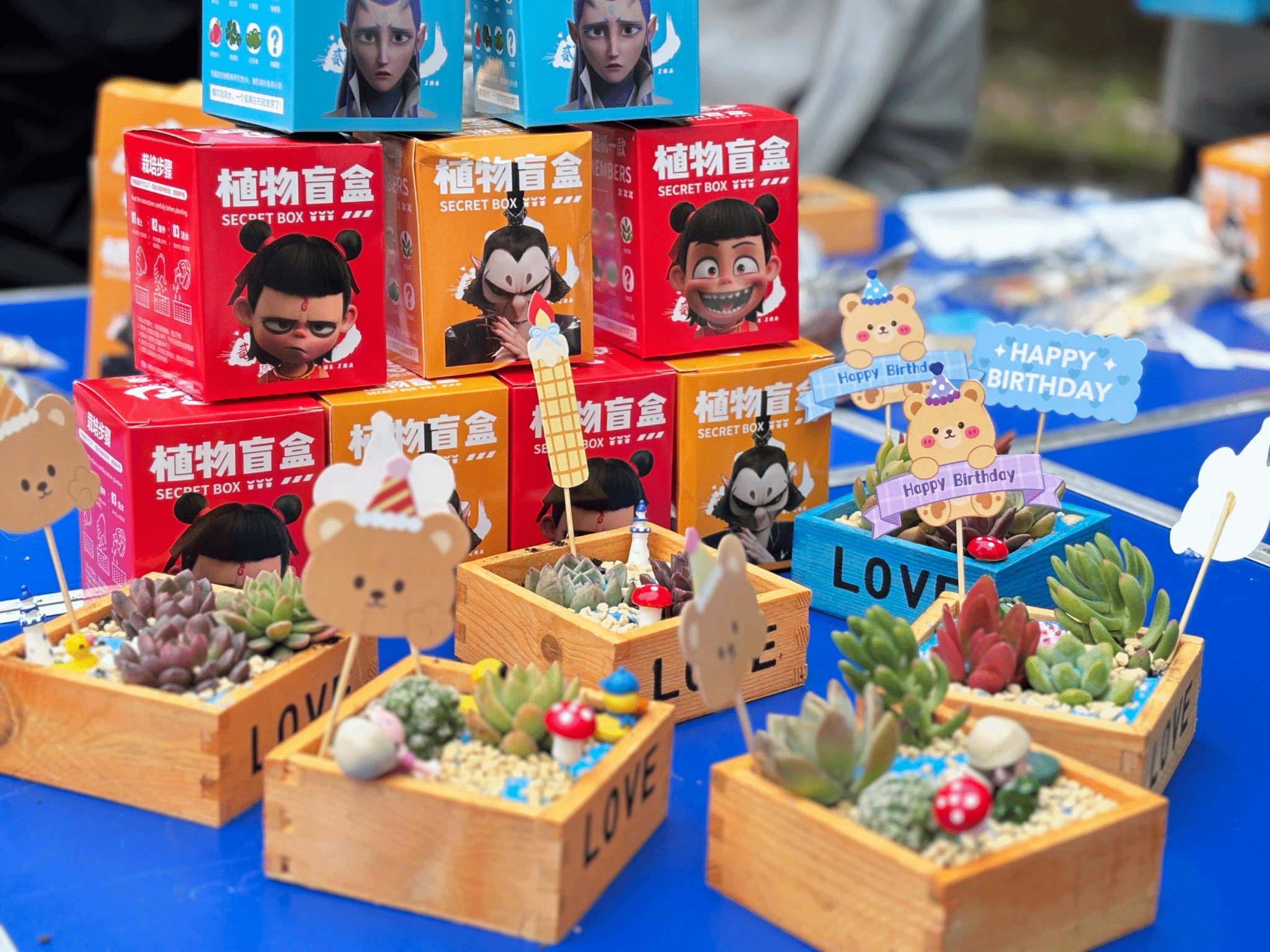 完成签到后,参与者"植物盲盒配对" 的游戏将现场氛围再度拔高,每个参与者都领取到了一盆编号绿植和谜语线索卡,通过谜语卡中的线索寻找绿植主人,进行组队。随后,同学们发挥奇思妙想自由装饰自己的微景观生态瓶,完成了本次生日会属于自己的第一个纪念品。