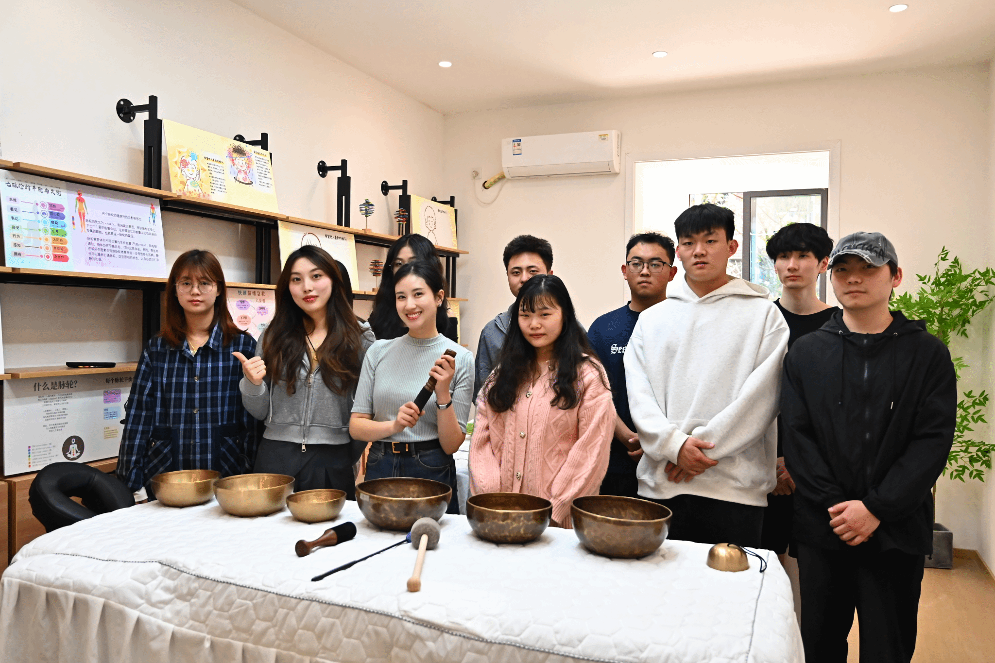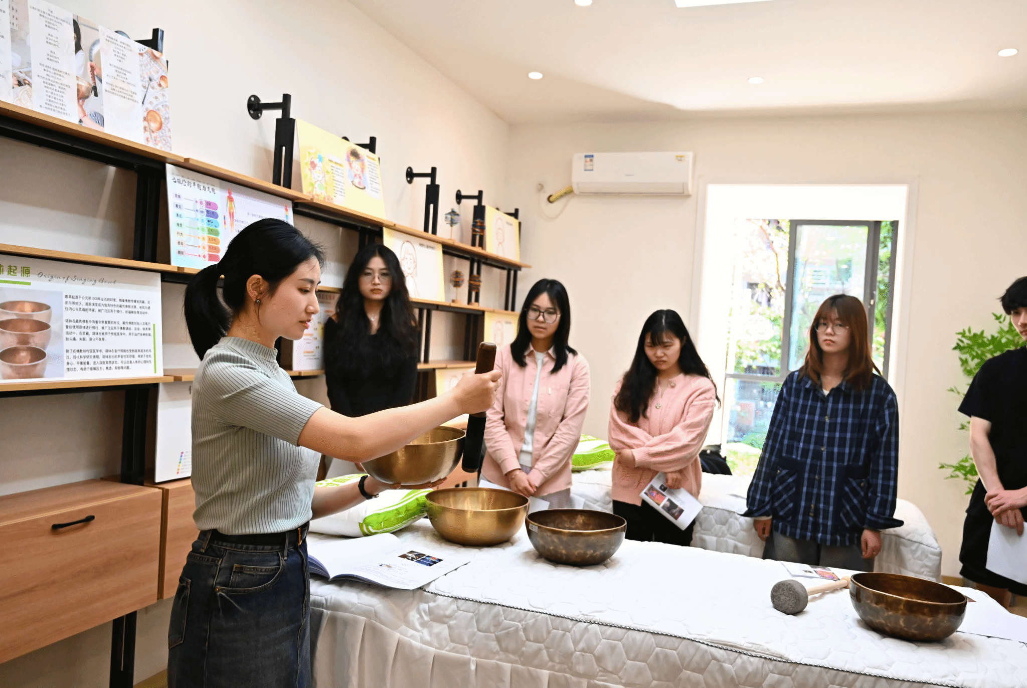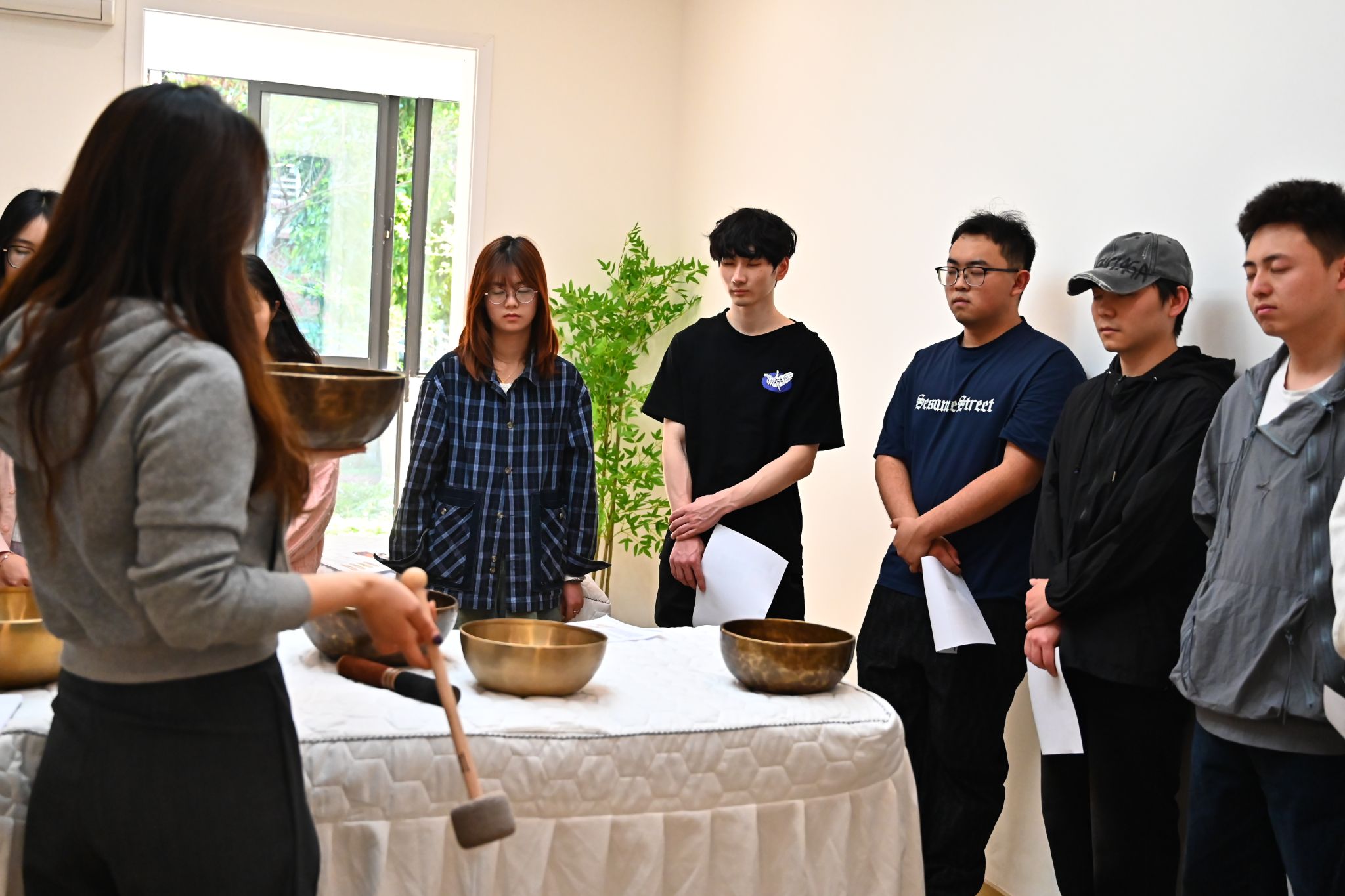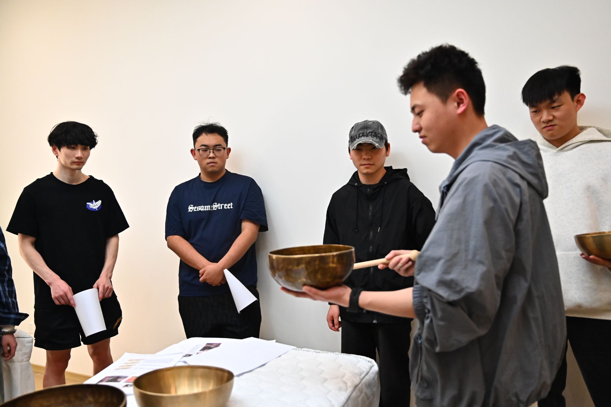 在实践环节,赵晨老师带领学生体验了颂钵疗愈的操作流程,包括如何正确摆放颂钵、选择适合的敲击工具,以及掌握敲击和旋转动作的力度与节奏。她还特别强调了“专注力”的重要性:“在进行疗愈时,专注于声音和振动是关键,这不仅能够帮助自己进入冥想状态,也能为他人提供更有效的支持。”