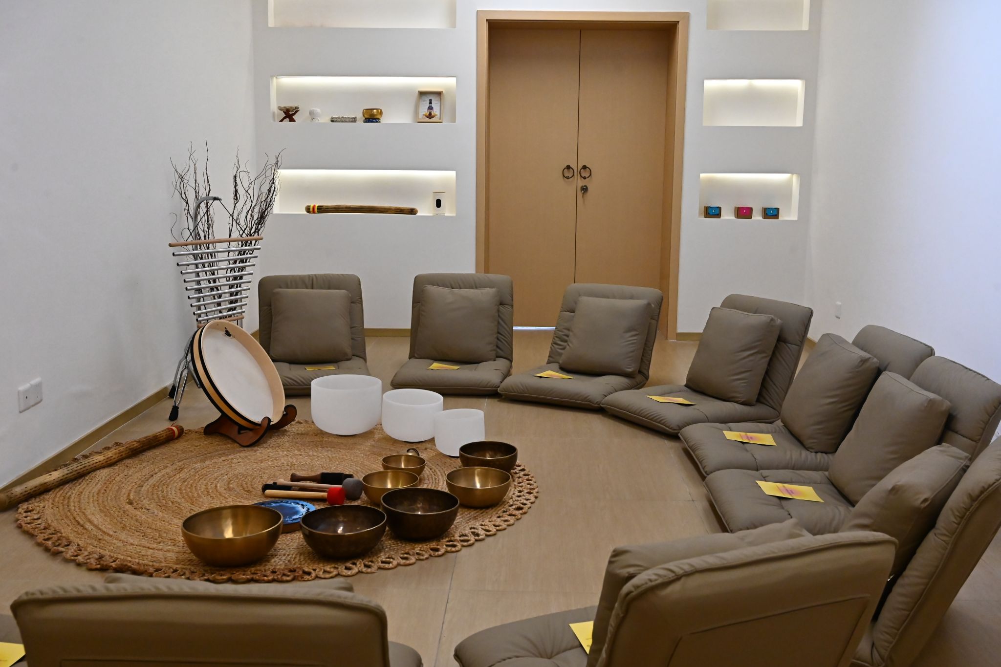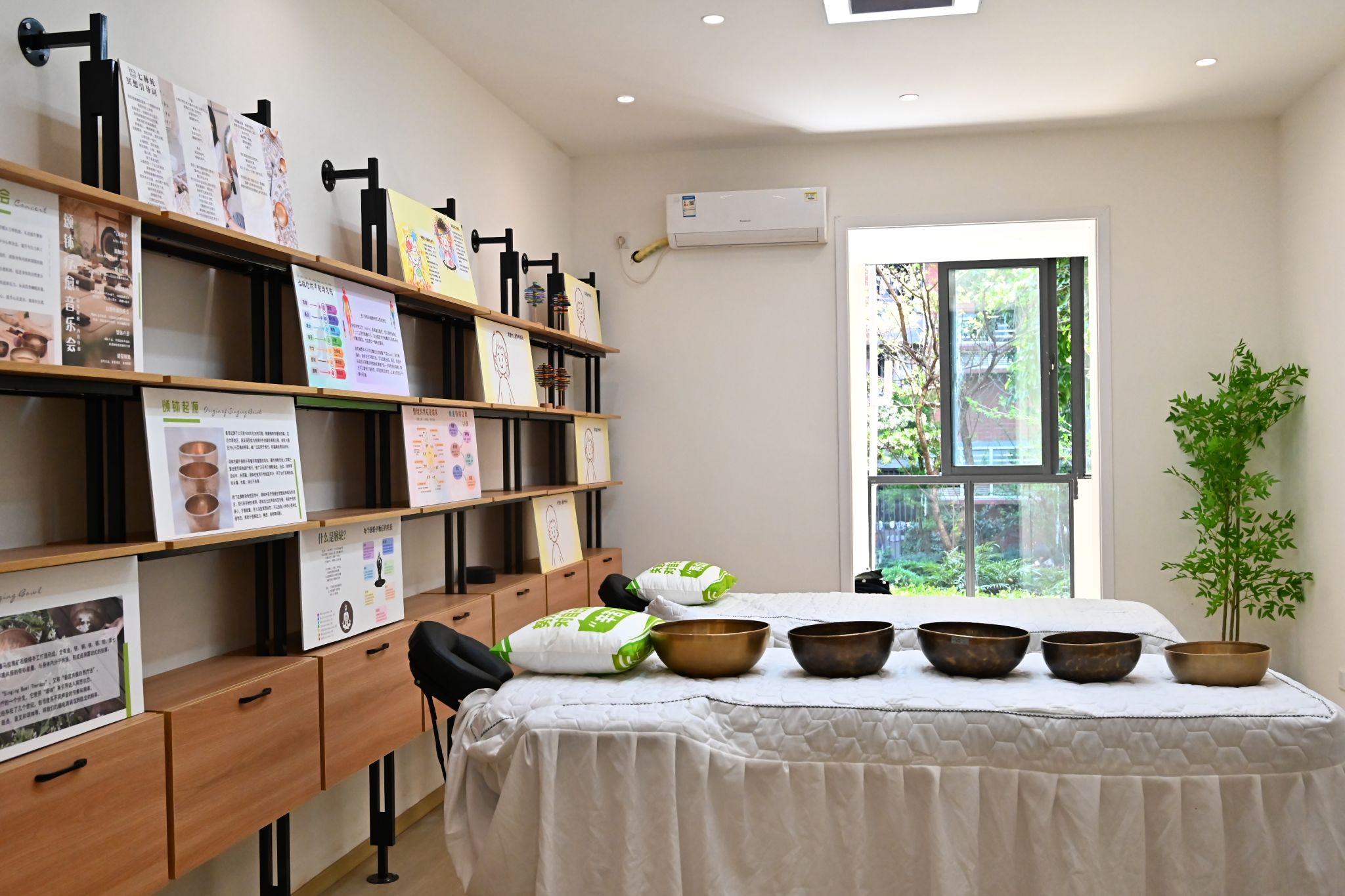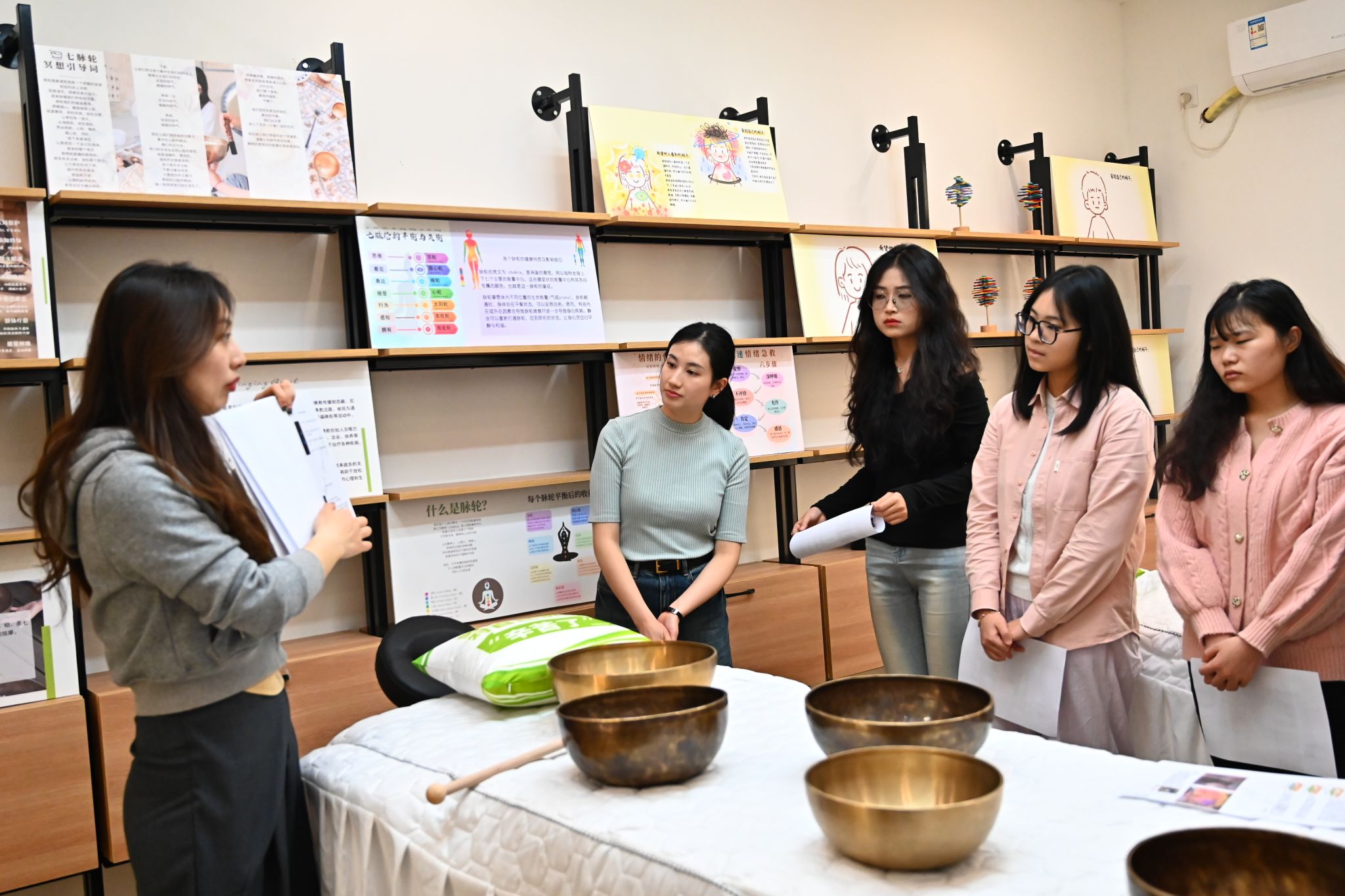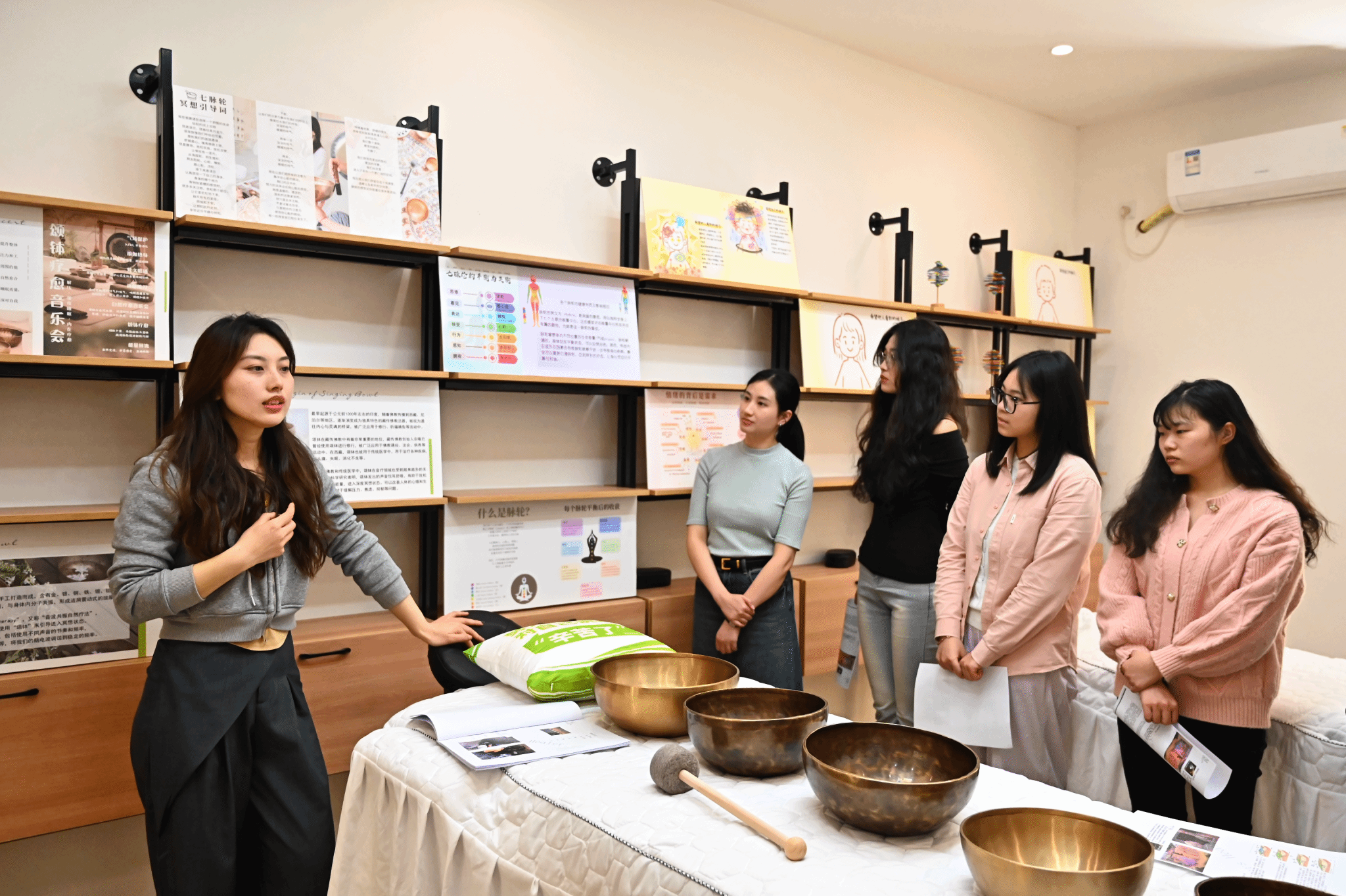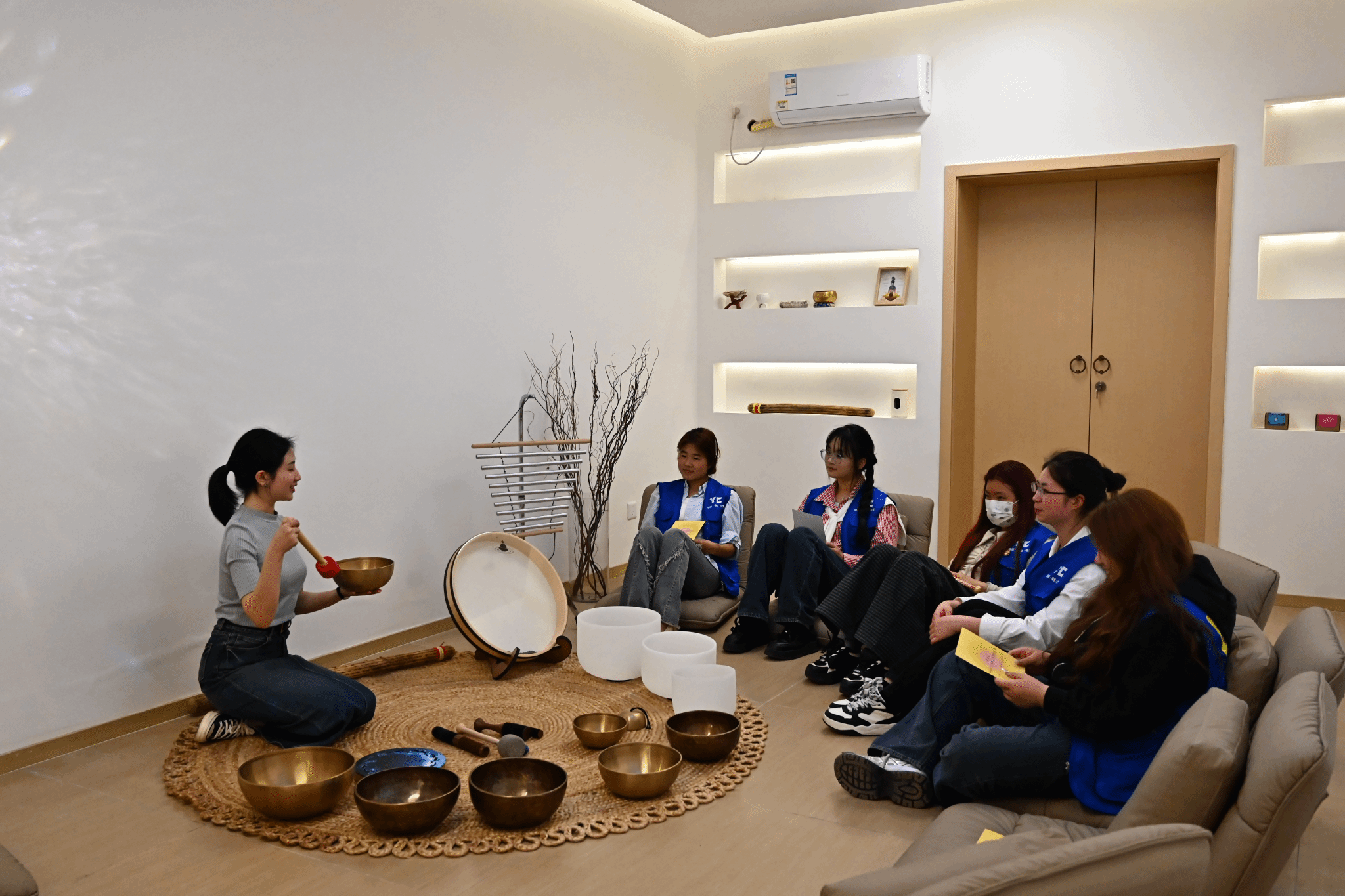 在实践环节,赵晨老师带领学生体验了颂钵疗愈的操作流程,包括如何正确摆放颂钵、选择适合的敲击工具,以及掌握敲击和旋转动作的力度与节奏。她还特别强调了“专注力”的重要性:“在进行疗愈时,专注于声音和振动是关键,这不仅能够帮助自己进入冥想状态,也能为他人提供更有效的支持。”