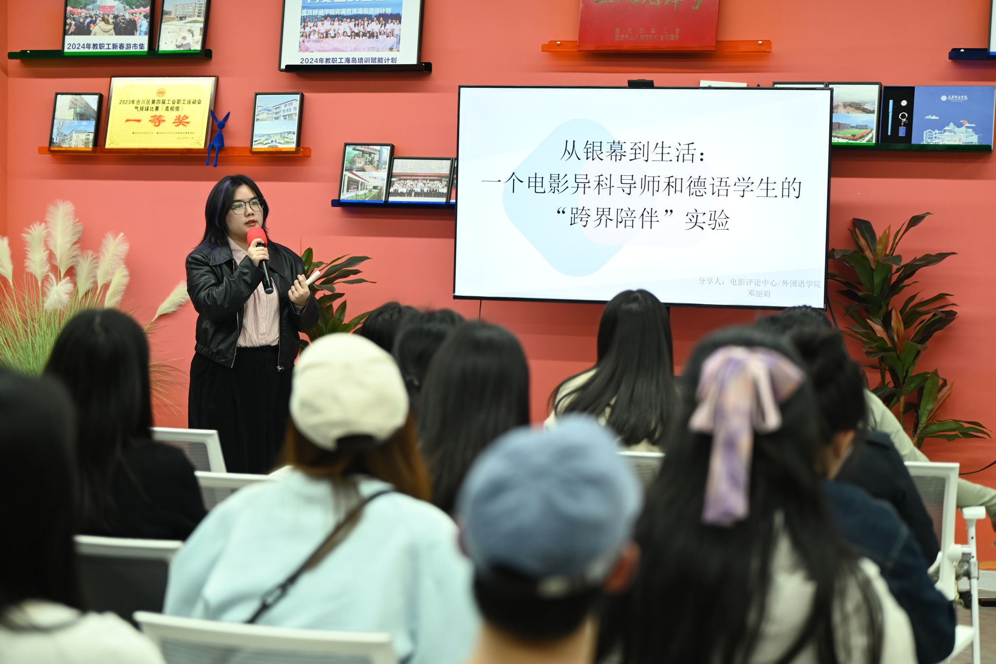 外国语学院、天空书院异科导师代表邓丽娟老师以《从银幕到生活:一个电影异科导师和德语学生的“跨界陪伴”实验》为主题,分享了"德语+电影"双螺旋育人创新实践。通过打破学科壁垒构建教育新范式,她在德语专业培养中融入电影艺术元素,同步强化学生批判性思维与人文关怀。实践中建立"成长档案"追踪机制,借助朋友圈互动、主题沙龙等形式营造轻松育人氛围,构建师生深度互信关系。邓老师表示将持续探索"电影+X"跨学科育人路径,培养突破专业边界、具有多元竞争力的复合型人才。