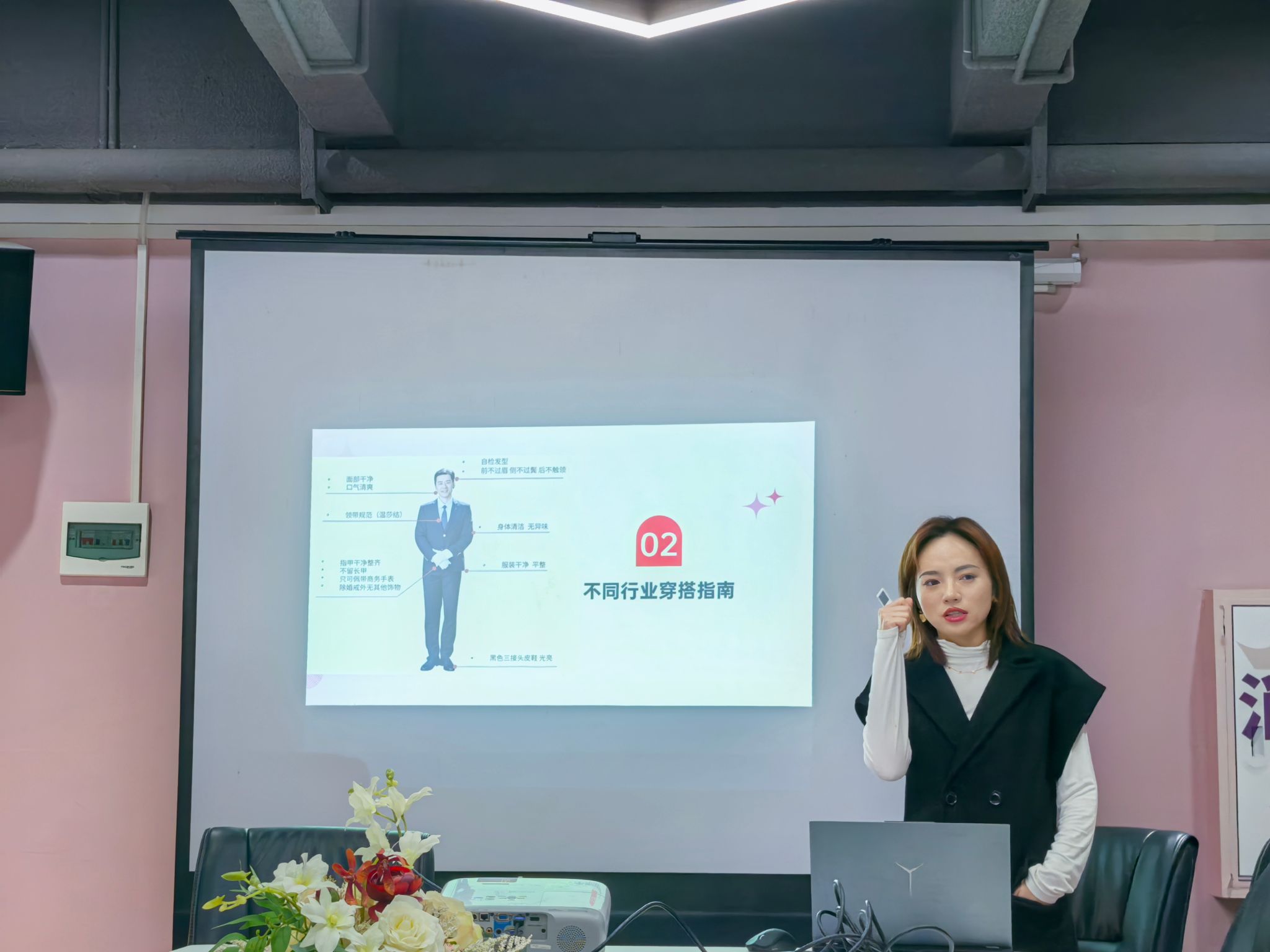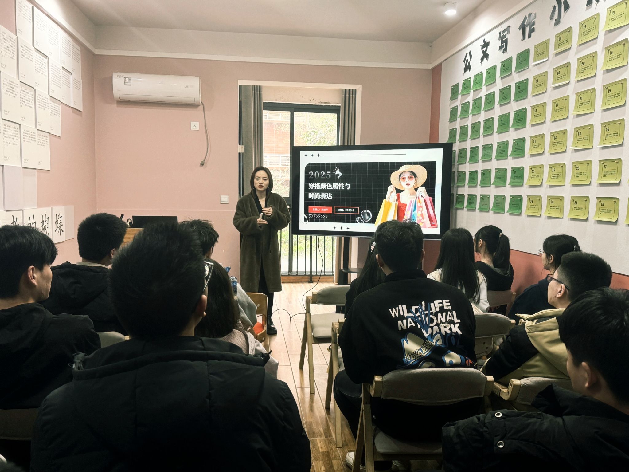 第45期以“色彩密码·面试中的无声表达”聚焦规则与突破的色彩力量。黄丽萍老师以“基础色为基,亮色点睛”为核心逻辑,解析春季面试的色彩平衡法则。她提出:“黑色西装是‘矩’,鹅黄丝巾为‘变’,守矩是尊重职场规则,创新则是对自我魅力的表达。”活动现场,“色彩盲盒”挑战环节引发热烈反响——男生组以墨绿领带搭配浅咖西装,既呼应金融行业的沉稳基调,又以色彩碰撞传递年轻职场人的锐气。学生感慨:“颜色不仅是视觉语言,更是‘知礼’与‘破界’的无声宣言。”