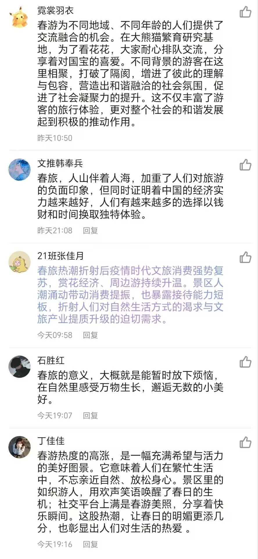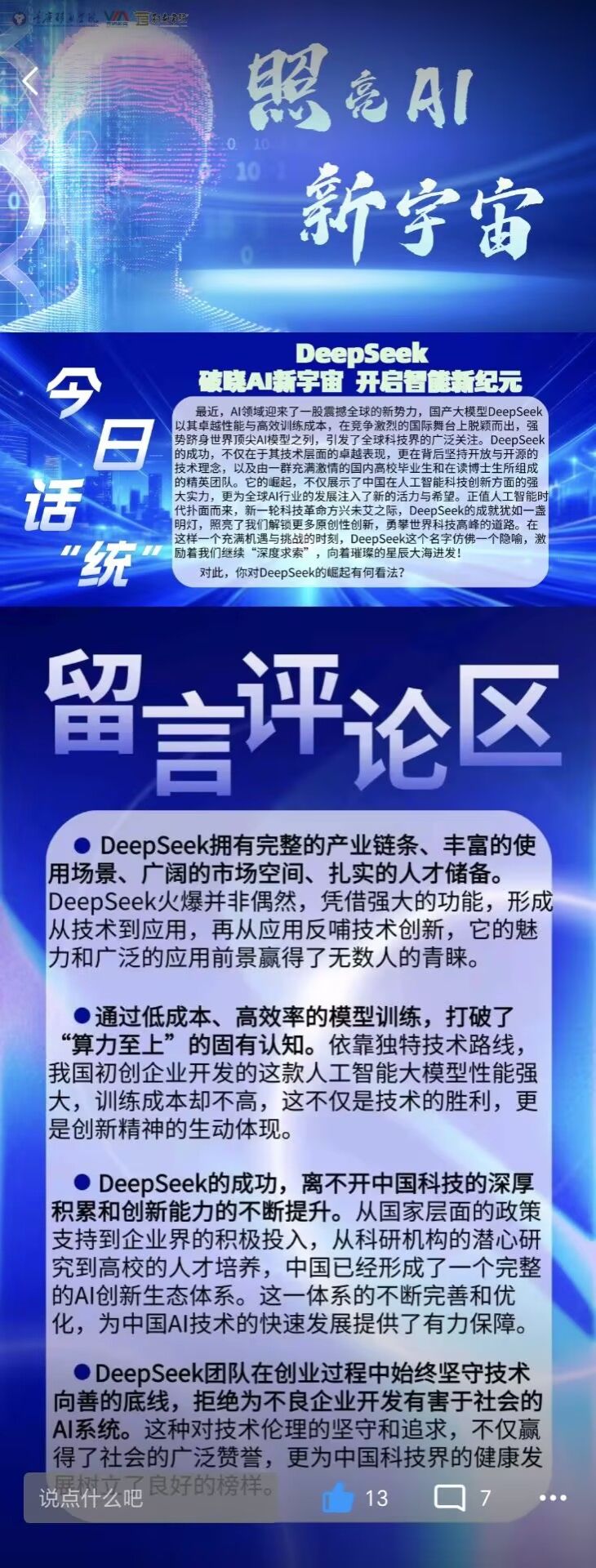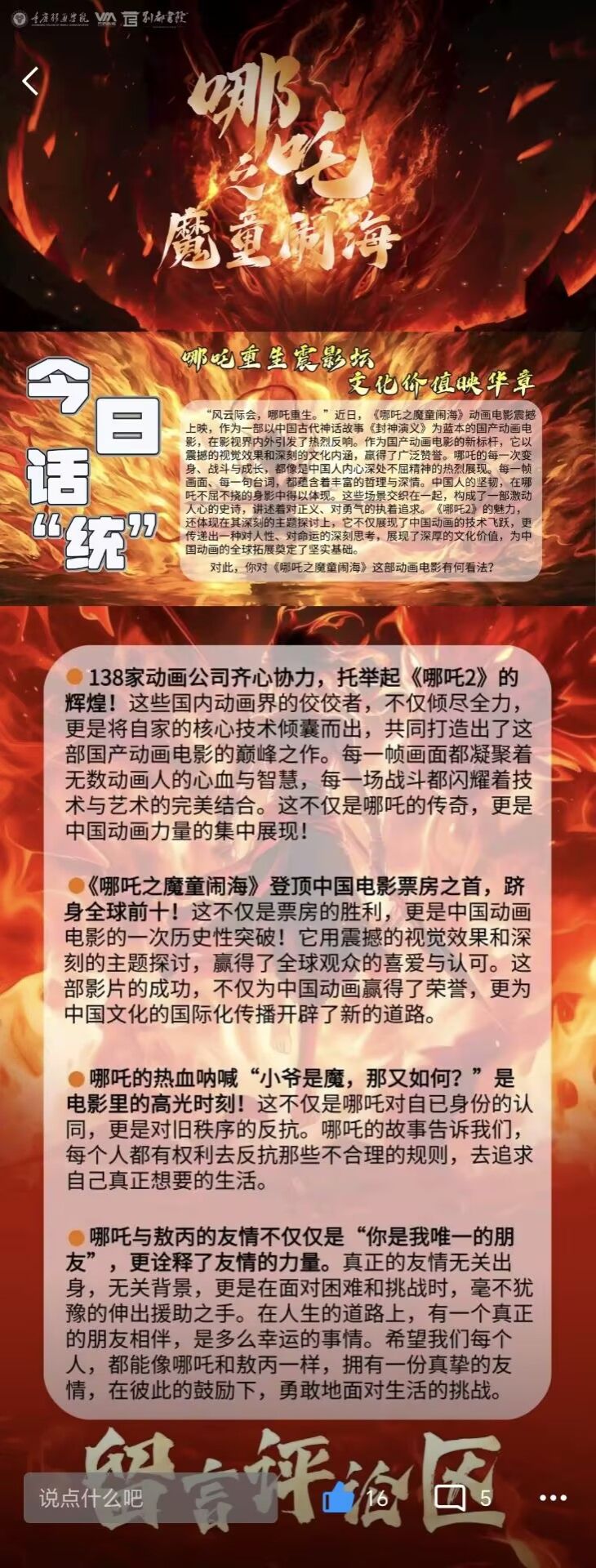 项目将“哪吒电影现象级传播”“春秋假制度争议”等热点事件转化为思维训练场。当同学们就“哪吒电影靠什么冲顶”展开唇枪舌战,在“增设假期利弊”的辩论中碰撞观点,看似娱乐化的热点悄然转化为培养辩证思维的实训场。评论互动中,书院特别注重“自我思维和想法的表达”,通过正面的导向,帮助学生在言语表达中梳理逻辑,提升论证能力。