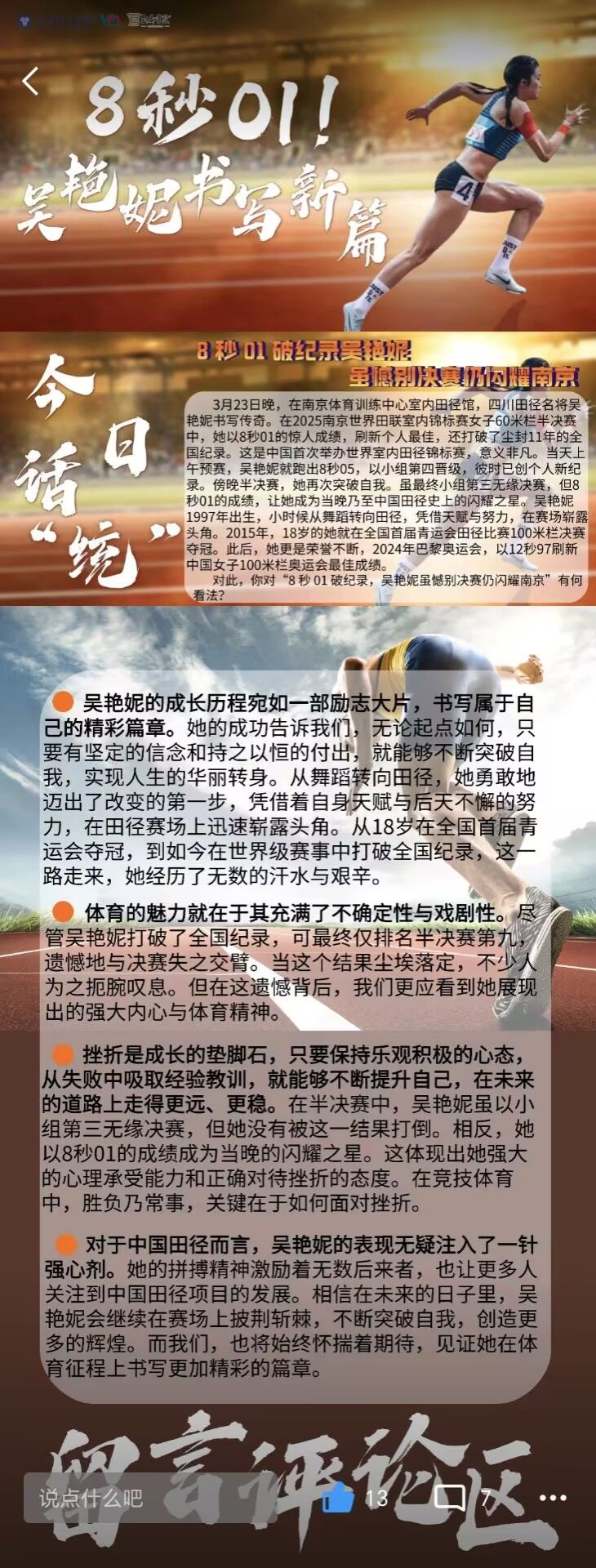 项目巧妙运用新媒体矩阵,将“农民诗人吕玉霞”“载人飞剑黑科技”等看似遥远的社会热点,转化为青年学子可感知的生活切片。吕玉霞剁地瓜干写诗的画面与苏东坡诗词形成跨时空对话,让“文化传承不分阶层”的内涵具象化;实体海报上“8秒01”的鲜红数字与吴艳妮跨栏的瞬间抓拍,则打破竞技体育的遥远感,使“突破自我”的体育精神变得可触摸、可共鸣。这种“热点故事化、故事场景化”的传播策略,有效拓宽了书院学子的认知半径,使大家得以窥见乡村振兴、科技创新等国家战略的生动实践。