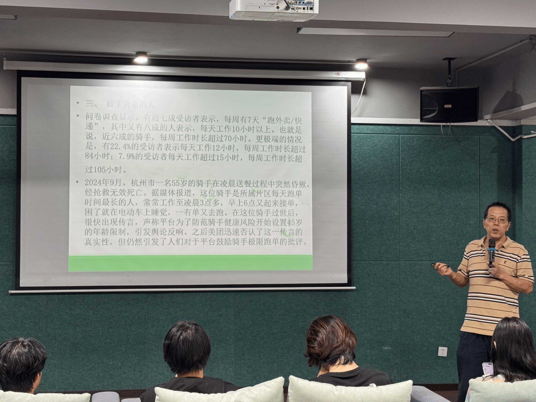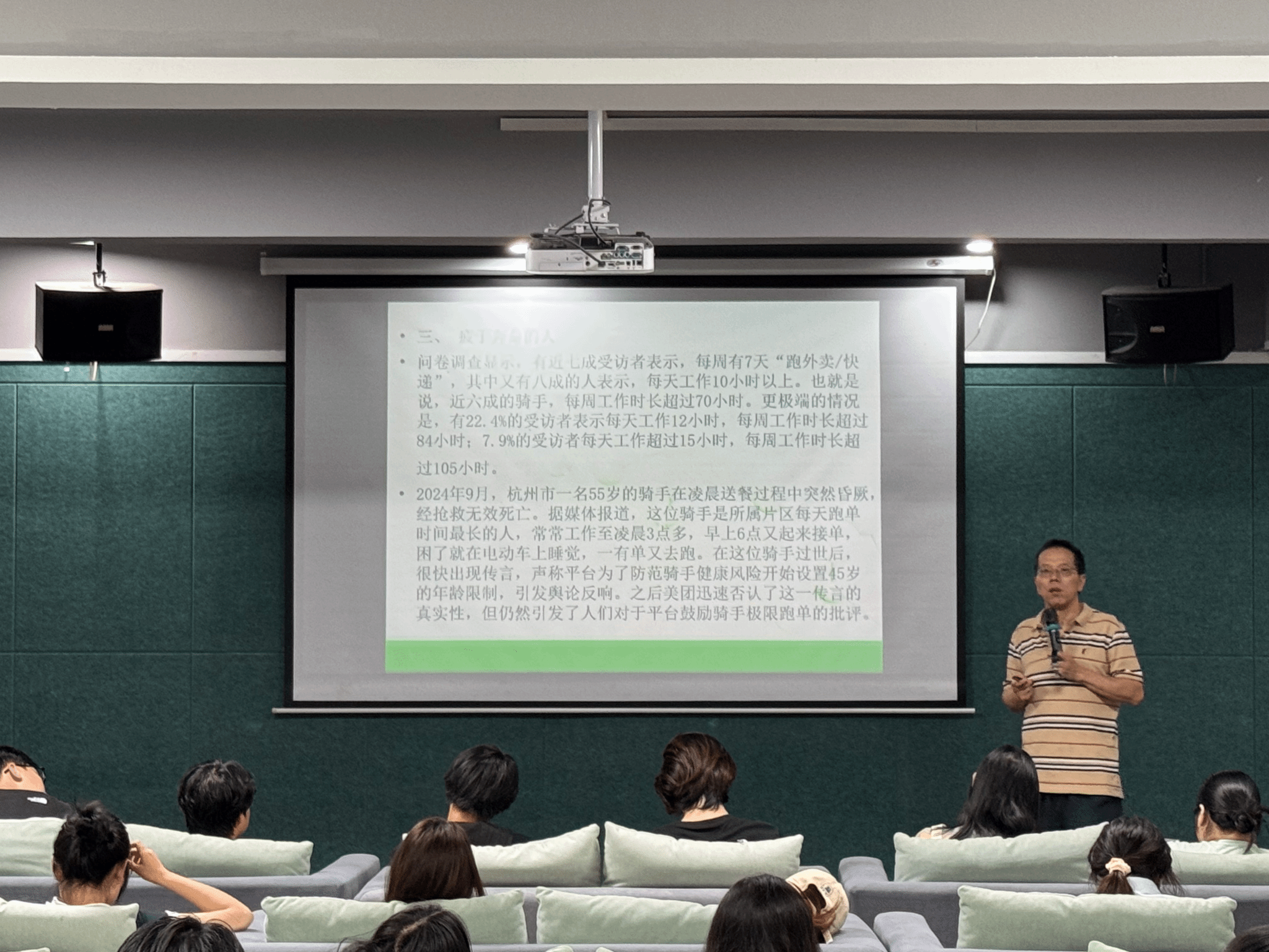 在数字经济蓬勃发展的当下,外卖骑手作为城市运转的“毛细血管”,其生存现状与权益保障日益成为社会关注的焦点,4月18日,林克勤院长以“外卖骑手:时代造就的特殊群体”为题,带领师生透过这一新兴职业群体的生存博弈,剖析数字时代的职业困境与社会责任,助力学生打破信息茧房,深化专业认知,明确学习方向。