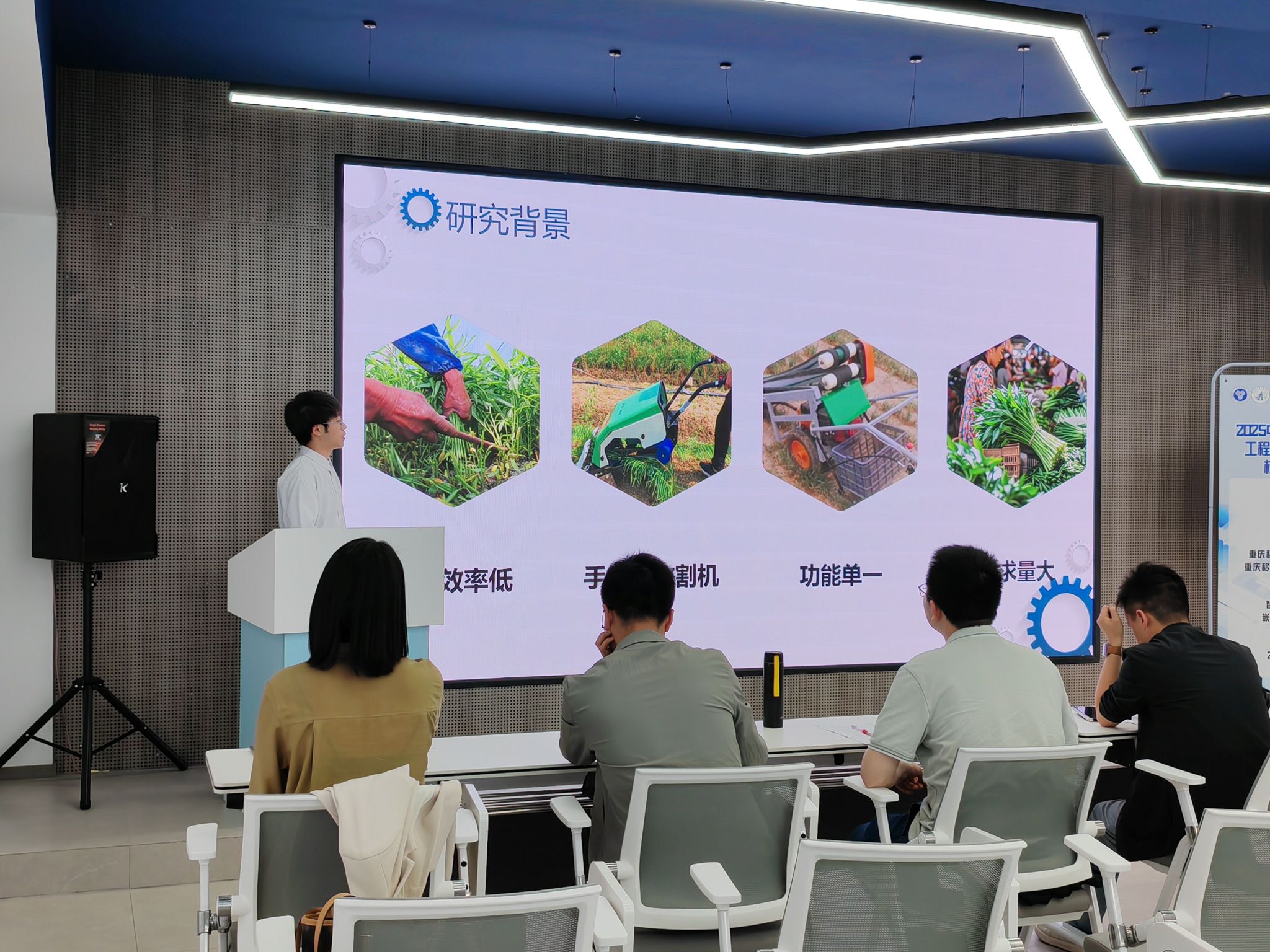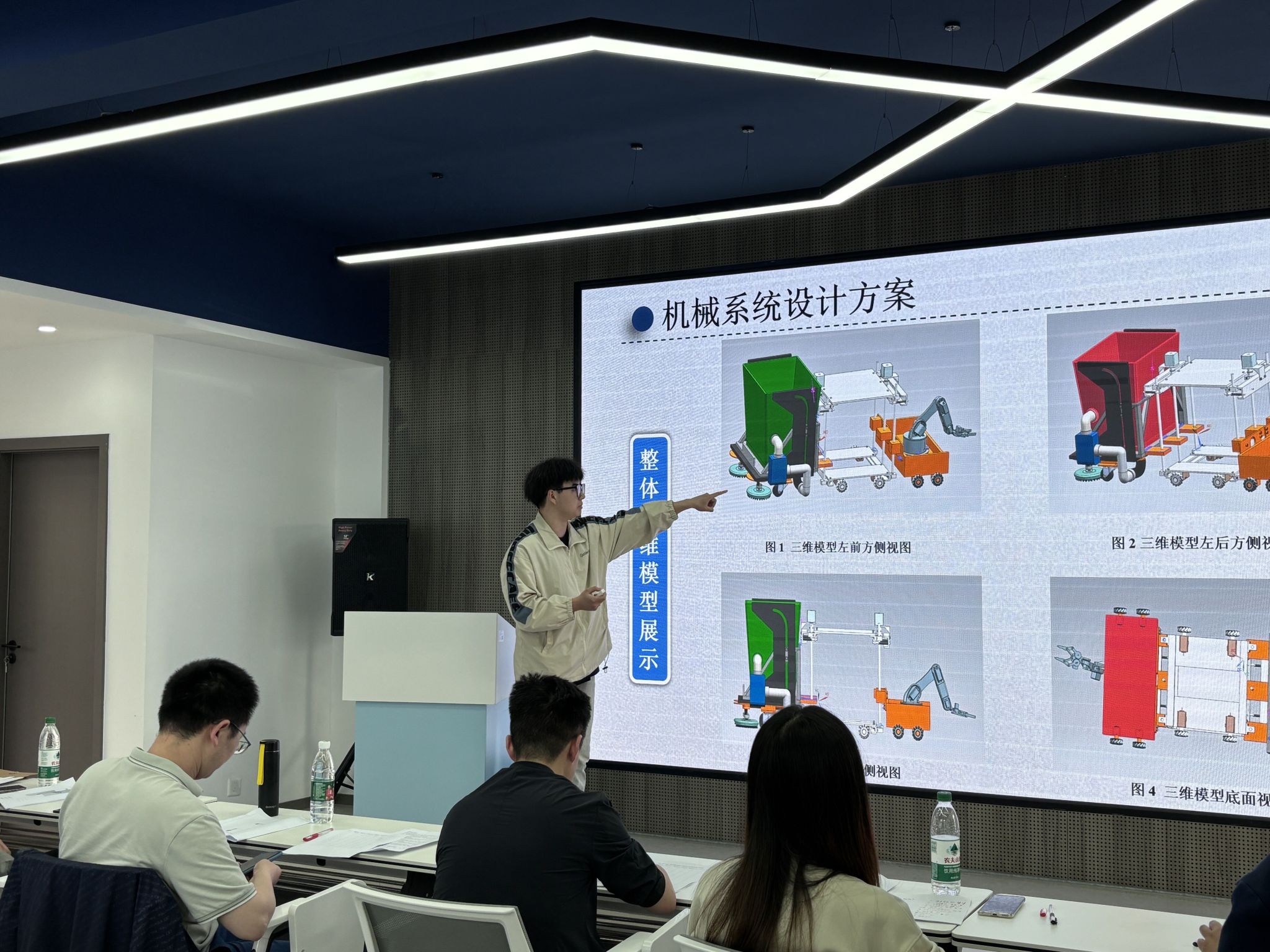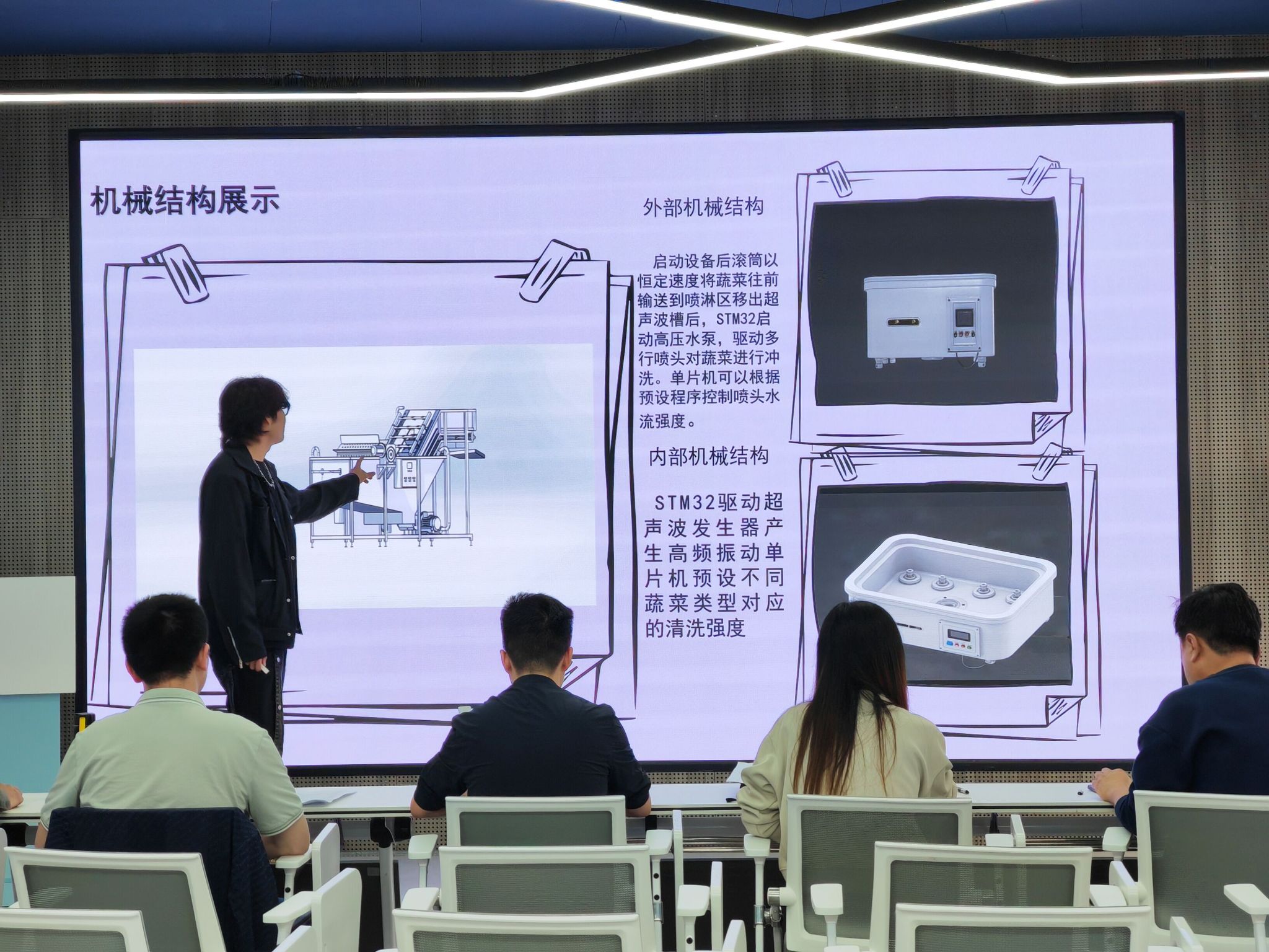比赛当天,30支队伍依次登台,通过作品展示的精心呈现、答辩陈述的激情演绎,以及实物操作的现场验证,每一支队伍都向评审团展现了他们多元化的创新智慧,犹如一幅幅生动的科技画卷,缓缓展开。此次参赛作品涵盖农业机器、农产品清洗设备、工业设备、消防辅助无人机、自主设计等领域,充分体现了学生对机械技术与社会需求的深刻洞察。