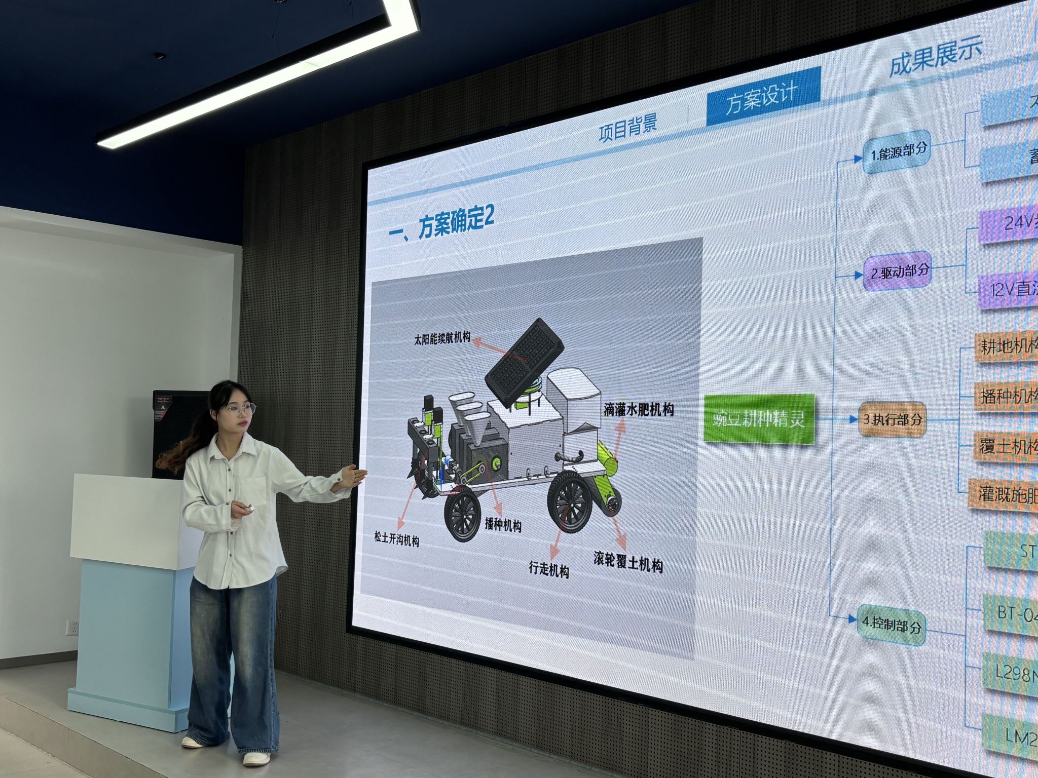 “我们的作品,灵感源自于土豆收获的艰辛。”来自“智创未来”队的熊茜同学,在答辩台上娓娓道来,“面对人工收获的种种难题——劳动强度大、效率低下,我们团队决定用科技的力量去改变这一切。于是,模块化设计应运而生,挖掘、传输、分拣,每一个模块都如同积木般可以独立拆装,既方便了维护,又降低了维修成本,让科技真正服务于农业,让收获变得轻松高效。”正是这份对创新的执着与努力,让“智创未来”队在众多队伍中脱颖而出,荣获一等奖。赛后,熊茜同学感慨万千:“回顾备赛历程,无数个日夜我们都在为完善项目而努力,从最初创意的萌芽,到反复修改方案时的迷茫与纠结,每一步都充满艰辛,这次获奖,不仅是对我们项目的肯定,更是对团队协作精神的褒奖。大家分工明确又紧密配合,创意构思,画图建模,动画仿真,最后展示汇报,这次经历让我们明白,创新需要大胆想象,更需要脚踏实地的努力;成功离不开个人的拼搏,更依赖团队的力量。未来,我们会带着这份热爱与信念,在创新的道路上继续前行,迎接更多挑战。”
