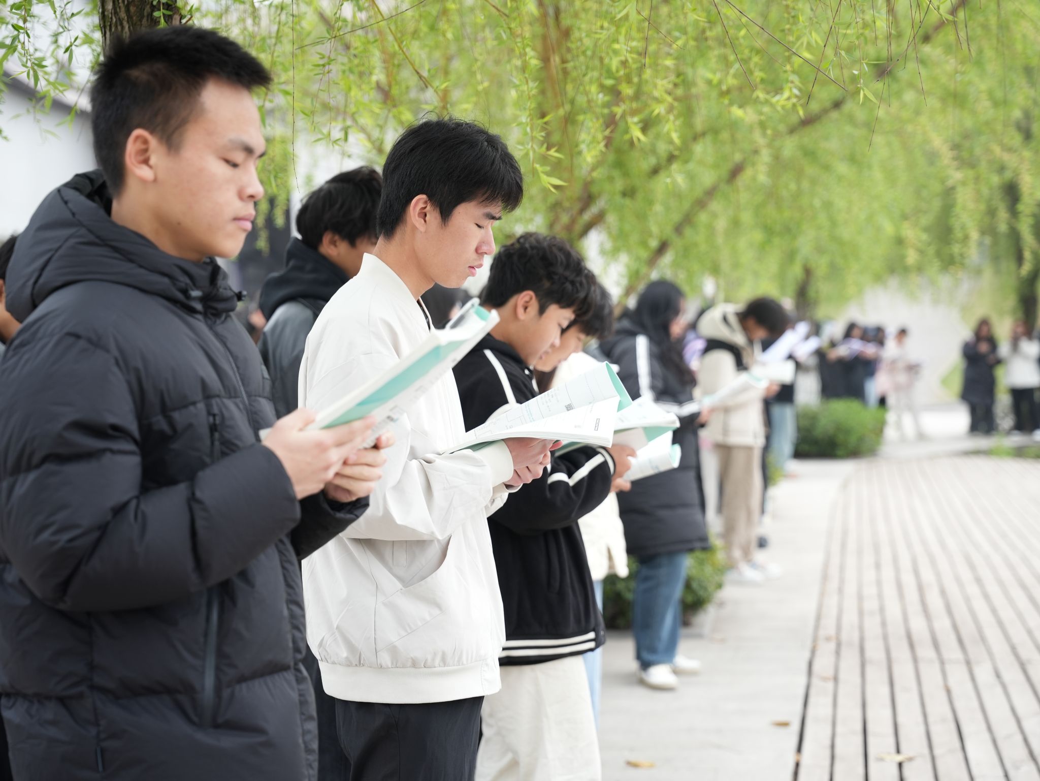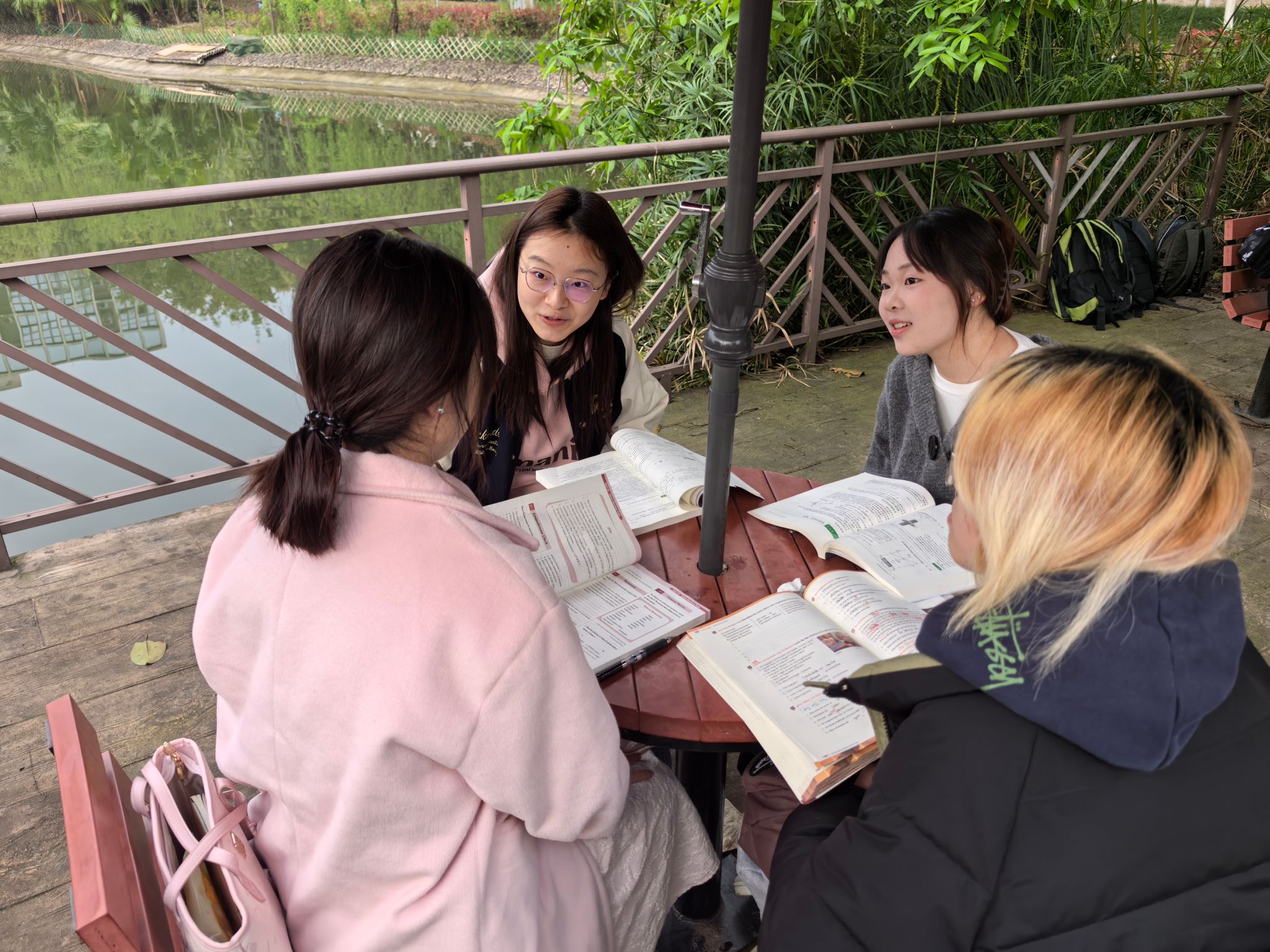 红鲤在湖中徜徉,时时浮出聆听,清风徐徐吹来,湖面波纹粼粼荡开,伴随着同学们对知识的热忱,四十分钟的时间在沙沙翻页声悄然度过。有人在书本里汲取丰富的知识,有人则细细品味其中的韵律。不同封面的书籍在青石与湖畔间流转,学子们或垂眸沉思时睫毛在眼下投出蝶翼般的影,或抬眼交流时眼底跃动着求知的星火,让晨读时光在书页翻动的窸窣声里,成了神态各异却同样明亮的求知剪影。她们讨论着书中提及的趣闻轶事,分享着各自所得到的经验,此刻,暂聚一堂的同学们,成为了素未谋面但却相见恨晚的知己,共同徜徉在知识的海洋。